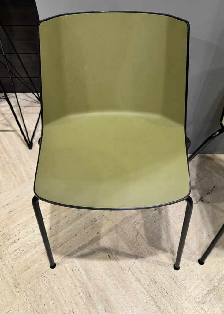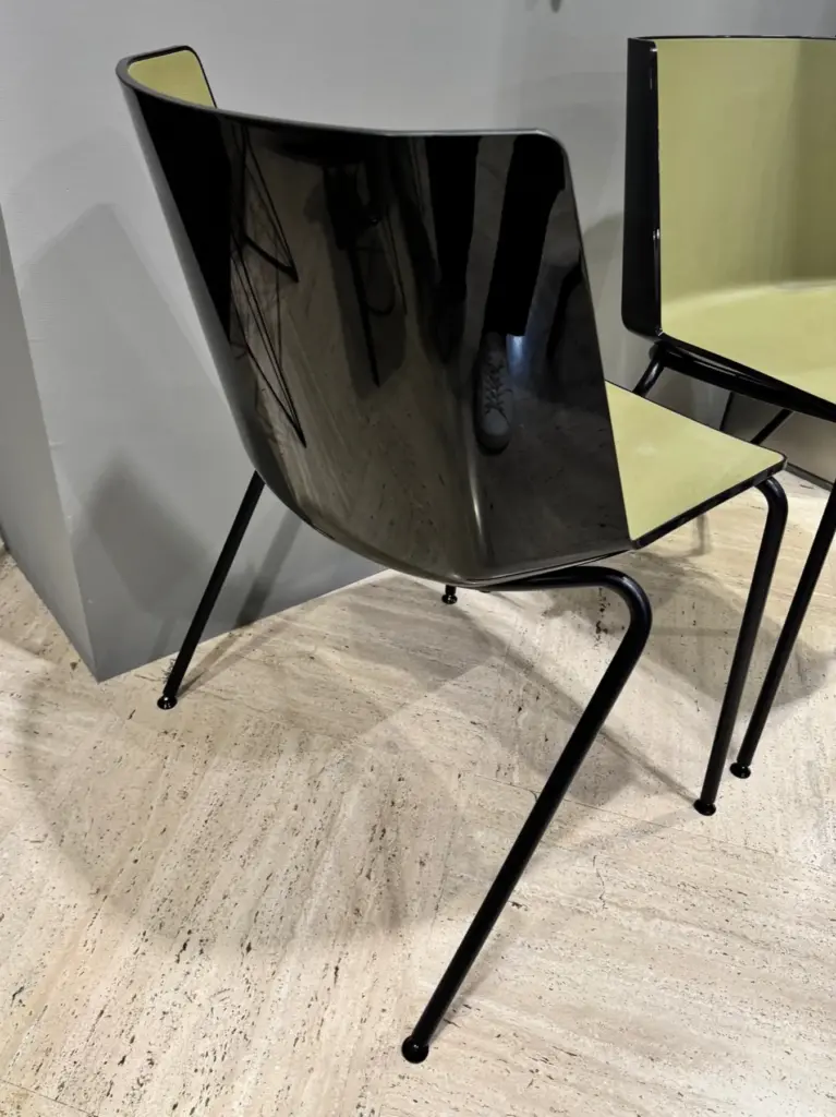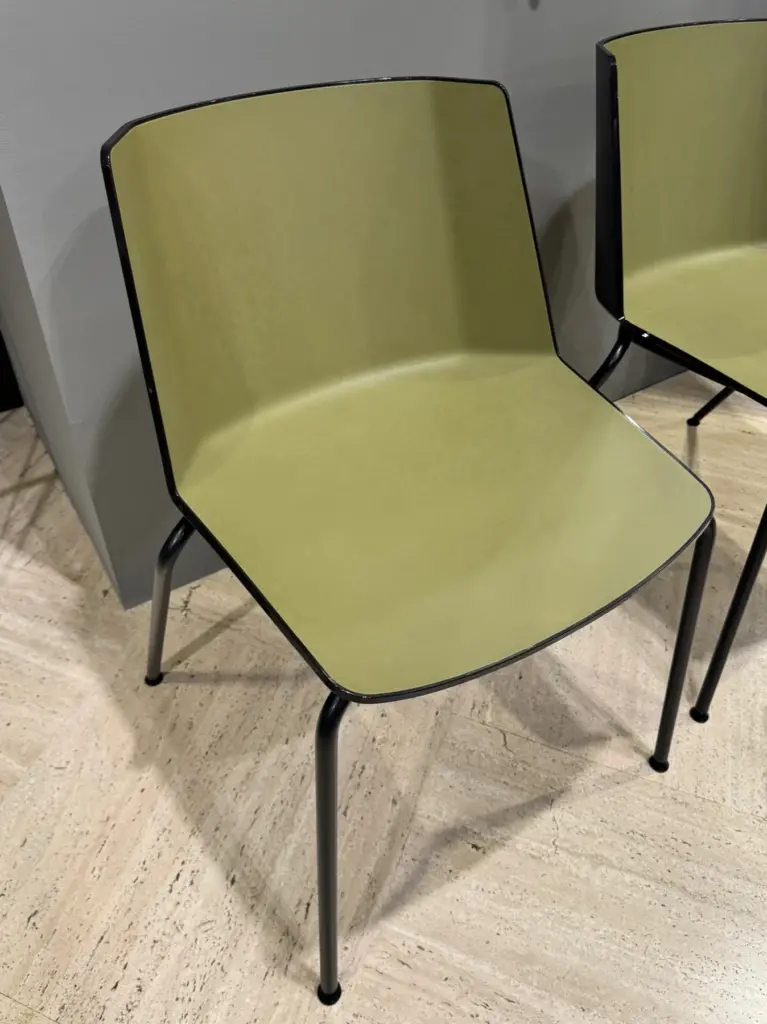 Realizzata in polipropilene bicolore attraverso un processo di stampaggio ad iniezione, la Sedia Aiku presenta una duplice finitura che ne esalta l'estetica unica. La scocca esterna lucida nei colori bianco e nero conferisce un aspetto moderno, mentre la scocca interna con texture effetto “saffiano” opaco in diversi colori aggiunge profondità e carattere al design complessivo. Le gambe in finitura goffrato opaco grafite offrono stabilità, complementando perfettamente la struttura lucida della scocca. La seduta verde opaco introduce un elemento di colore che vivacizza qualsiasi ambiente, rendendo la Sedia Aiku ideale per spazi moderni e sofisticati.