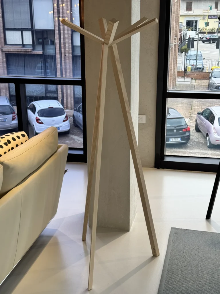 - Struttura: Realizzato in massello di frassino, l'appendiabiti รจ caratterizzato da una base con gambe a sezione romboidale che gli conferiscono una solida stabilitร . I rami sono inclinati e presentano un taglio all'estremitร per una presa ottimale degli indumenti.