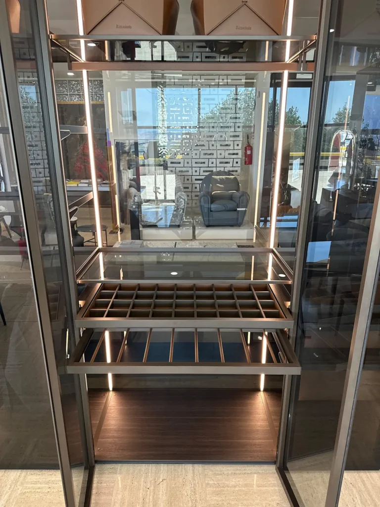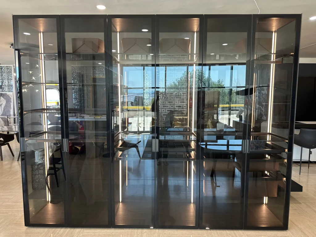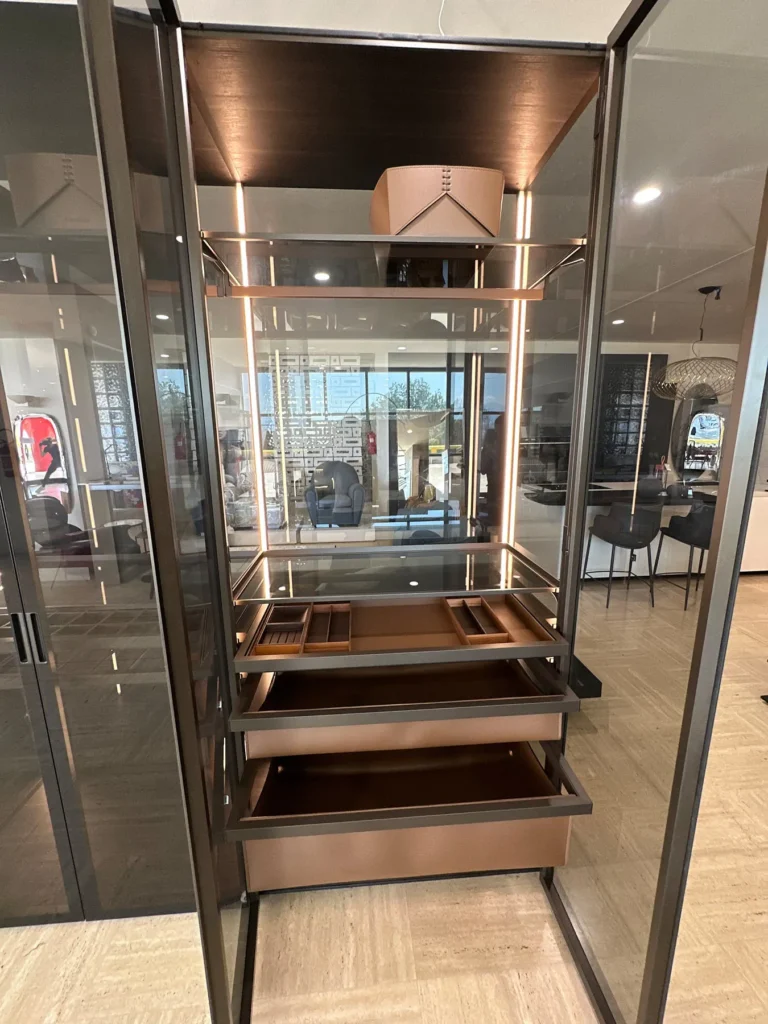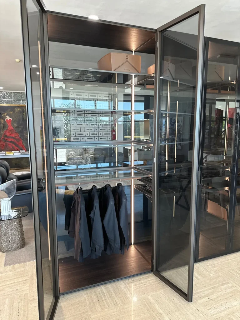 La struttura รจ realizzata in alluminio di alta qualitร , con una finitura in Platino, l'armadio รจ progettato per durare nel tempo e garantire una robustezza senza eguali. Il vetro grigio trasparente delle ante e dei fianchi laterali aggiunge un tocco elegante.ย La versione in offerta dispone di 6 ante in vetro grigio, con schienali perfettamente rifiniti, ideale per configurazioni interparete, cabine armadio o altri ambienti di servizio. L'Armadio Cover Freestanding รจ dotato di un'ampia gamma di accessori interni, tutti progettati per offrire massima funzionalitร e flessibilitร tra cui i portabiti per una comoda disposizione dei capi d'abbigliamento, i ripiani estraibili con portapantaloni, cesti alti e bassi per l'organizzazione efficiente dello spazio, deiย ripiani in vetro con accessori in cuoio finitura Argilla, che aggiungono un tocco lussuoso ed infinine l'illuminazione interna a LED integrata, che assicura una perfetta visibilitร e valorizza ogni dettaglio dell'armadio.ย Grazie alla sua struttura modulare e all'assenza di viti a vista, il Cover Freestanding รจ estremamente facile da installare e da personalizzare, garantendo un ordine impeccabile e uno stile contemporaneo in ogni cabina armadio.