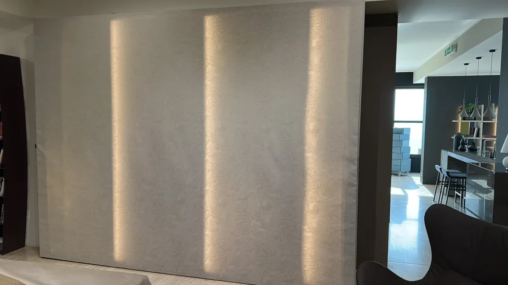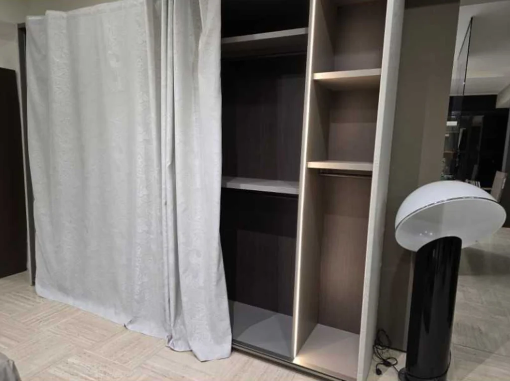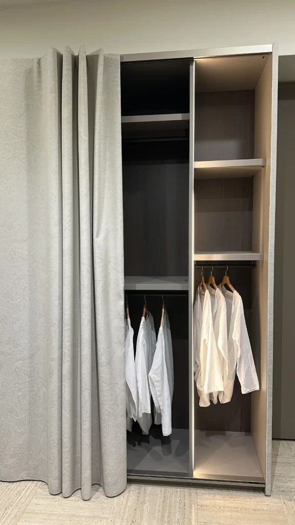 - La vera innovazione sta nell'uso di un tessuto teso che sostituisce le tradizionali ante, creando un effetto visivo di una parete tessile che scompare nel design dell'ambiente.