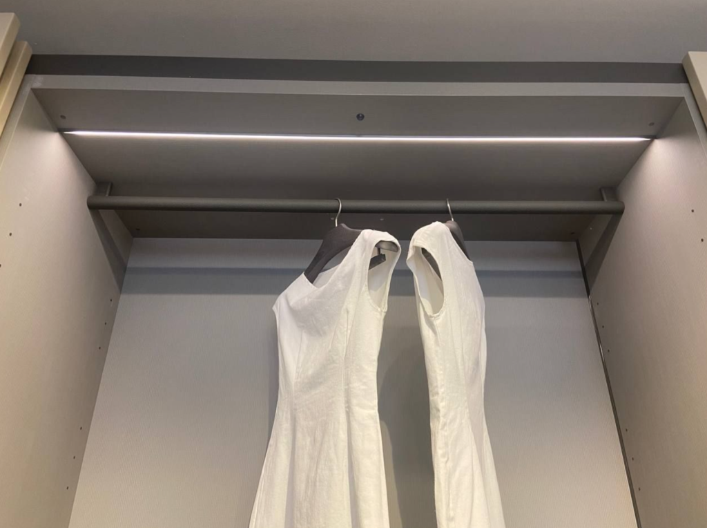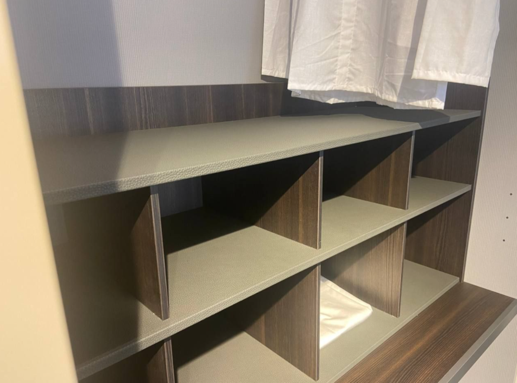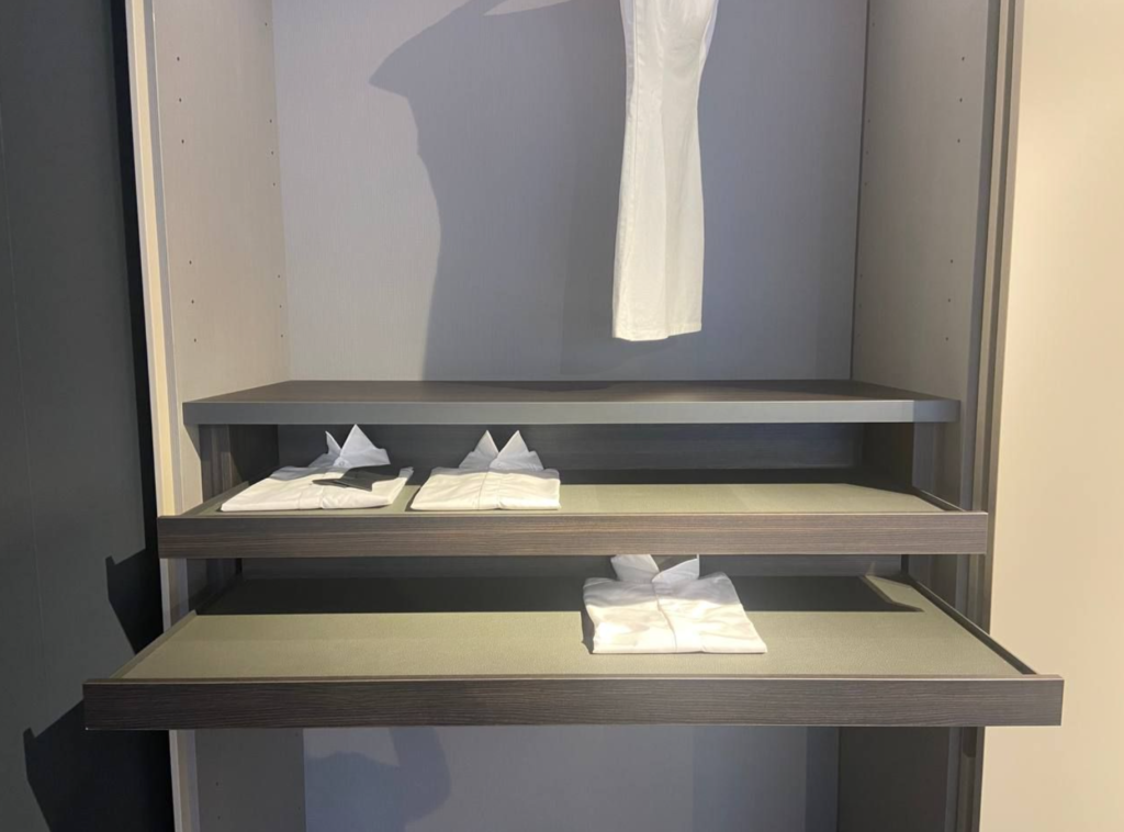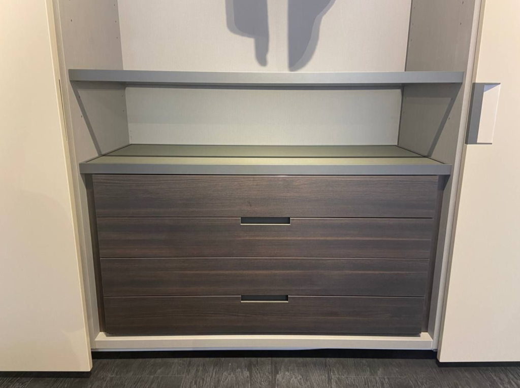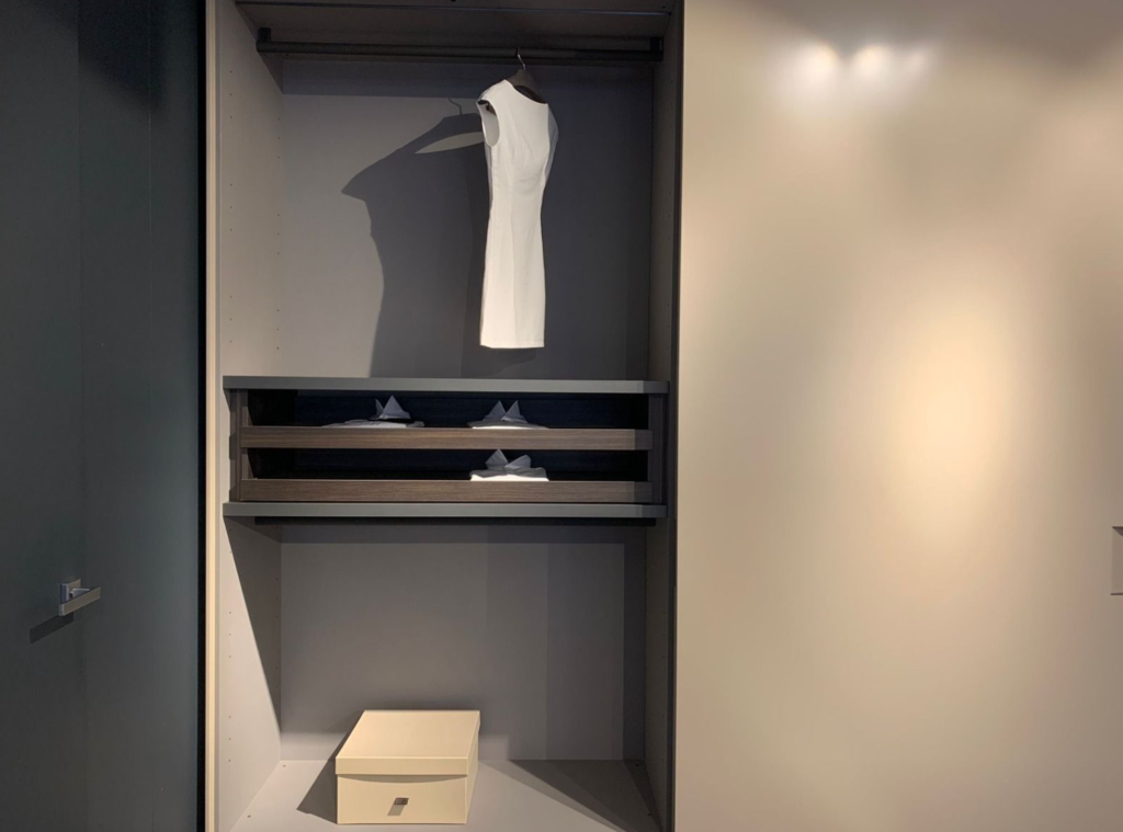 Dotato di illuminazione a LED integrata, l'interno dell'armadio รจ sempre ben visibile, valorizzando ogni dettaglio degli abiti e degli accessori riposti. Tra le soluzioni di stoccaggio spiccano la cassettiera centrale, il porta borse e il porta camicie estraibile in Rovere Spessart e pelle colore Elef, che uniscono praticitร e stile. Le aste appendiabiti e i ripiani in Rovere Spessart, inclusi un ripiano in vetro fumรจ, completano il design, garantendo ampio spazio per mantenere tutto in perfetto ordine.