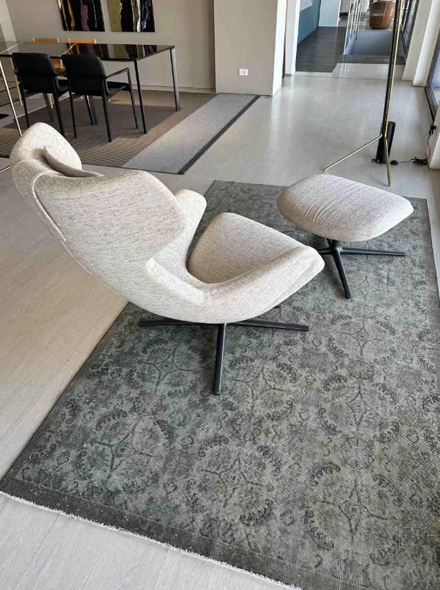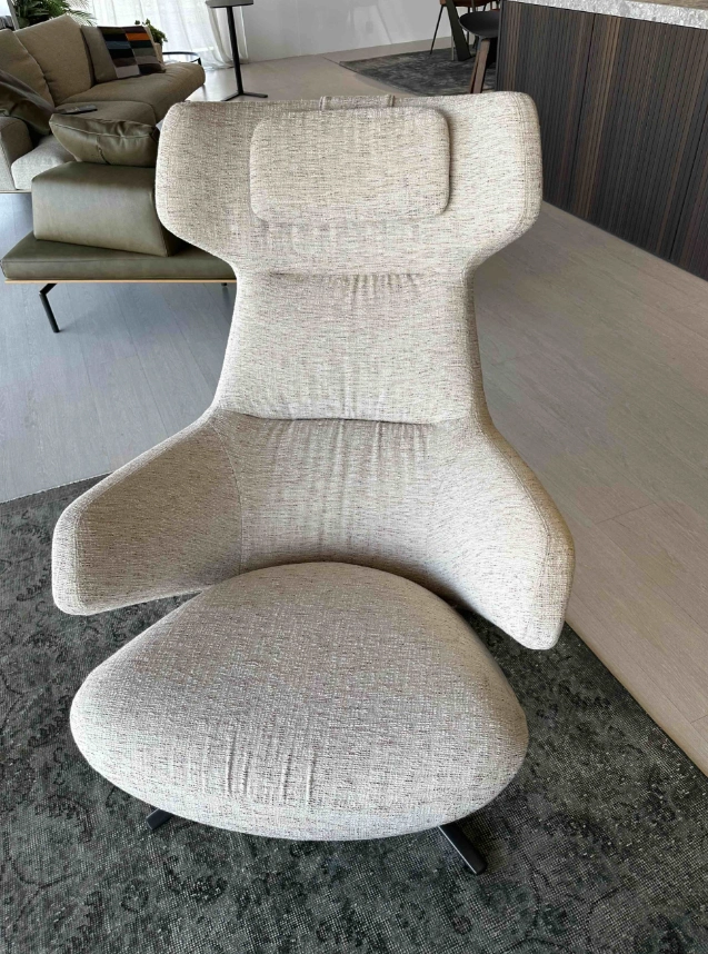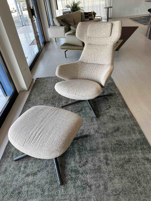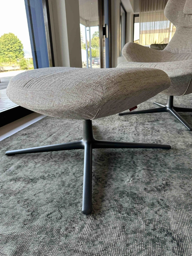- Pouf coordinato: Il poggiapiedi, con base a 4 razze in alluminio lucido, si abbina perfettamente alla poltrona, offrendo un supporto aggiuntivo per il massimo relax.