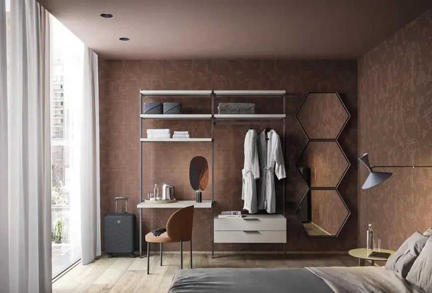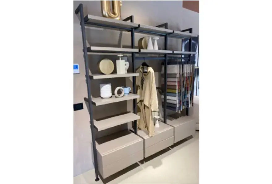In questa configurazione, la cabina armadio รจ proposta con montanti a parete in finitura moka shine, mentre gli elementi contenitivi presentano una raffinata laccatura opaca color juta. Lโinsieme crea un effetto elegante e ordinato, perfetto per ambienti moderni e sofisticati.