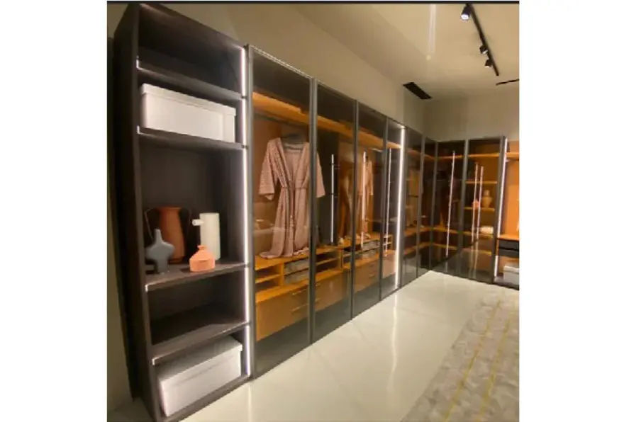 La cabina armadio include inoltre un vano a giorno con quattro ripiani, ideale per organizzare e valorizzare capi e accessori. A completare la configurazione, รจ prevista una dotazione completa di accessori funzionali, pensati per ottimizzare spazio e illuminazione.