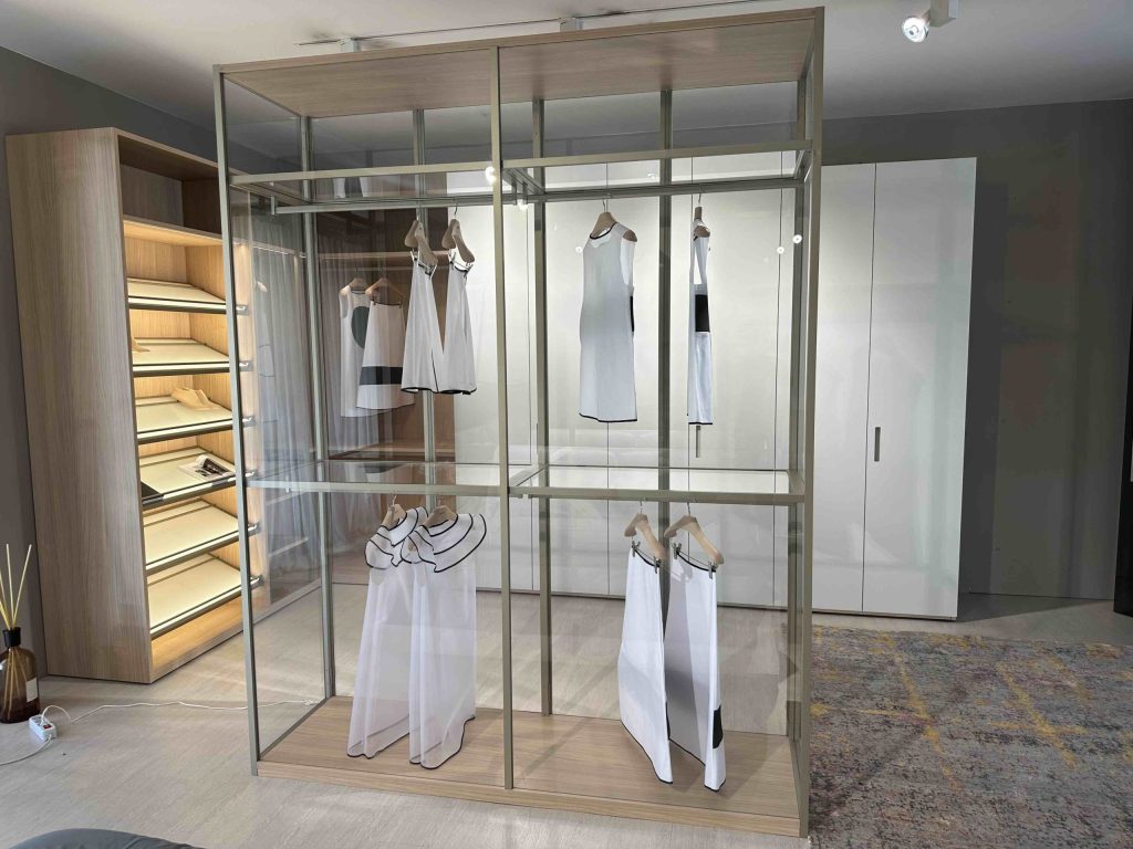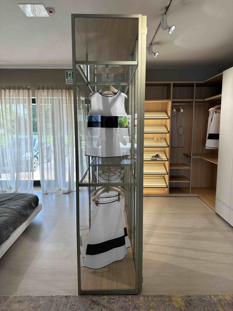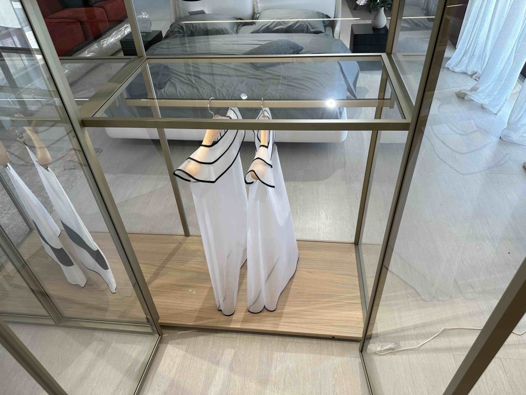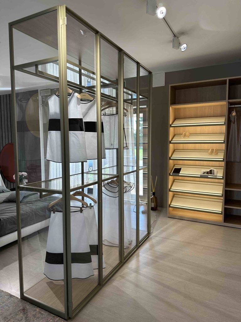 - Composizione angolare a C: Perfetta per creare una dressing room con unโatmosfera lussuosa, alterna moduli chiusi con ante Iron in cristallo trasparente e profilo in metallo effetto ferro a sezioni a giorno per un look dinamico.