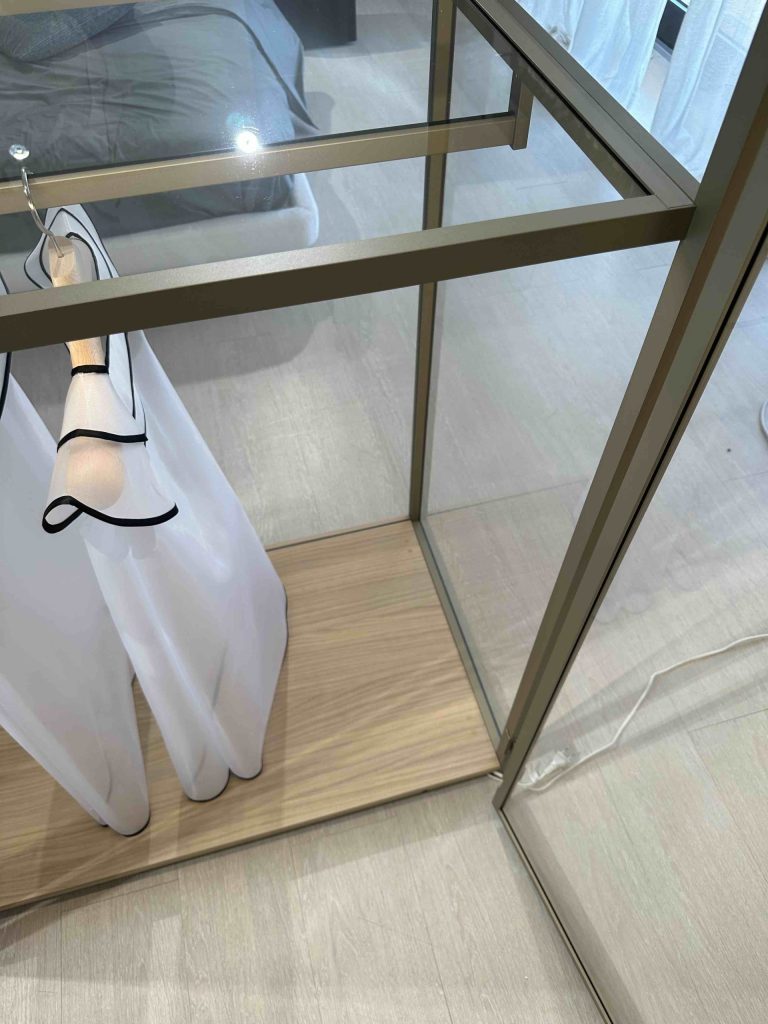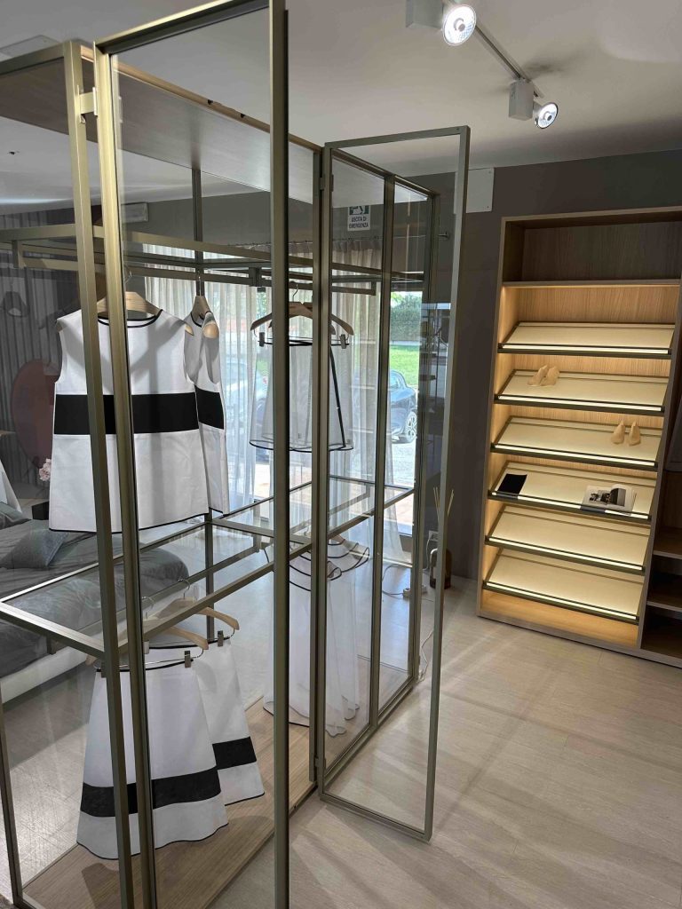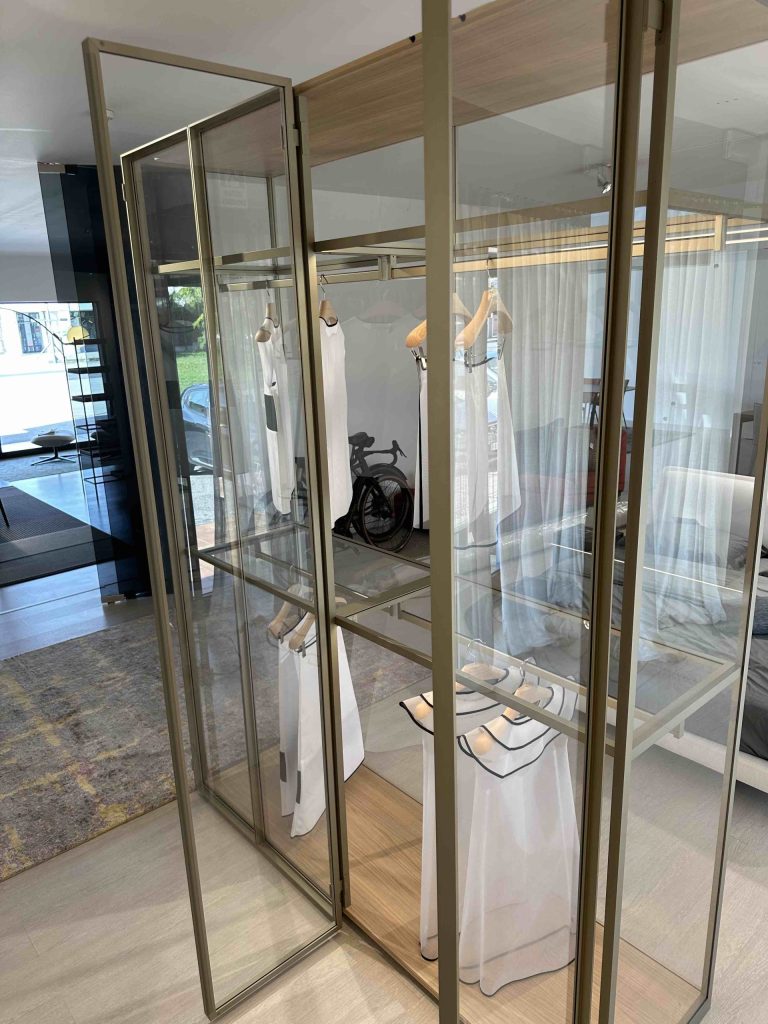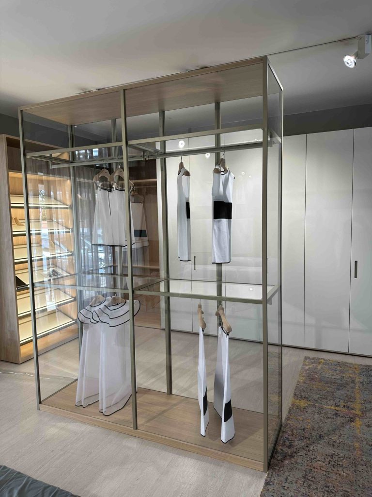 - Composizione angolare a C: Perfetta per creare una dressing room con unโatmosfera lussuosa, alterna moduli chiusi con ante Iron in cristallo trasparente e profilo in metallo effetto ferro a sezioni a giorno per un look dinamico.