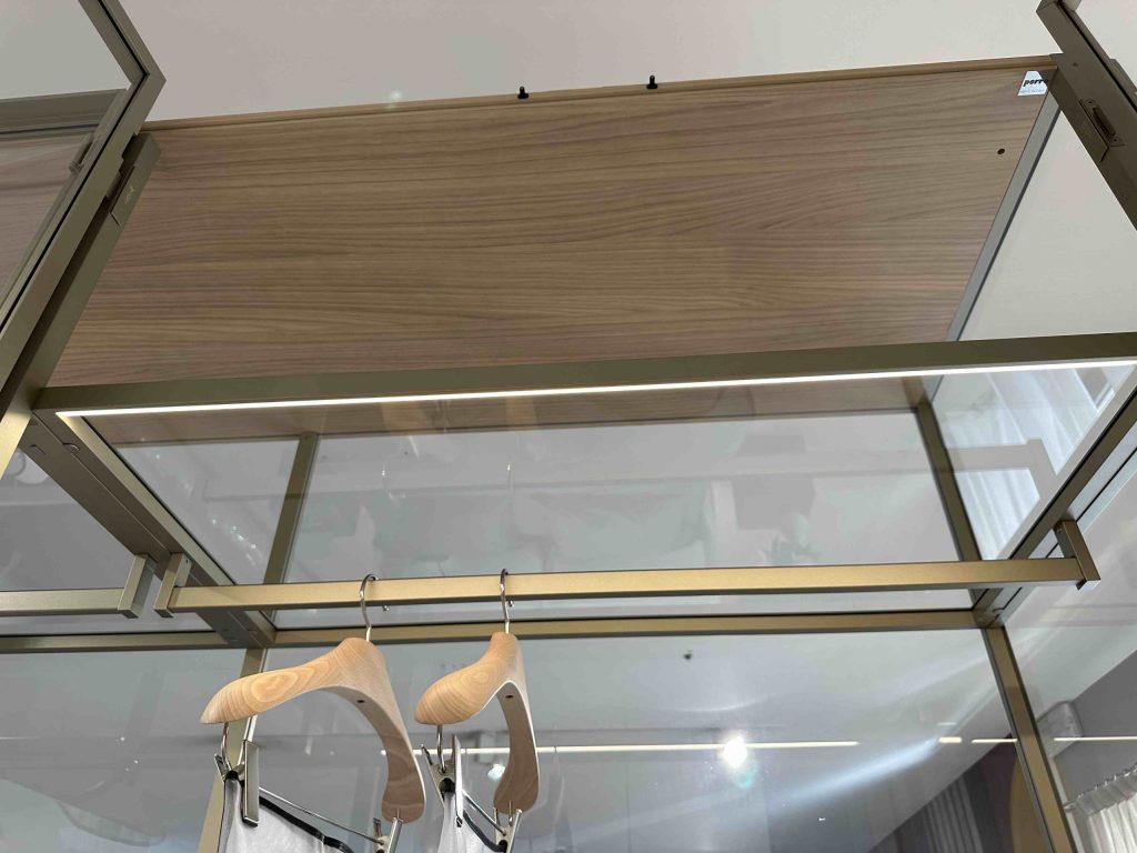 - Scarpiera integrata: Moduli con ripiani luminosi inclinati, ideali per organizzare calzature in modo elegante e accessibile.