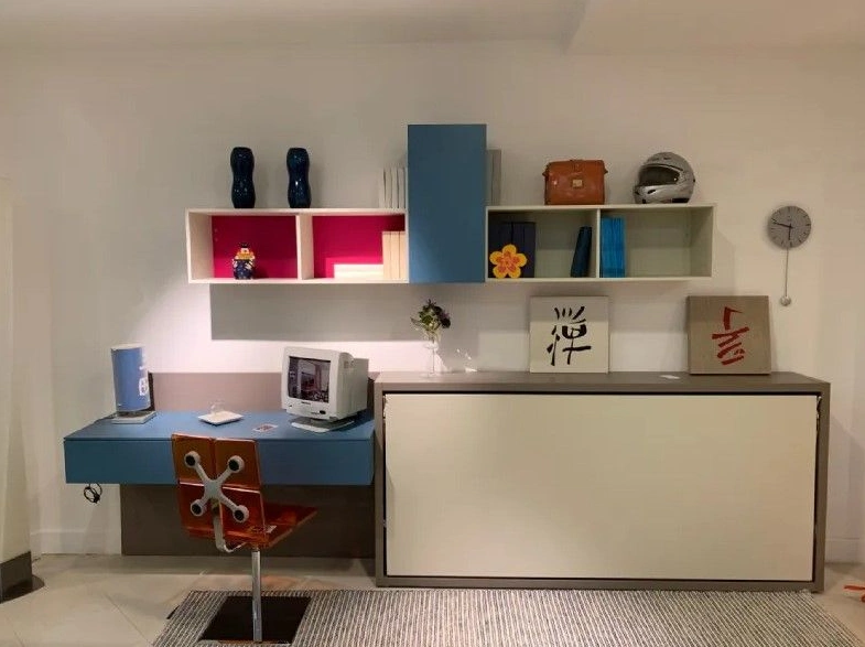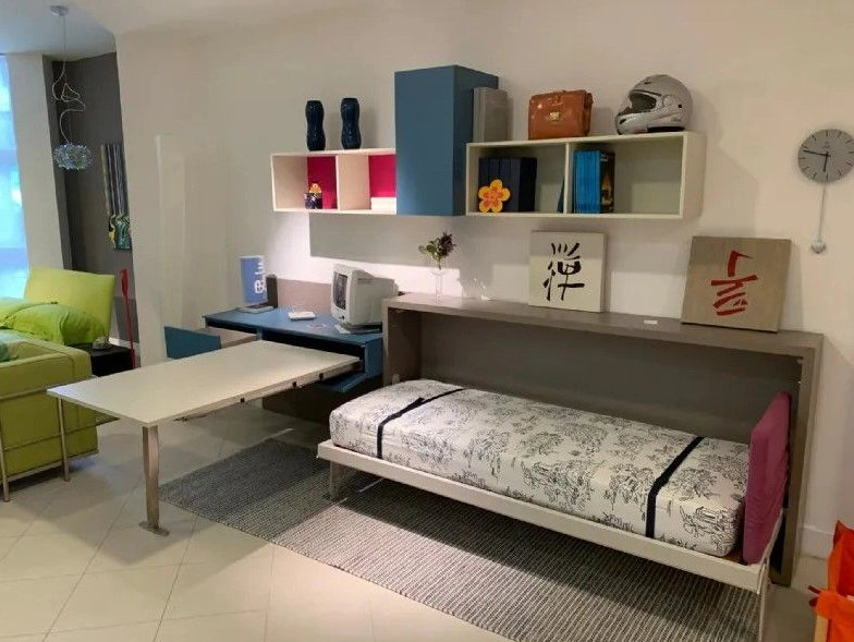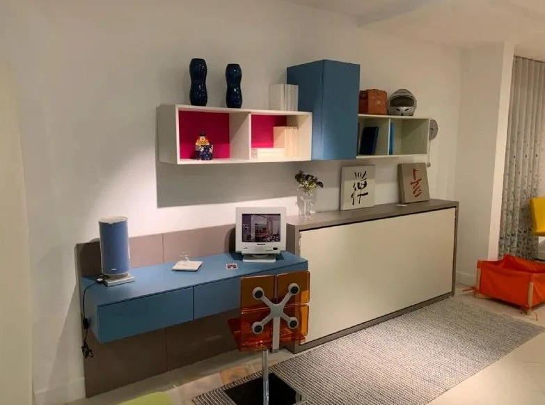 • Letto a Scomparsa: Dotato di testata reclinabile in tessuto colore fucsia, che offre comfort e un elemento di colore vivace quando aperto.
