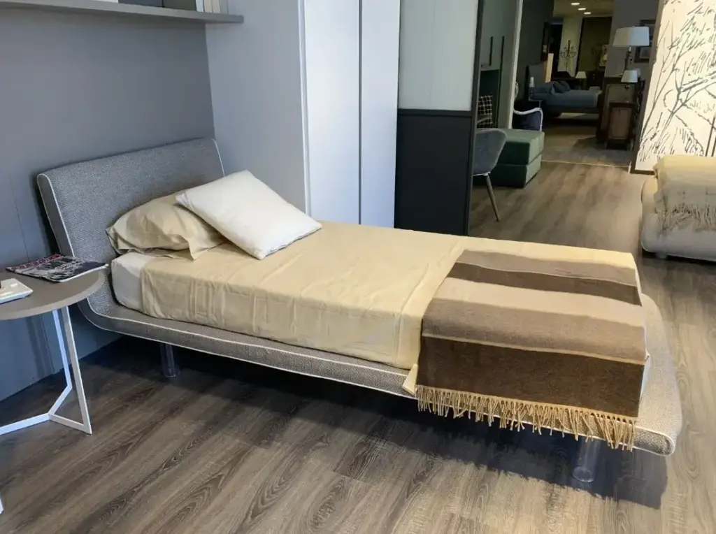 Il letto Slitta, con dimensioni di 96 cm di larghezza e 215 cm di profonditร , รจ adatto per un materasso di 90x200 cm. Rivestito in tessuto TB29 di categoria B e imbottito per un comfort superiore, il letto presenta un design moderno. I piedi in plexiglass conferiscono un tocco di leggerezza e trasparenza, completando il look sofisticato della cameretta.