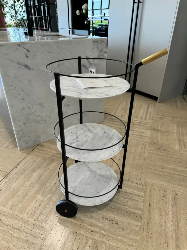La struttura del carrellino Tumbler รจ realizzata in acciaio, garantendo robustezza e durabilitร . L'acciaio, con i suoi inserti sui piani, offre un sostegno stabile, rendendo il carrellino sicuro per trasportare oggetti delicati. Tumbler รจ dotato di tre piani circolari in marmo Bianco Gioia Opaco, un materiale pregiato che esalta la bellezza del design. I piani in marmo offrono ampio spazio per conservare e trasportare vari oggetti, sia in ambienti domestici che professionali. Con la sua struttura a tre piani e l'elegante combinazione dei materiali, Tumbler รจ ideale per diversi utilizzi: come carrellino da tรจ, mobile bar o complemento dโarredo in un soggiorno, uno studio o una sala da pranzo.