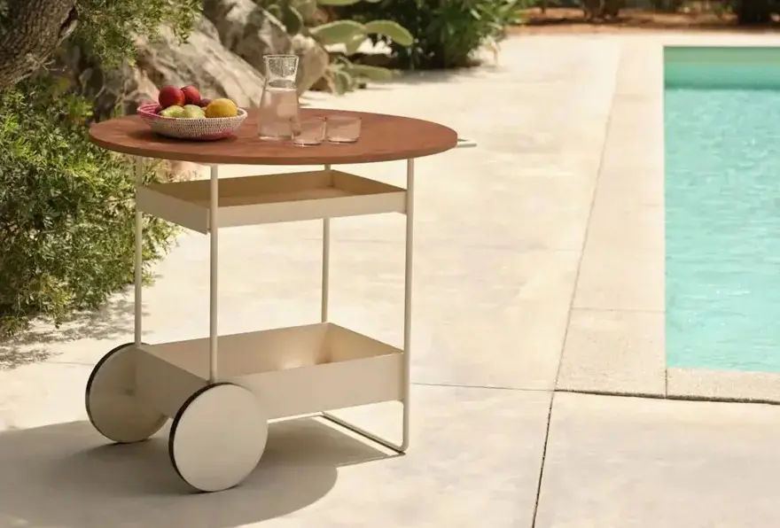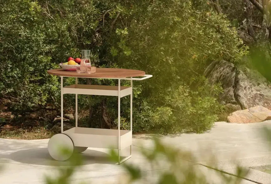 Grazie alle sue linee pulite e al carattere discreto, questo carrello si integra con naturalezza in ambienti outdoor di stile moderno, offrendo una soluzione pratica ed elegante per il servizio e l’organizzazione degli spazi.