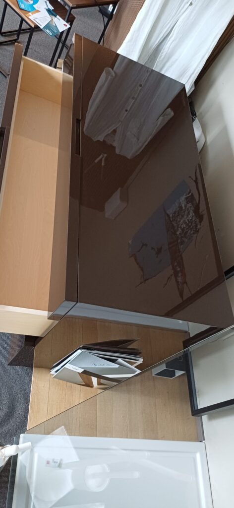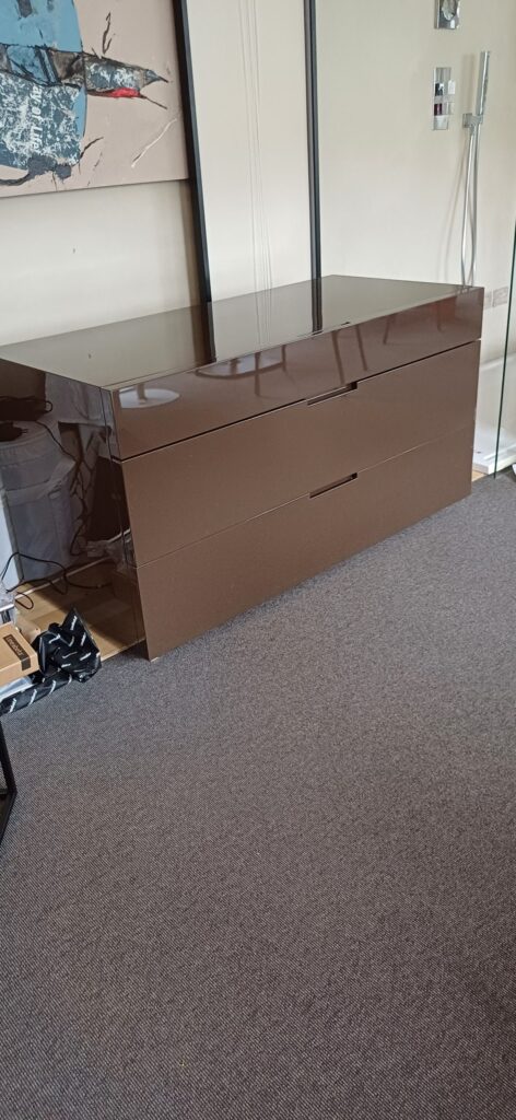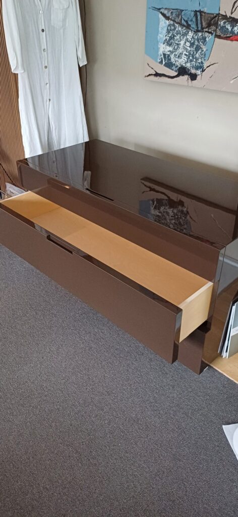 - Linee pulite e moderne, con finitura laccato lucido marrone, che conferisce un effetto elegante e luminoso.