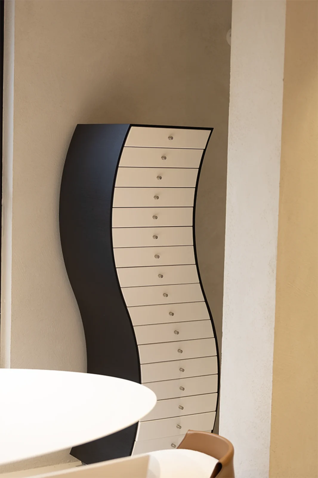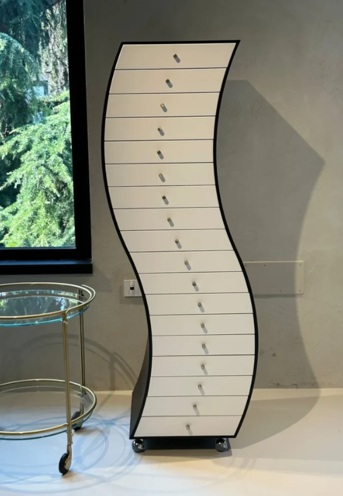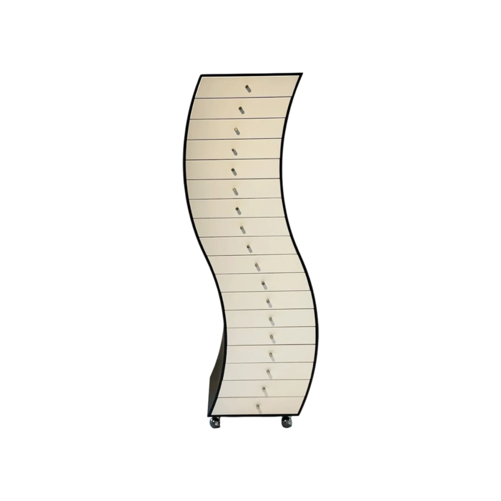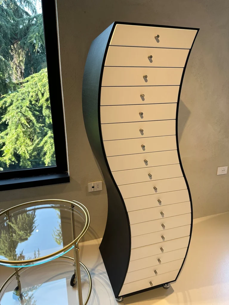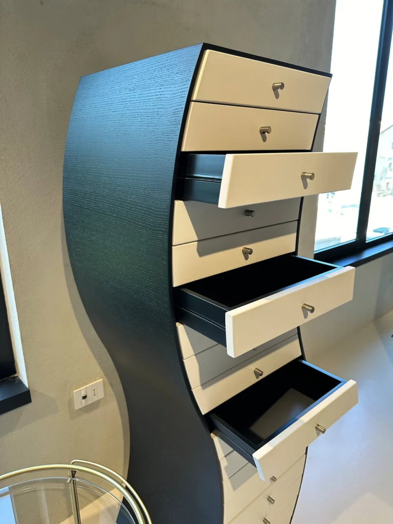 Side 1ย fa parte della celebre collezione Progetti Compiuti, disegnata dal rinomato designer giapponese Shiro Kuramata per Cappellini nel 1970. Questo pezzo si distingue per la sua forma sinuosa e la combinazione di materiali di alta qualitร . La struttura รจ realizzata in frassino tinto nero, mentre i cassetti sono laccati bianco opaco, offrendo un contrasto elegante e sofisticato. Il tutto รจ montato su ruote in gomma grigia, che aggiungono praticitร e versatilitร .