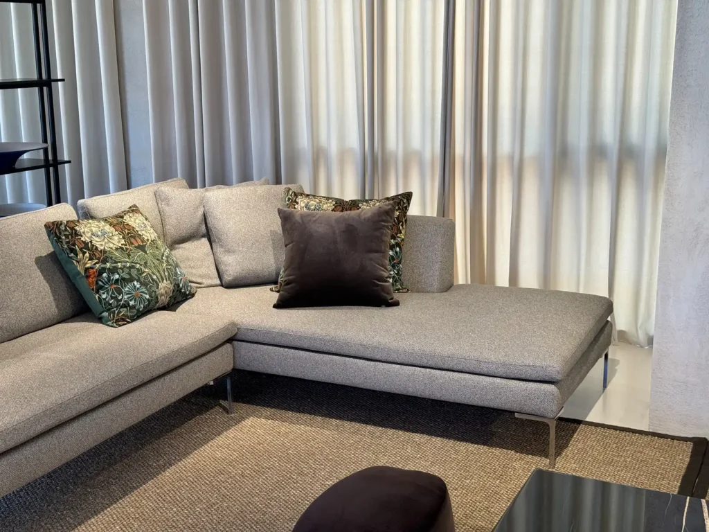 Il divano Charles con Chaise Longue a destra, rivestito in tessuto Cat. L Laveno Acciaioย di B&B Italia, rappresenta un'icona del design contemporaneo, ideato per garantire un comfort senza tempo. Progettato con un'estetica leggera e sofisticata, si distingue per i suoi piedini in alluminio pressofuso a forma di "L" rovesciata e il cuscino unico della seduta accompagnato da cuscini liberi posizionati sullo schienale, che ne definiscono l'eleganza.