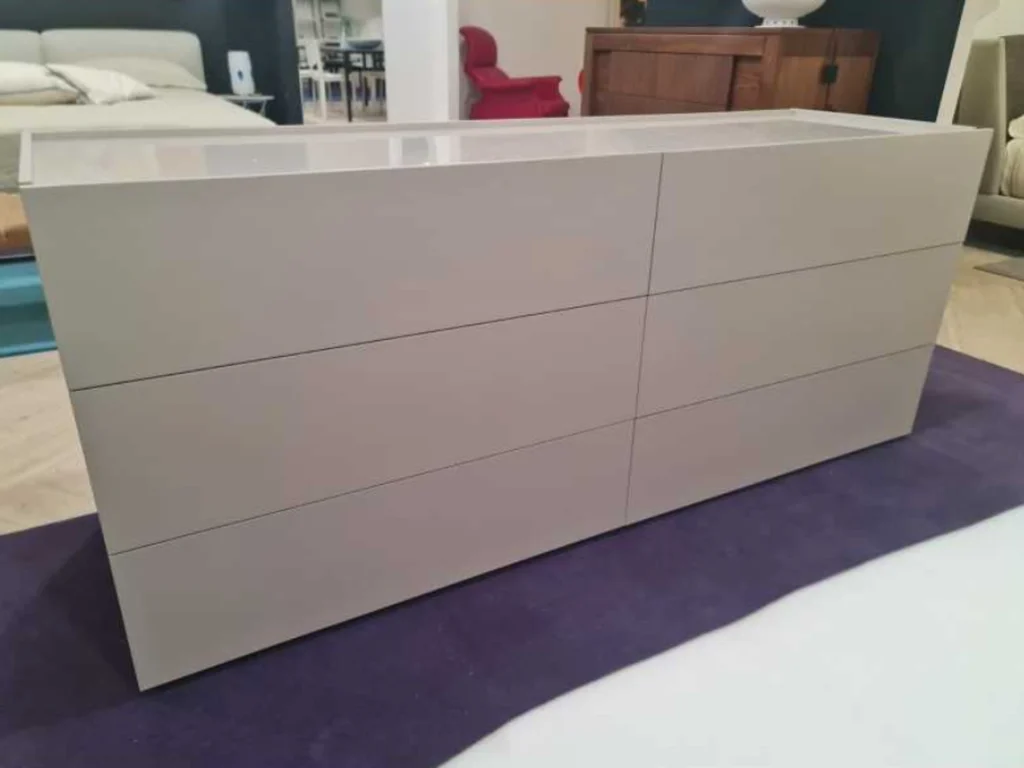 - Il comò è disponibile in una varietà di finiture, tra cui il laccato seta per un effetto delicato, e la base materico lavagna, che aggiunge contrasto e un tocco moderno al mobile.