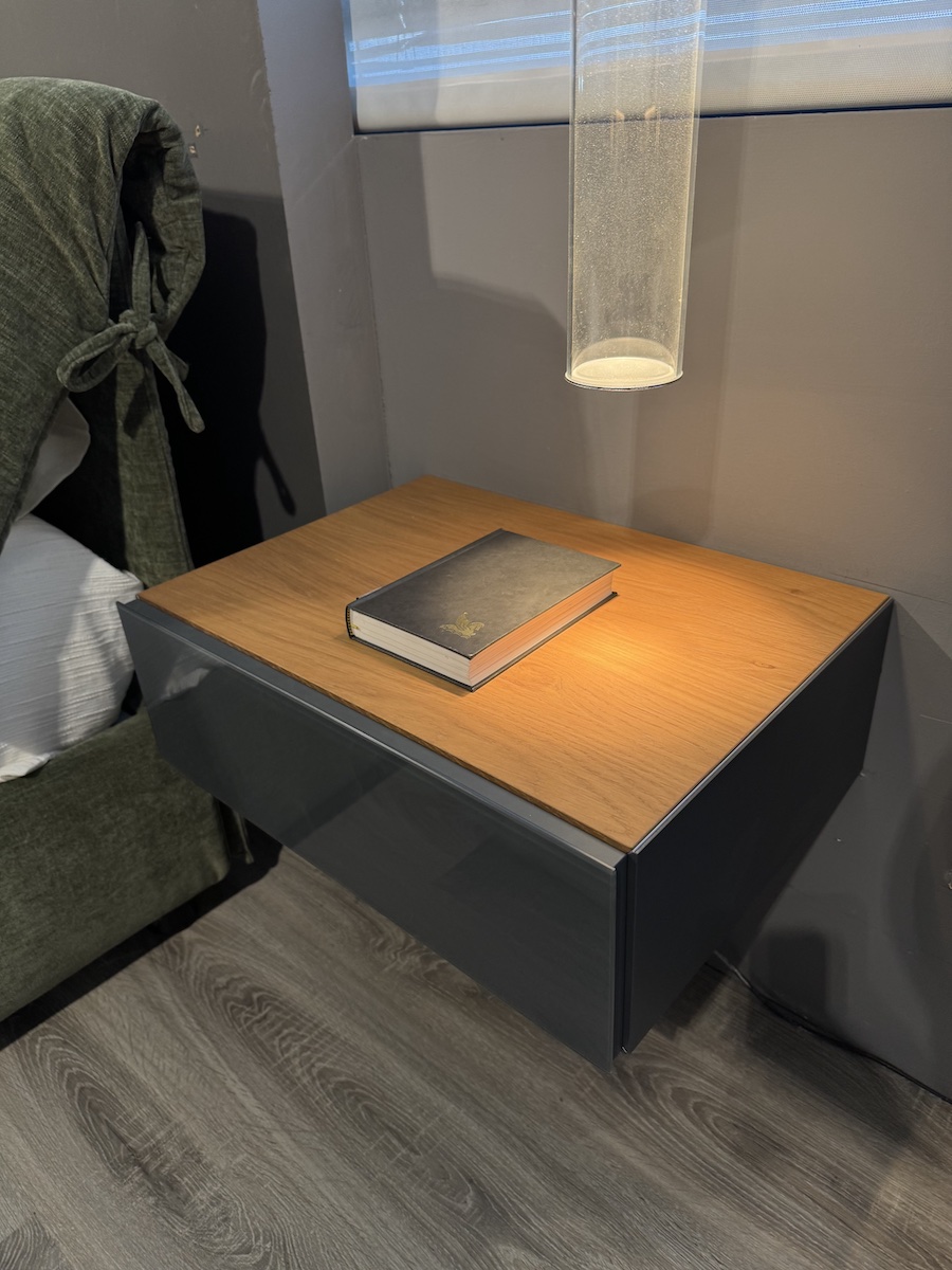 Il cassetto, dalle dimensioni L 55,2 ร— P 40,6 ร— H 18,4 cm, presenta un frontale in vetro lucido grafite, che dona luminositร  e un raffinato contrasto con la texture del legno. Il design essenziale, tipico del sistema 36e8, permette al comodino di integrarsi in qualsiasi camera da letto, sia sospeso a parete sia inserito in composizioni piรน ampie.