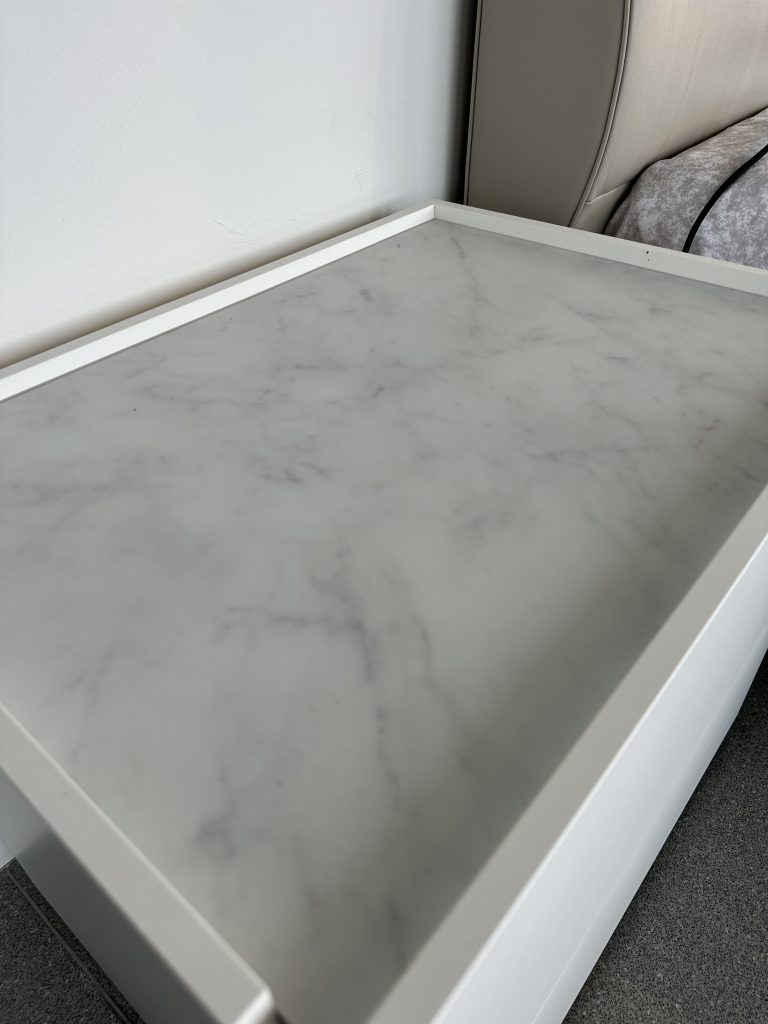 - Piano in vetro marmorizzato bianco Carrara: Un dettaglio esclusivo che evoca la bellezza del marmo naturale, aggiungendo un tocco di lusso senza sacrificare la praticitร .