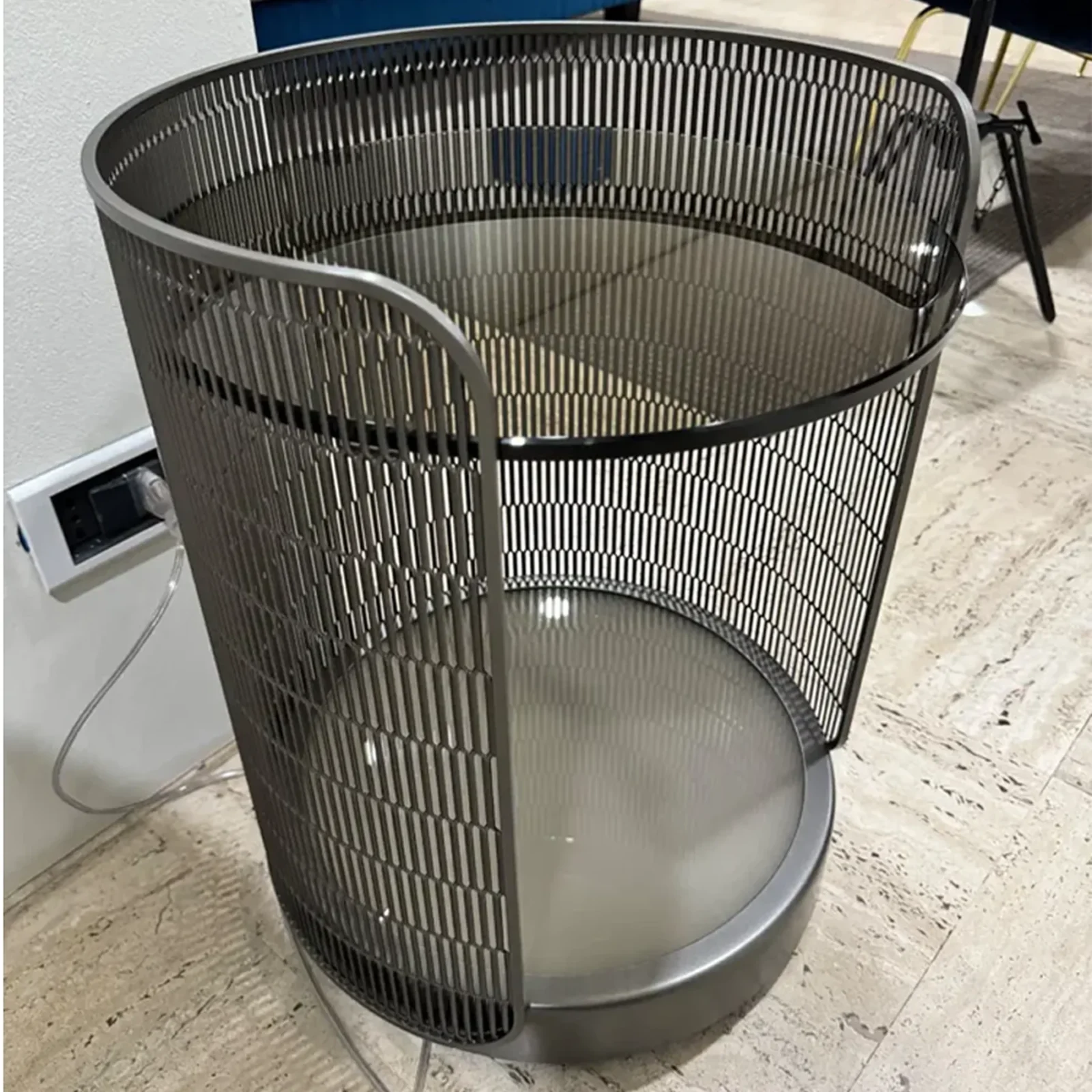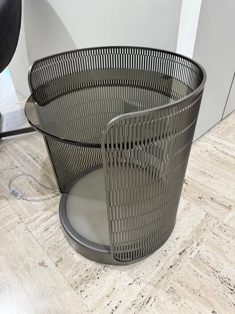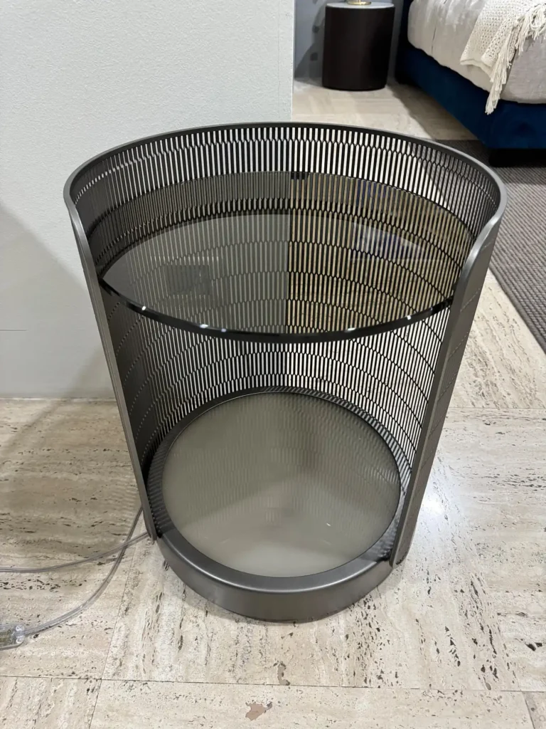 Il comodino Chiaro di Luna รจ caratterizzato da una struttura in rete metallica brunita opaca, che permette alla luce di filtrare e diffondersi in modo uniforme, creando giochi di luce e ombra suggestivi. La sua forma cilindrica, che richiama la luna piena, รจ accentuata dalla presenza di due piani dโappoggio in vetro bronzato: uno superiore spesso 10 mm e uno inferiore da 4 mm, all'interno del quale sono incorporati i LED. I piedini del comodino sono realizzati in PVC, garantendo stabilitร e durabilitร . L'accensione della lampada integrata avviene tramite un interruttore a bilanciere, posizionato in modo discreto per non compromettere lโestetica pulita del design. Il Chiaro di Luna non รจ solo un comodino, ma anche un elemento luminoso che contribuisce a creare unโatmosfera serena e accogliente in camera da letto.F