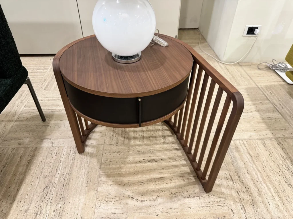Il cassetto del comodino, realizzato in cuoio rigenerato, aggiunge un tocco di eleganza ed è disponibile in tonalità nero, con un rivestimento che include una maniglia integrata decorata con dettagli in ottone lucido. Questo cassetto non solo offre spazio per riporre oggetti personali, ma aggiunge anche una funzione innovativa: ruota su sé stesso, avvicinandosi al letto e creando un pratico secondo ripiano.