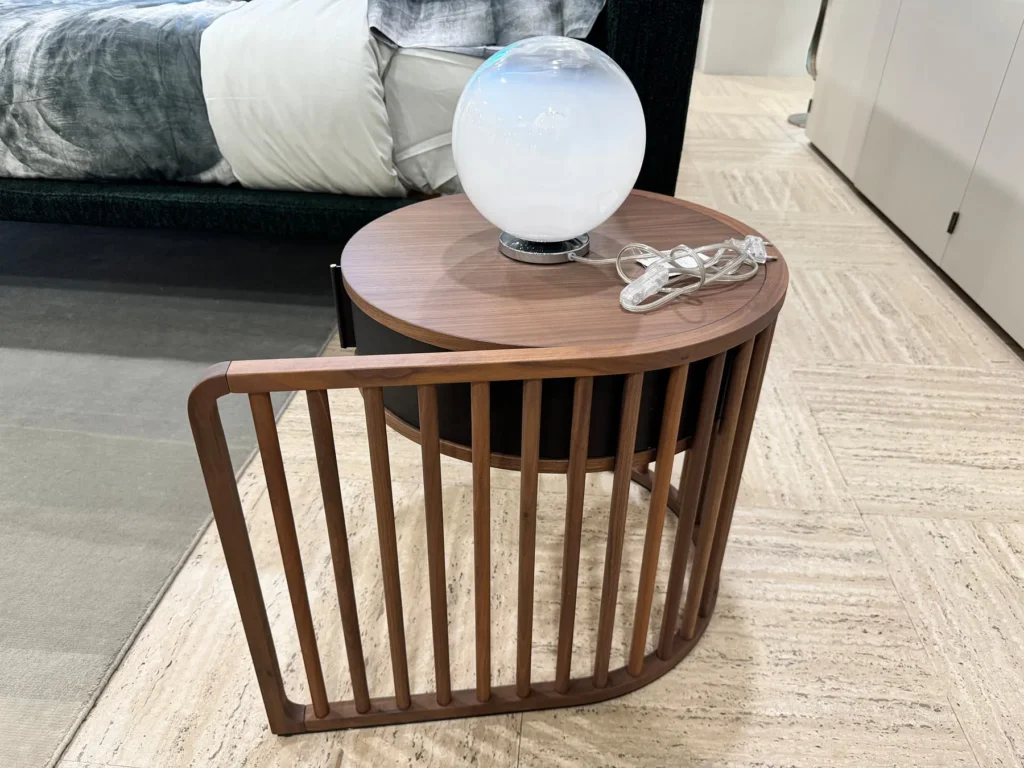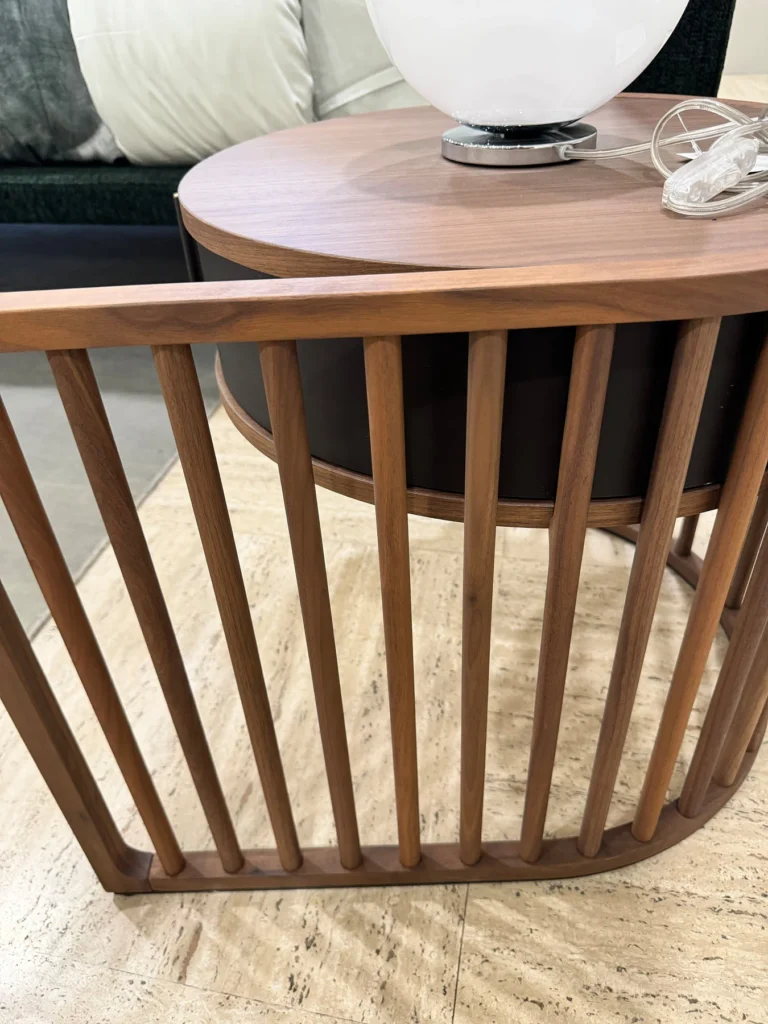 Il comodino Palù è caratterizzato da una struttura portante realizzata con una serie di tondini di legno disposti l'uno accanto all'altro a distanza regolare, creando un suggestivo gioco di vuoti e pieni. Questo design curvilineo conferisce al comodino un aspetto scenico, enfatizzato dal contrasto tra le ombre e le luci che si creano tra i tondini. La struttura in legno è disponibile nella finitura naturale.
