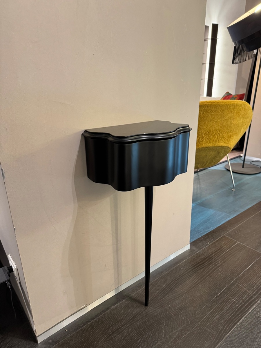 La Consolle Carlino CM Mollino รจ un arredo iconico, nato dal talento visionario di Carlo Mollino e riconosciuto per la sua estetica unica, elegante e quasi metafisica. Questo modello, esposto in showroom, รจ realizzato in legno verniciato nero e arricchito da un raffinato piano in vetro lucido nero, che valorizza la leggerezza delle sue forme.