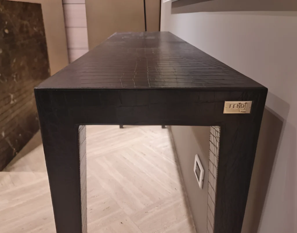 - Materiali Prestigiosi: La consolle รจ realizzata in pelle Crocodile nera, un materiale di altissima qualitร che conferisce un aspetto ricco e lussuoso. La finitura in pelle Crocodile esalta la texture unica, rendendo ogni pezzo esclusivo e irresistibile al tatto.