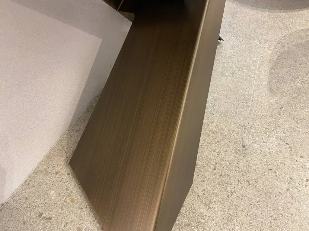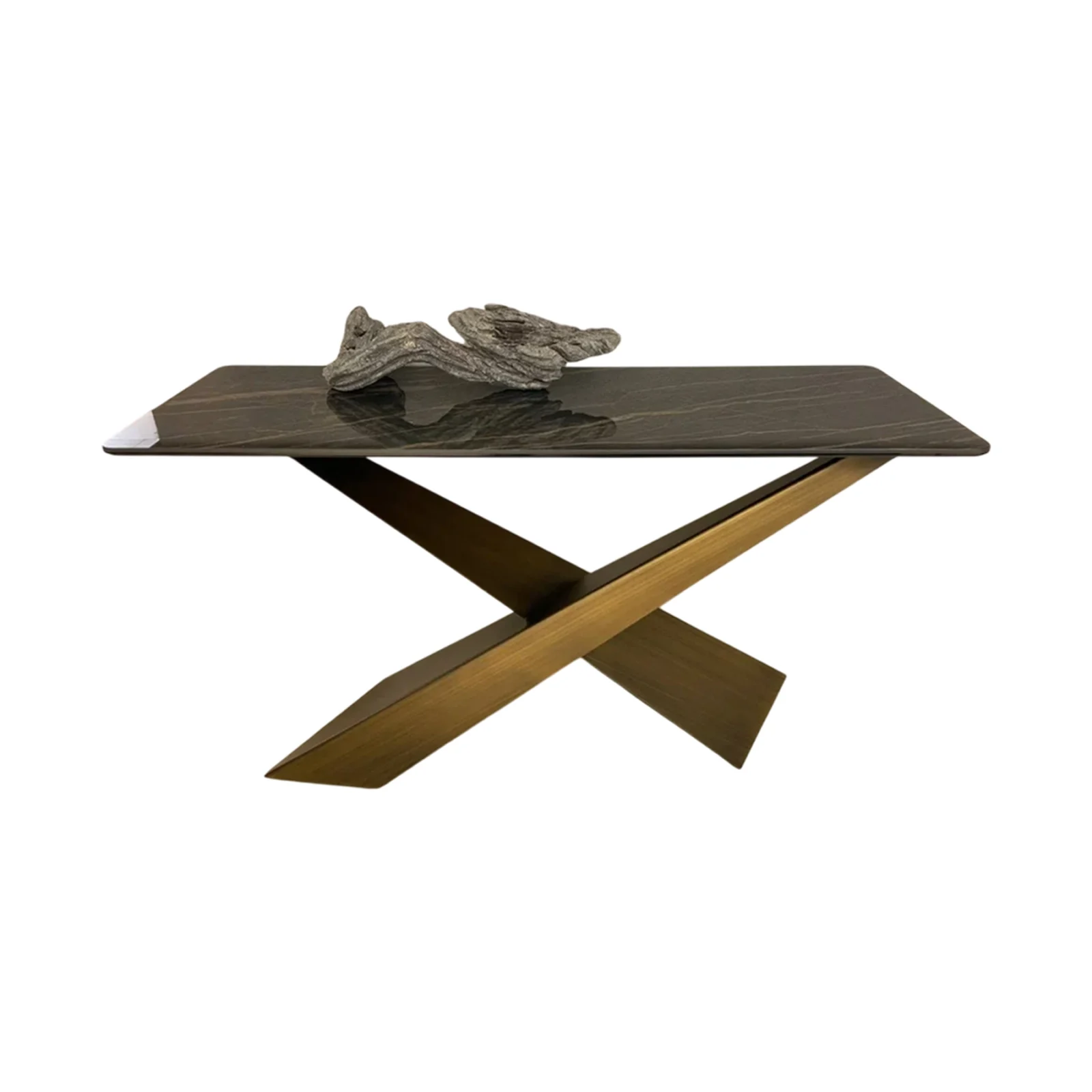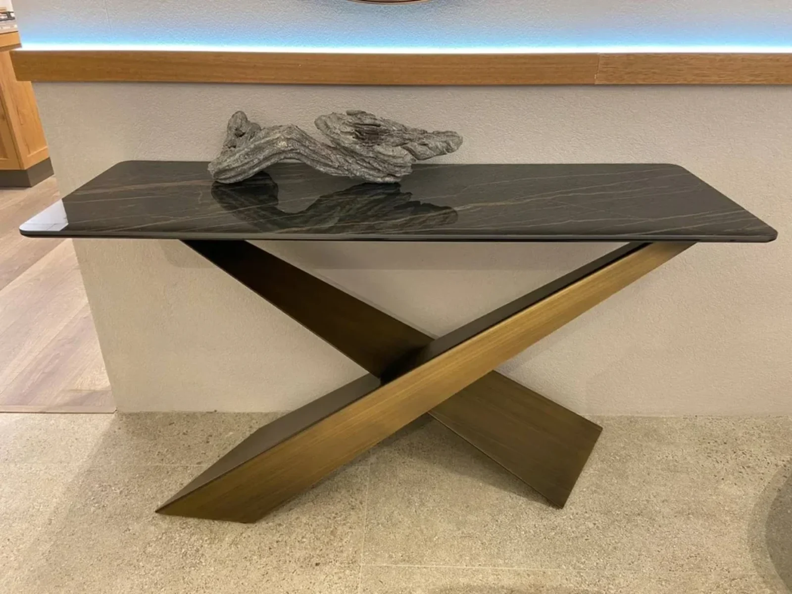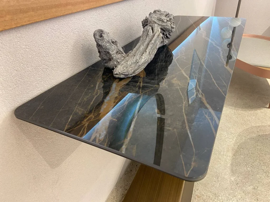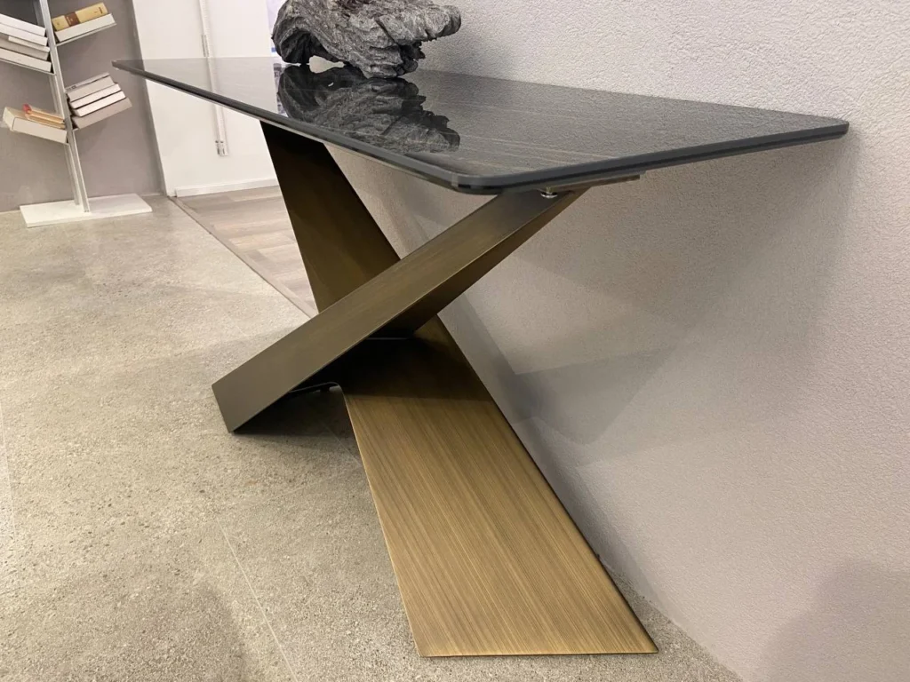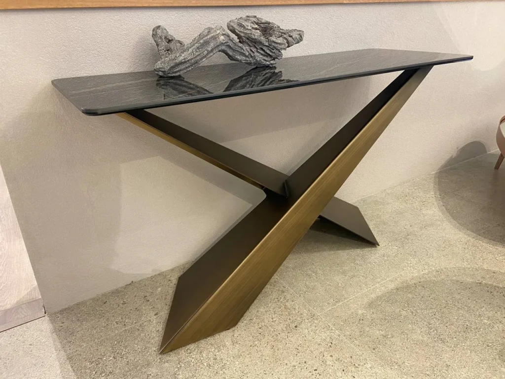 Living di Riflessi รจ un elegante complemento d'arredo dallo stile moderno, perfetta per ambienti di design. La sua base, realizzata in metallo verniciato e rifinita in ottone spazzolato, presenta due gambe inclinate e sovrapposte in modo asimmetrico, creando un effetto visivo originale e dinamico. Il piano in ceramica Noir Desir lucido aggiunge un tocco di lusso, esaltando le venature naturali che ricordano la pietra. Questa consolle fissa รจ ideale per arricchire ingressi, soggiorni o corridoi, con un design distintivo che combina soliditร e leggerezza visiva.