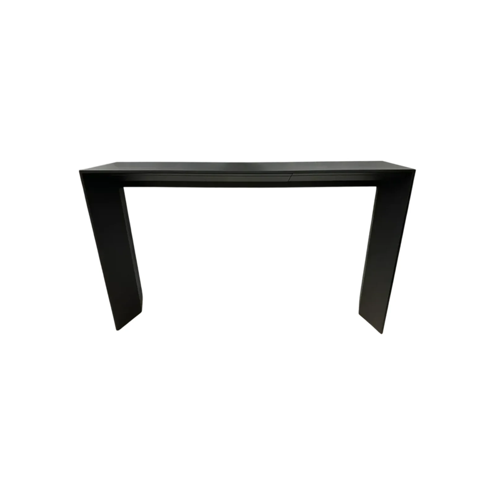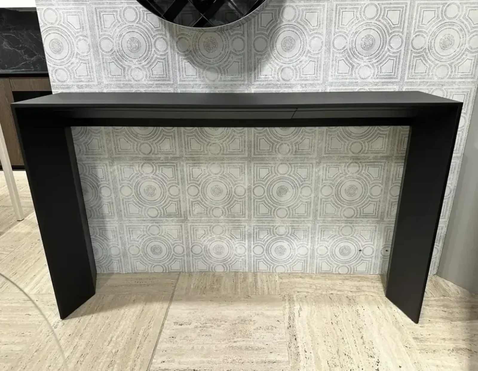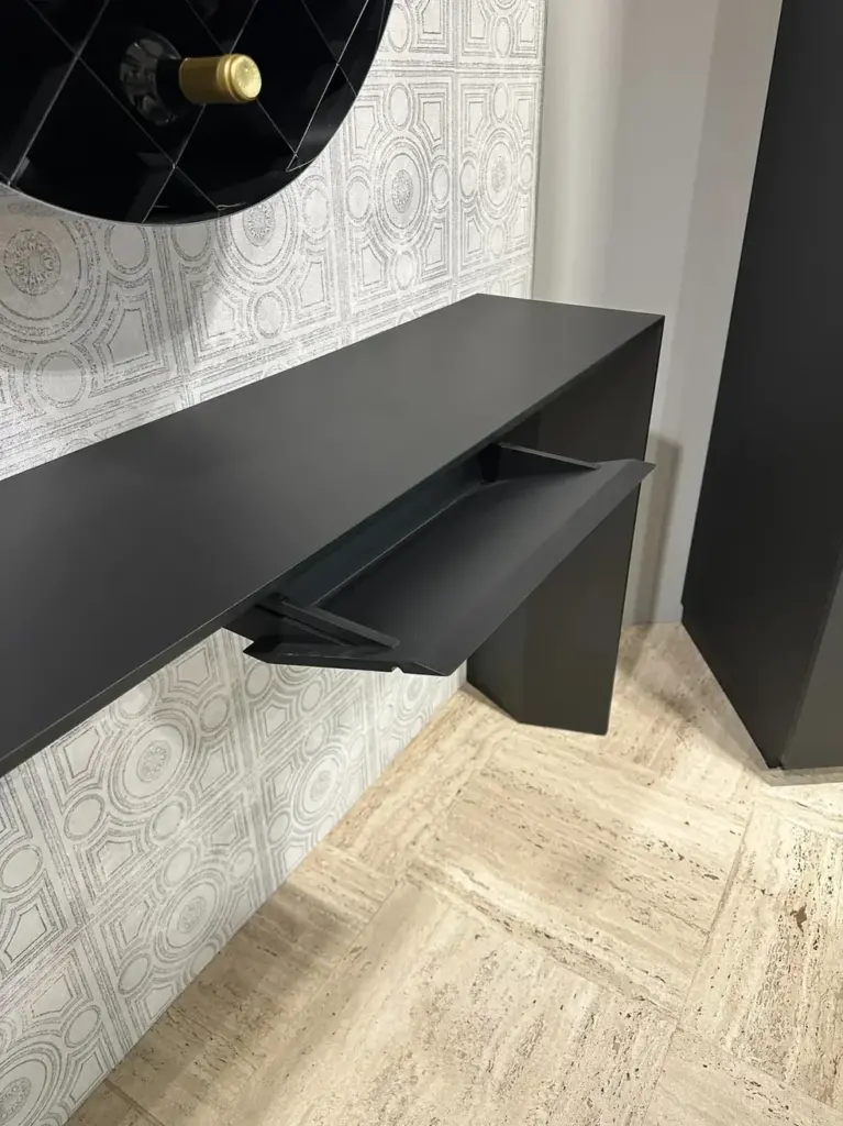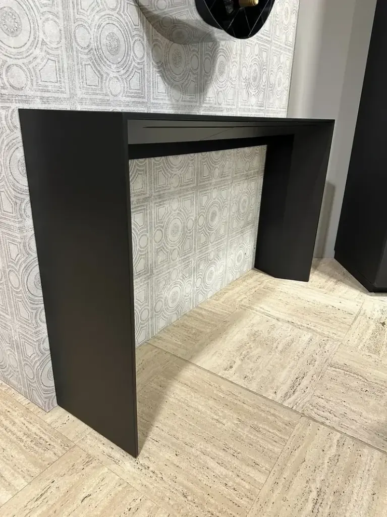 La consolle รจ costruita in MDF, un materiale noto per la sua resistenza, che assicura una lunga durata nel tempo mantenendo un peso ridotto. La consolle รจ rifinita con una laccatura nera opaca che le conferisce un aspetto moderno. Questa finitura permette alla consolle di adattarsi facilmente a diversi stili di arredamento. La Consolle รจ dotata di una struttura a ponte che nasconde sotto al piano 3 cassetti estraibili. Questi cassetti, con frontale inclinato e meccanismo a scomparsa totale, sono perfetti per riporre piccoli oggetti, mantenendo lโaspetto minimalista e ordinato della consolle.