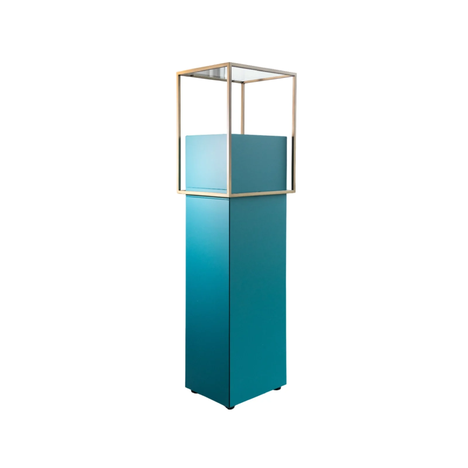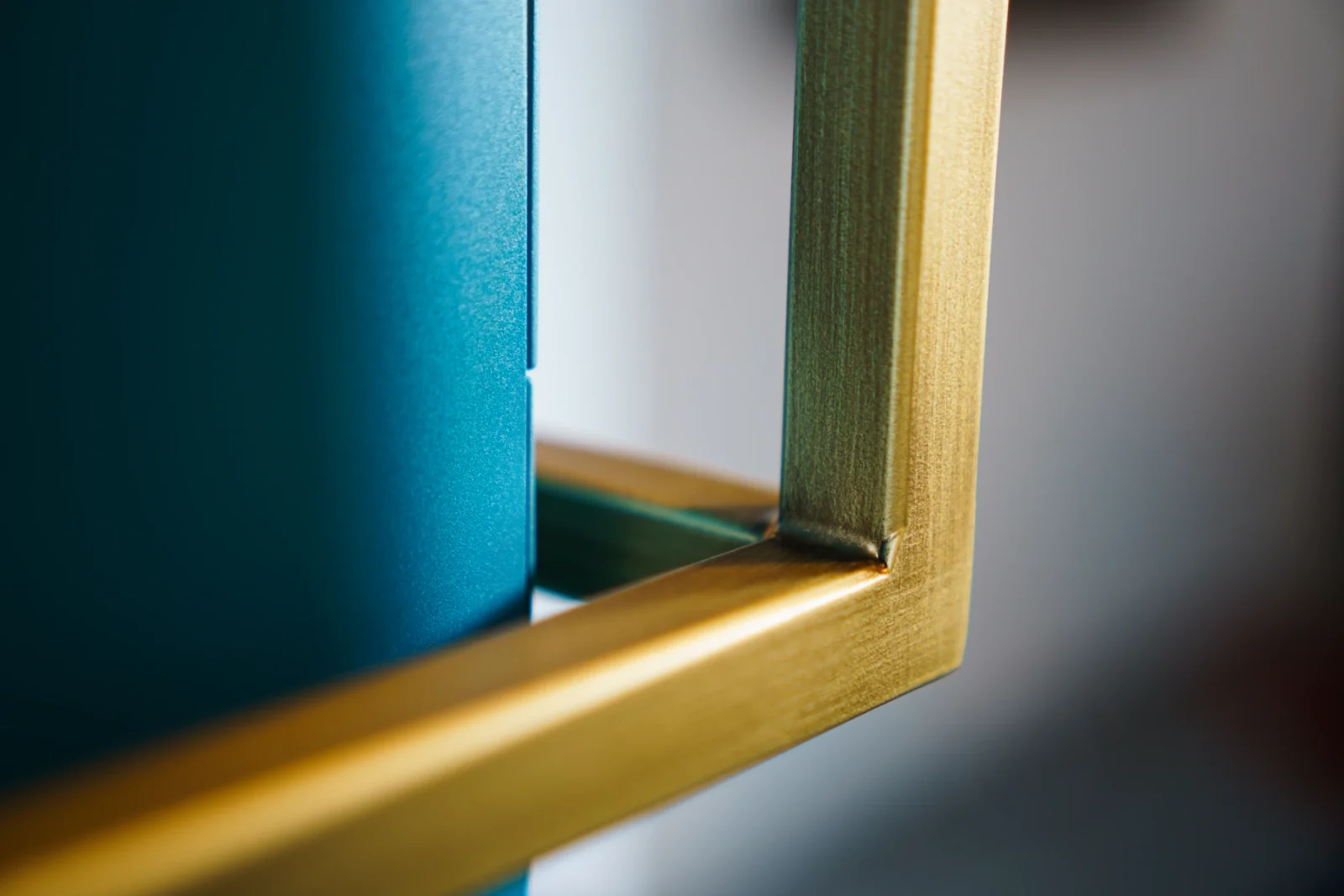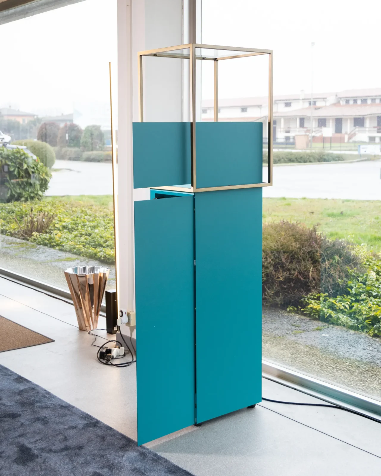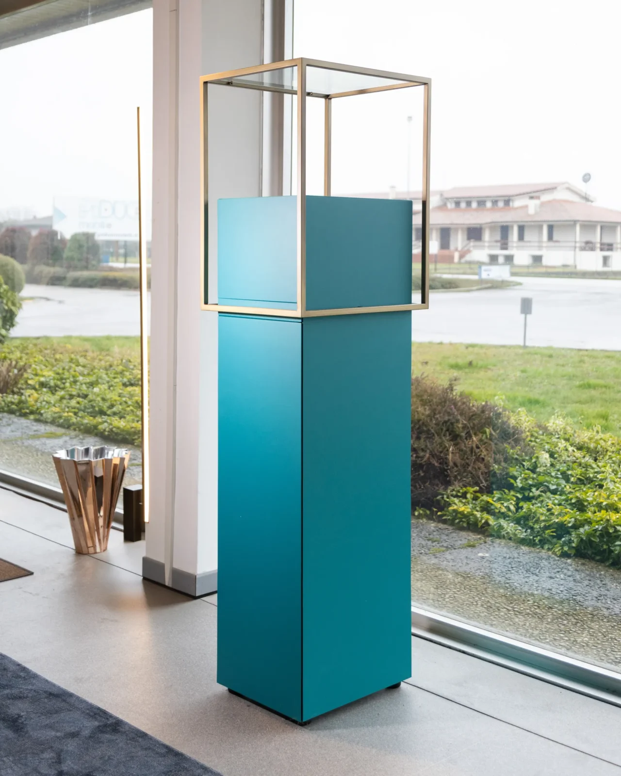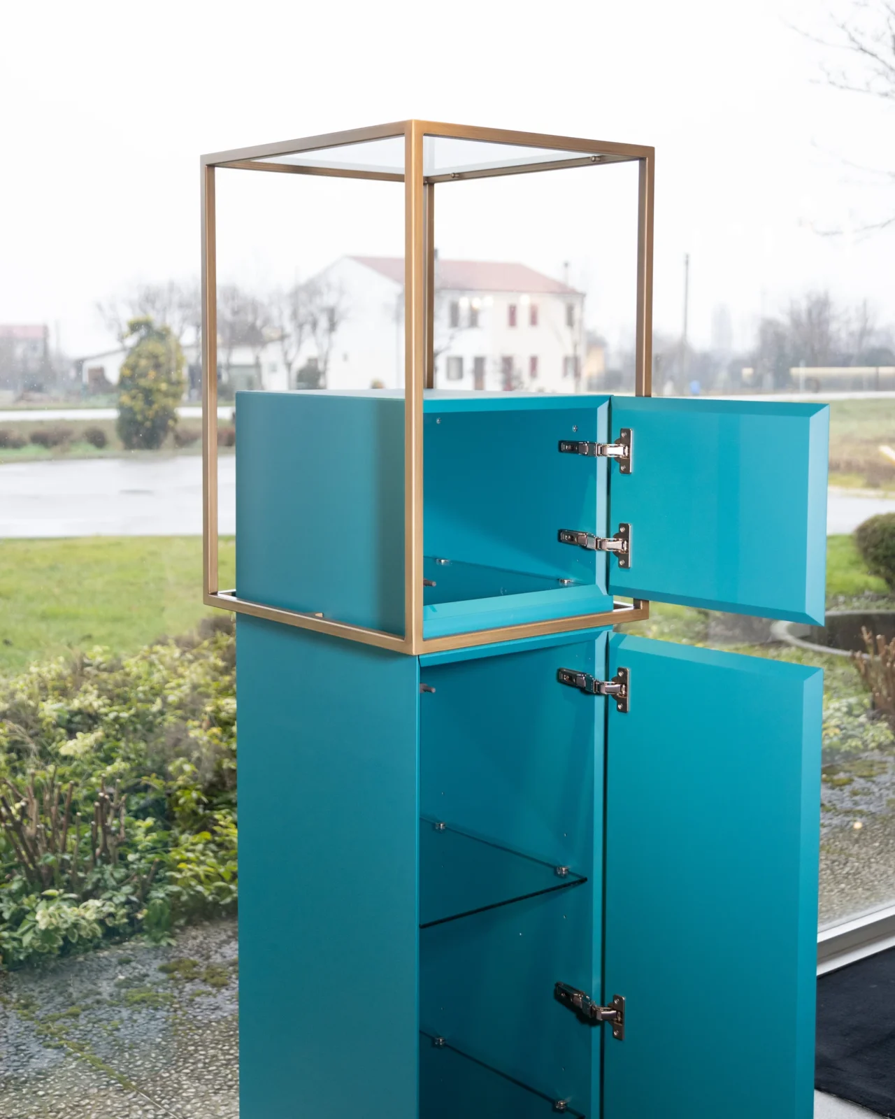 Elegante mobile caratterizzato da una finitura laccato opaco goffrato turchese, con un design sofisticato. L'apertura a anta destra offre una praticitร d'uso ottimale. Il telaio verniciato bronzo patinato aggiunge un tocco di carattere al mobile, rendendolo un pezzo di design perfetto per arricchire ogni ambiente.