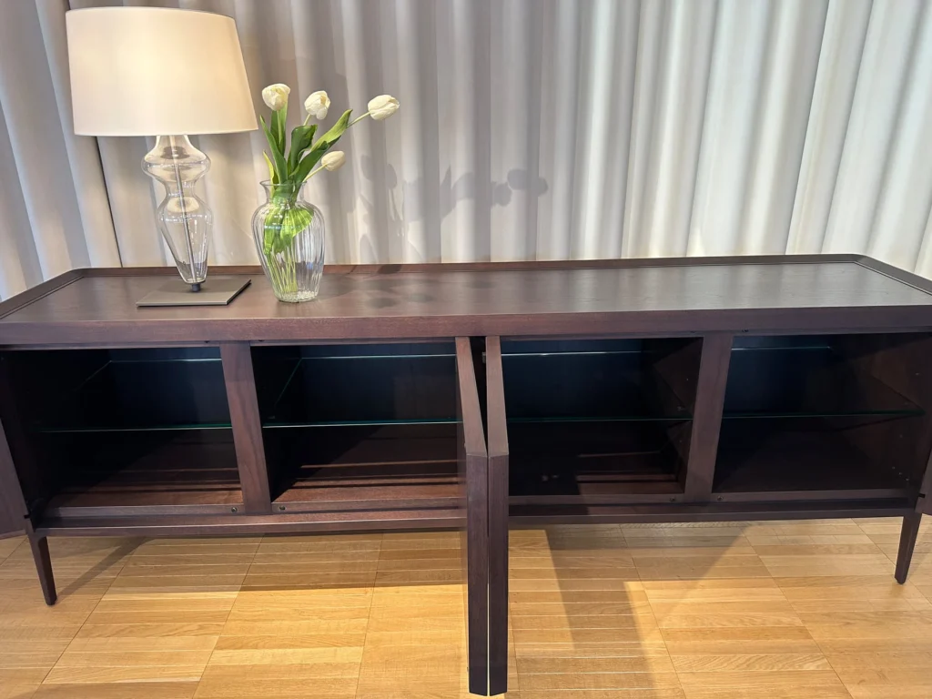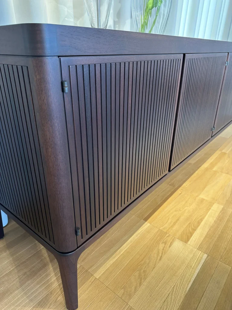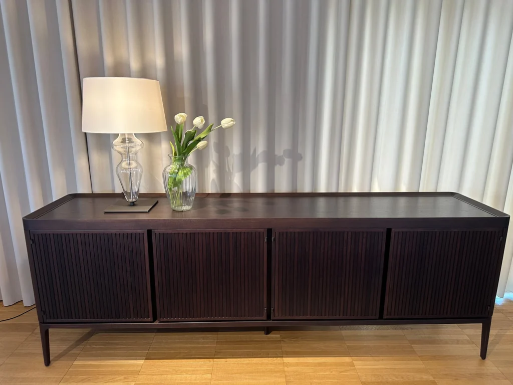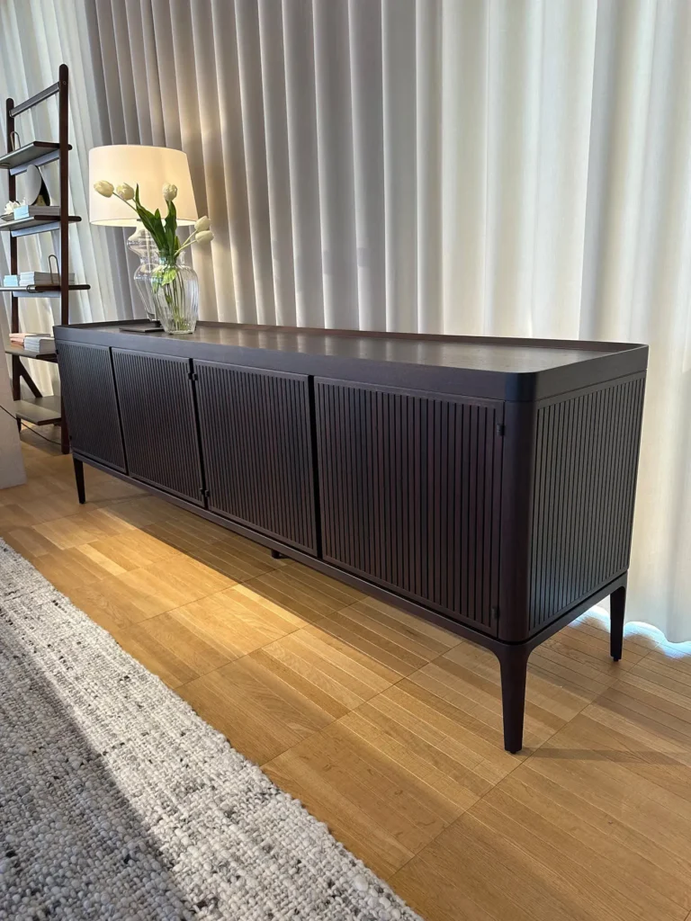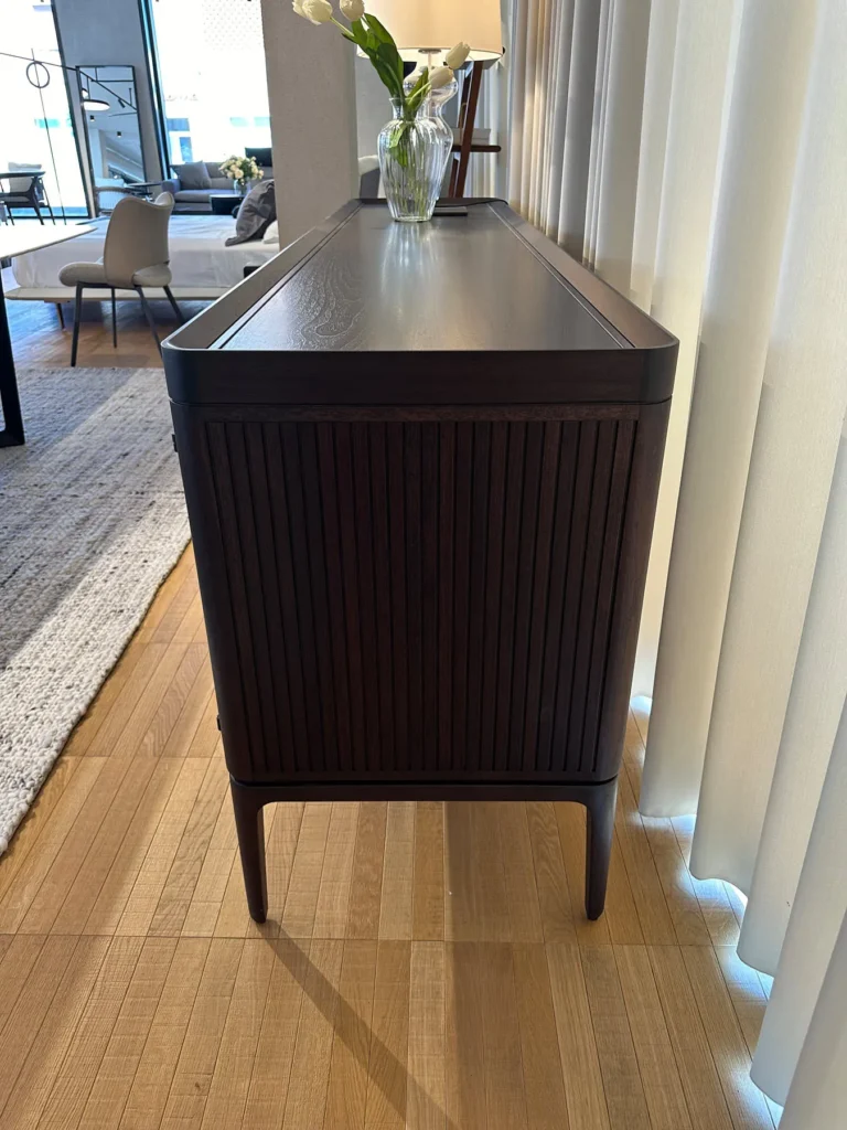 La struttura e la base sono realizzate in massello di noce americano, garantendo robustezza e eleganza. Il piano, incassato nella cornice di noce americano, รจ disponibile in legno. La ricerca di dettagli si riflette anche nelle cerniere in ottone massiccio e nella possibilitร di rivestire il pannello interno con tessuto e i fondi dei cassetti in pelle. La configurazione base delle credenze include una mensola in vetro per ciascun scomparto, ma si possono aggiungere ulteriori mensole o accessori personalizzati, come un mini frigo o una cassettiera interna. Inoltre, รจ possibile integrare luci LED che si attivano allโapertura delle ante, migliorando sia la visibilitร interna che l'estetica del mobile.