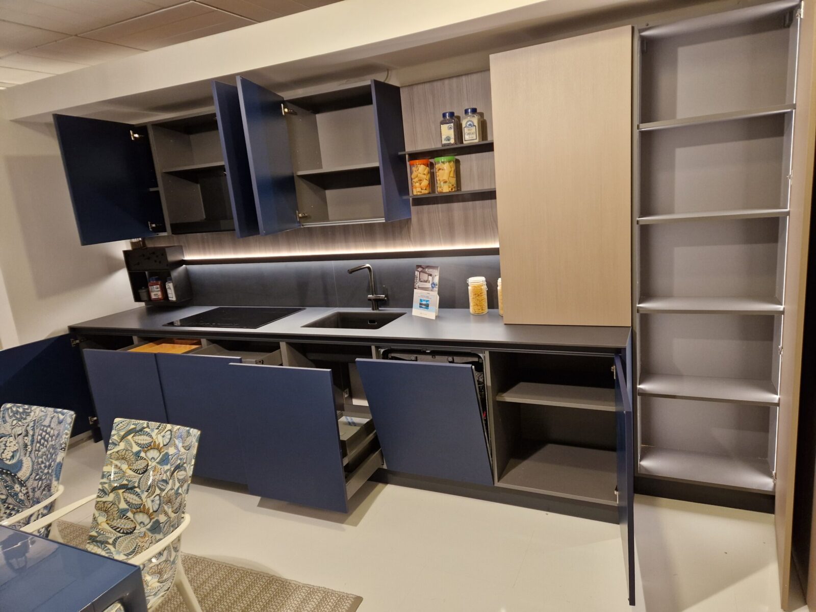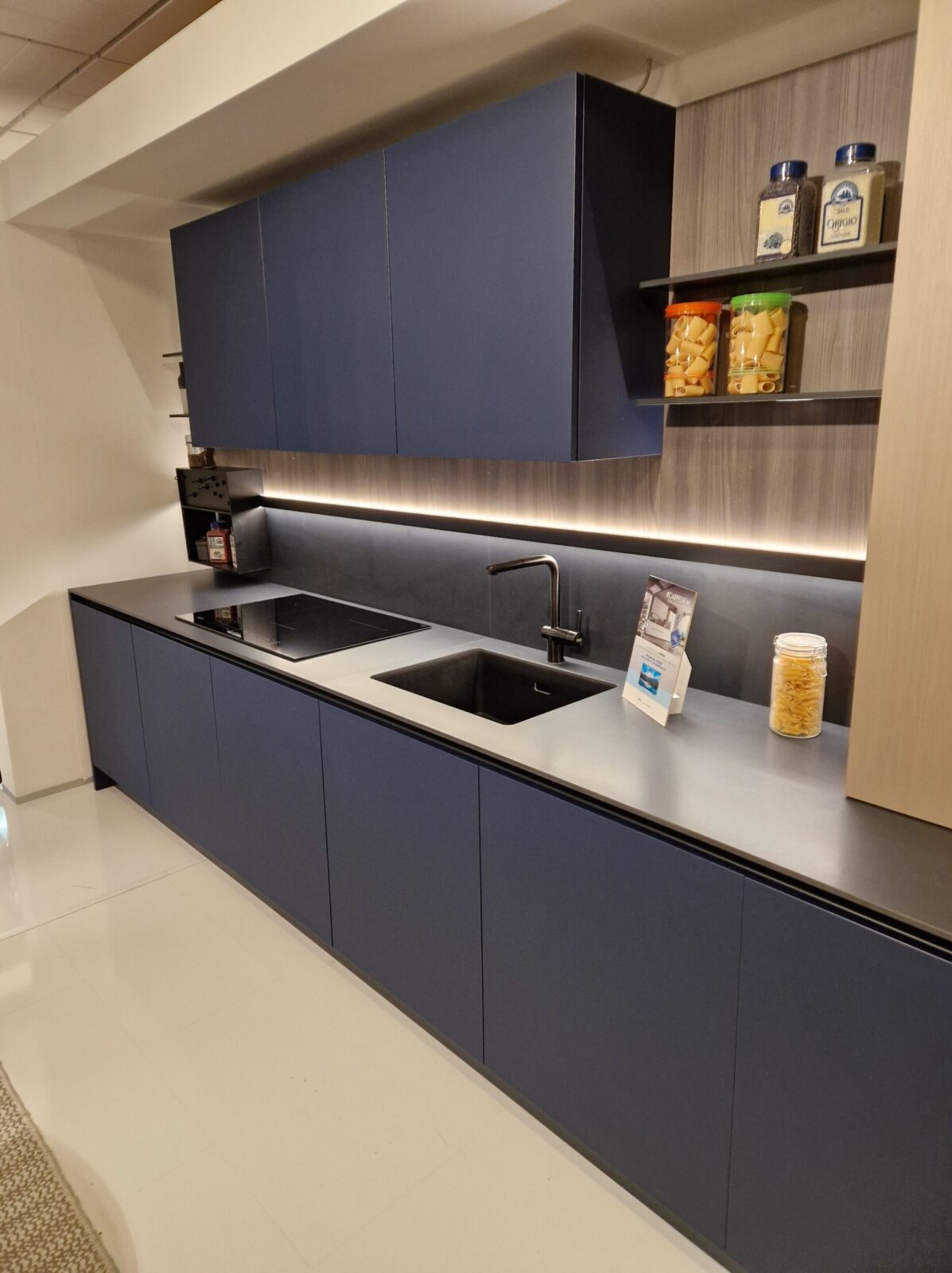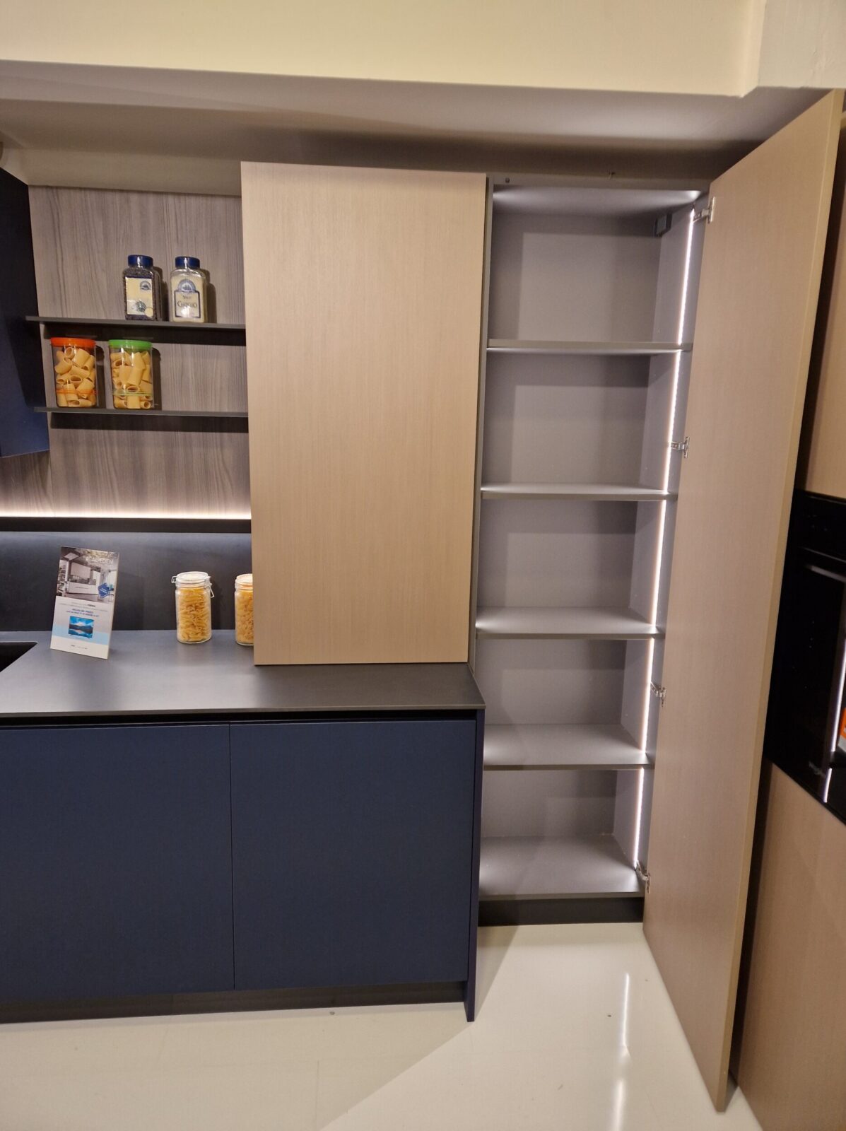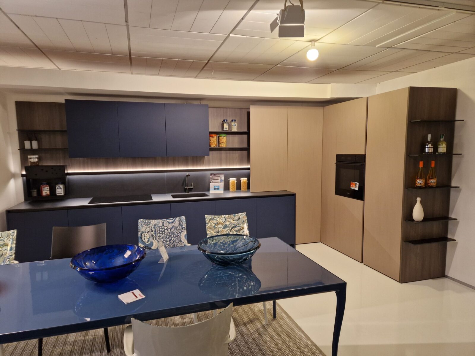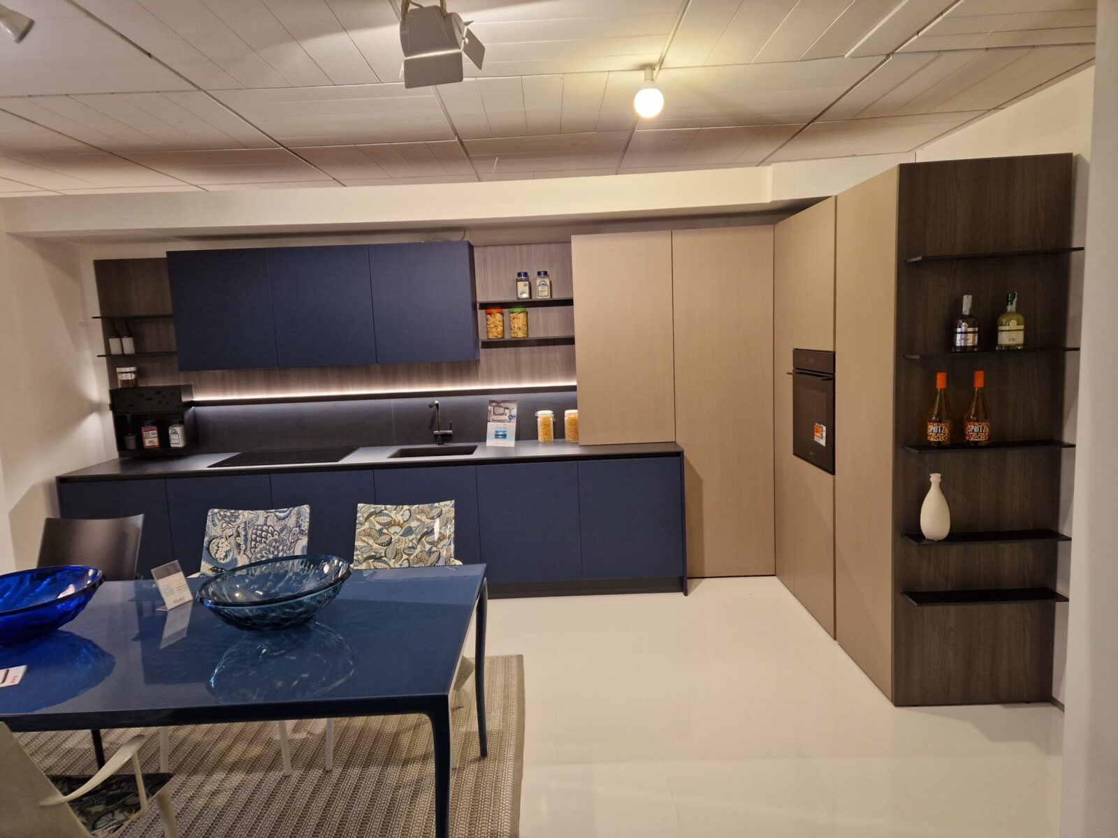 La struttura è realizzata in laccato opaco Blu Capri, abbinato al legno Olmo Castano. Questa combinazione cromatica crea un equilibrio raffinato tra modernità e calore naturale. Inoltre, le superfici opache valorizzano il design lineare e donano all’ambiente un carattere deciso ma armonioso.