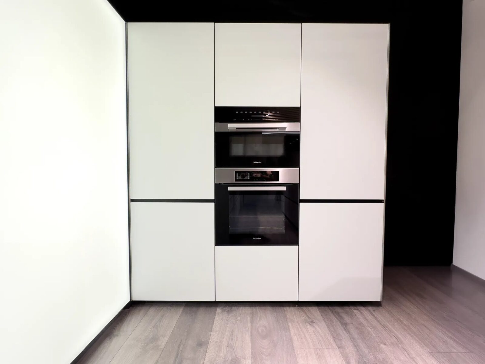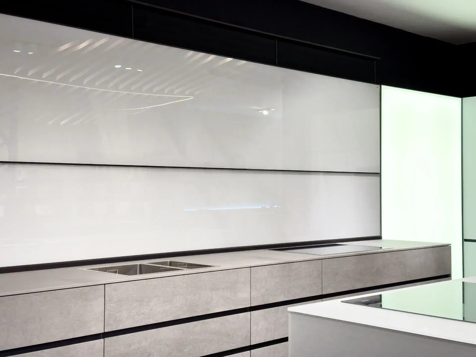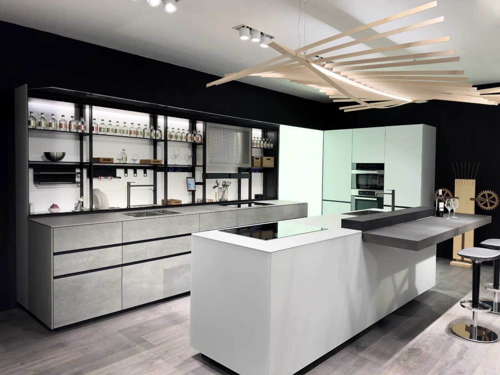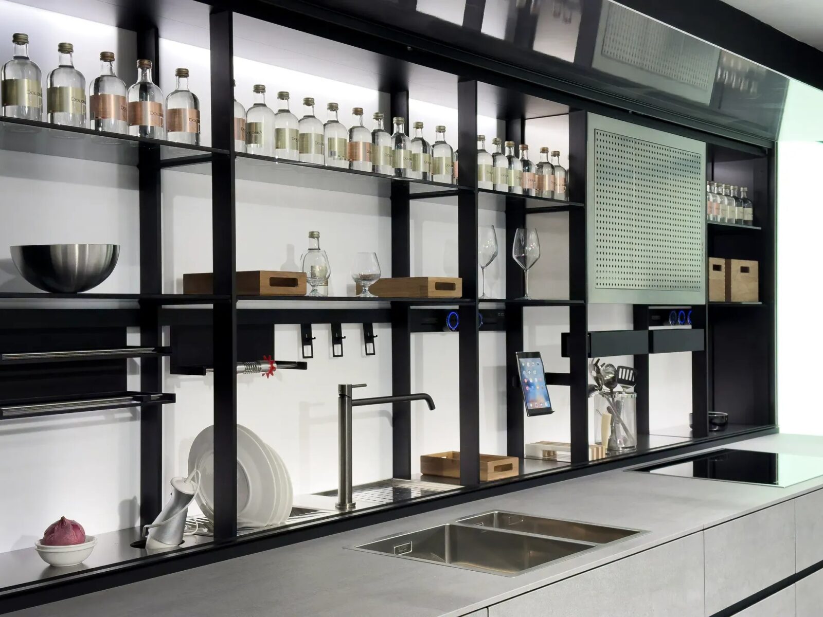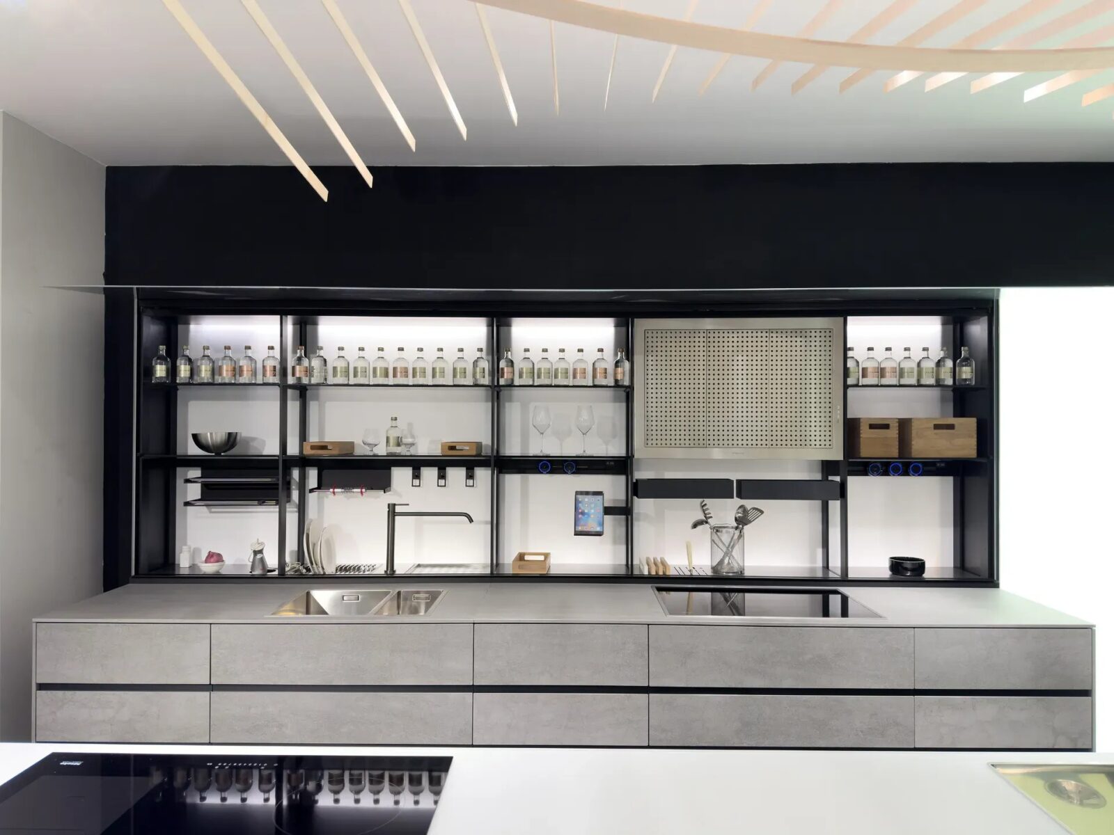 La composizione abbina superfici in Vitrum grigio freddo, telai in alluminio nero e dettagli accuratamente progettati per garantire continuitร  visiva, ordine e massima ergonomia. La presenza dellโ€™isola centrale rende la cucina ideale per chi desidera uno spazio conviviale e operativo, perfetto sia per lโ€™uso quotidiano sia per momenti di condivisione.