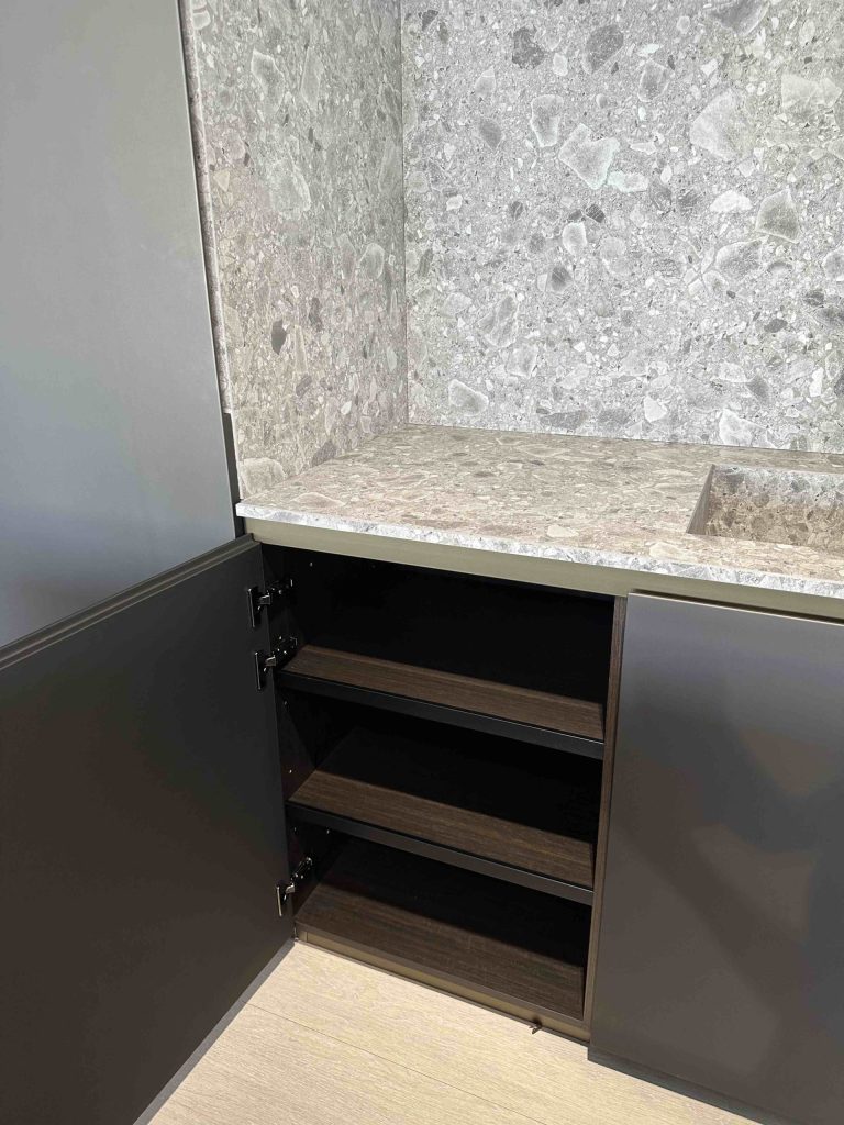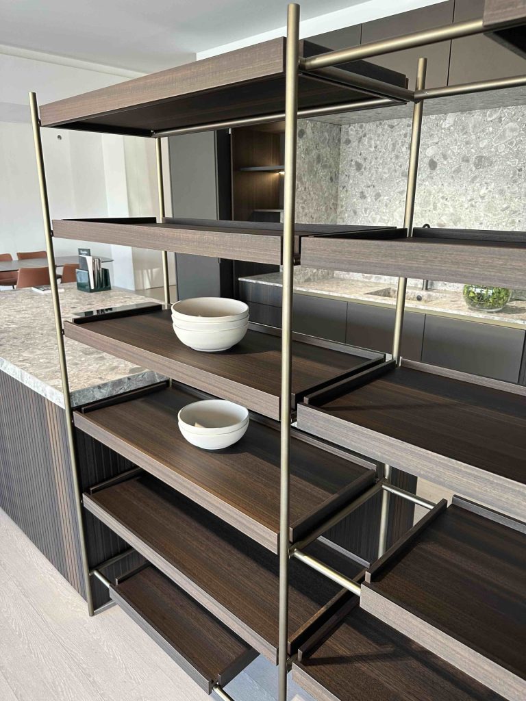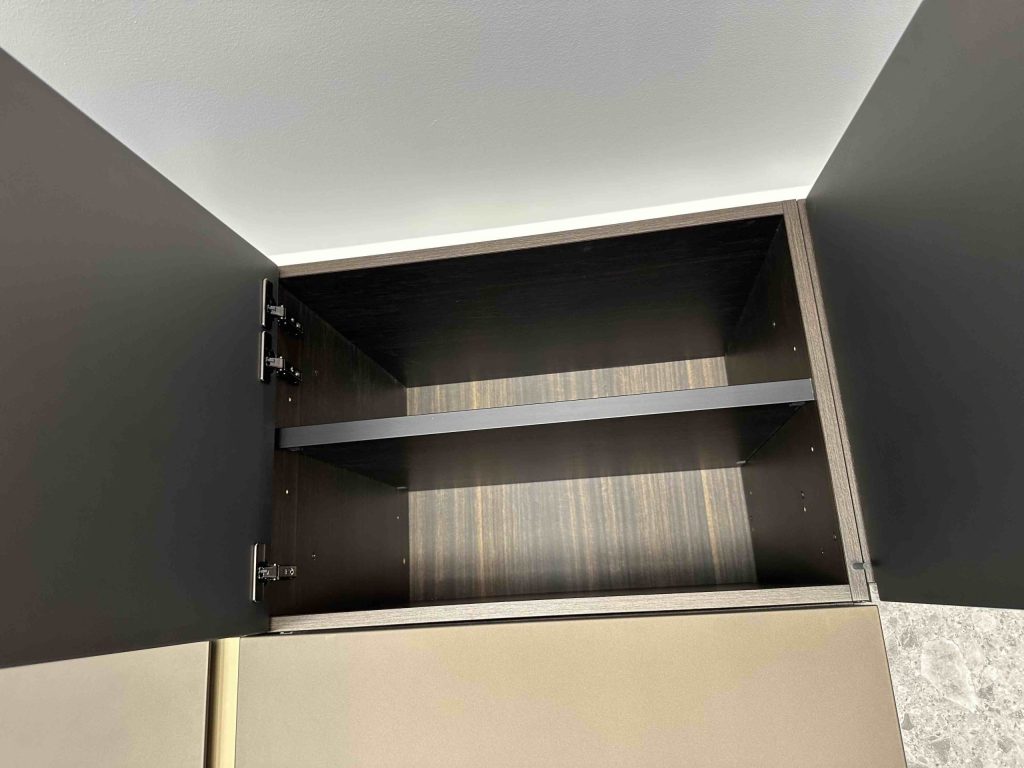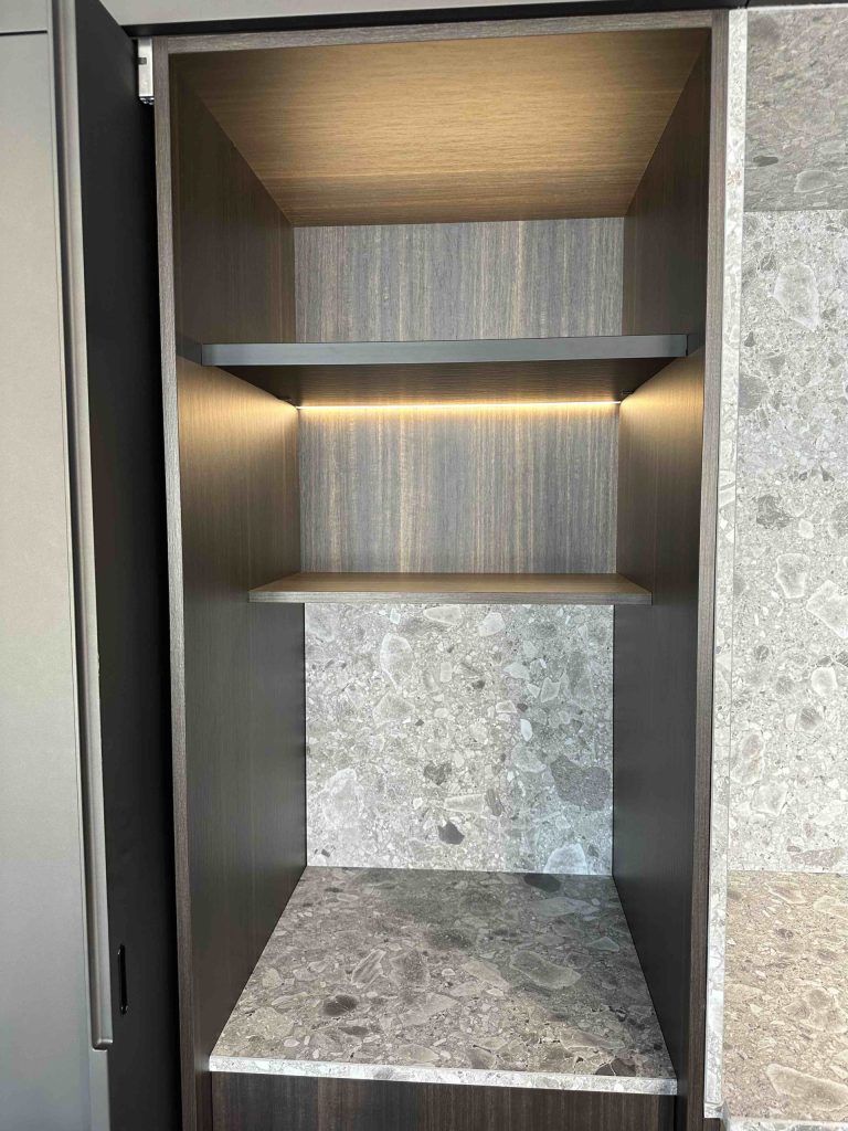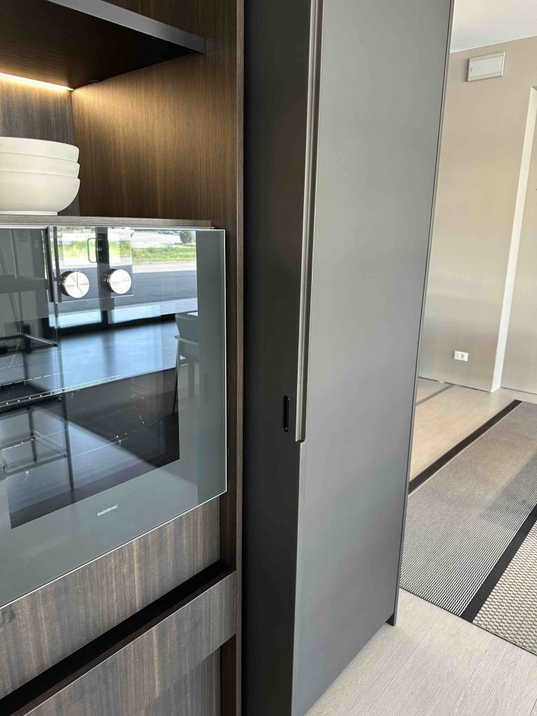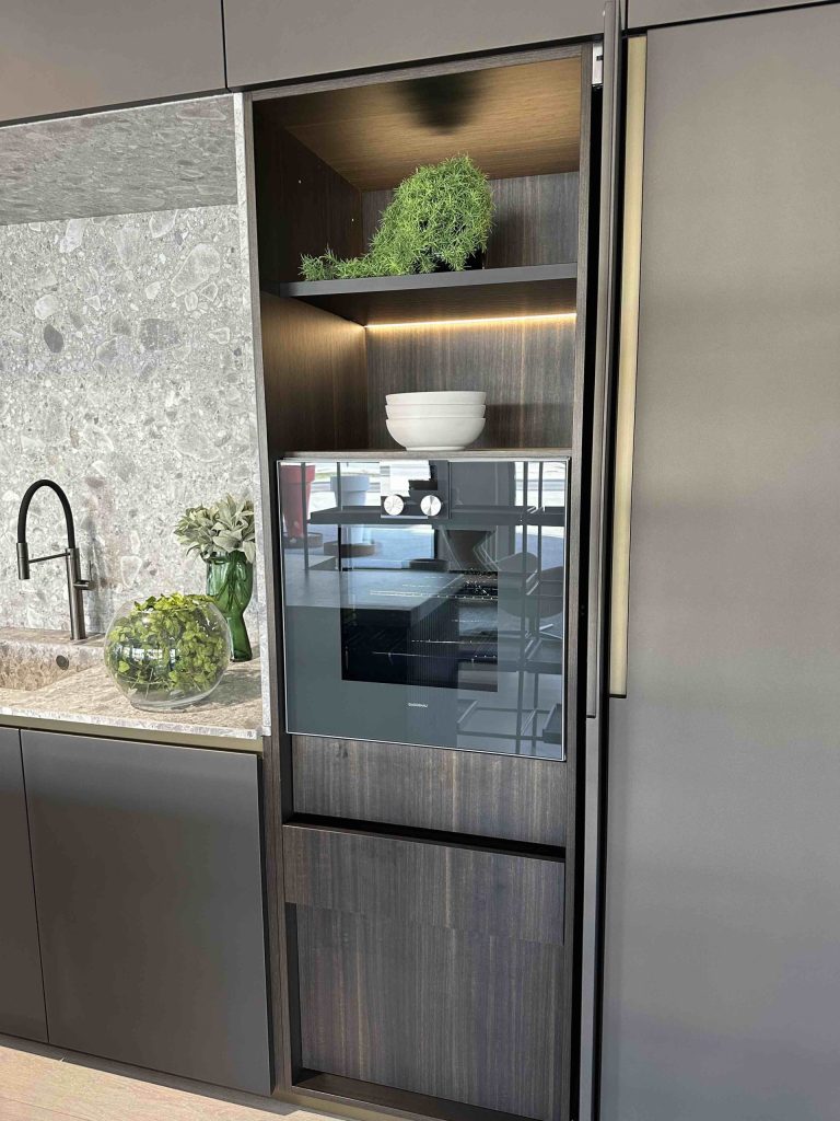 - Ante laccate: Finitura in Hibryd Bronzo Scuro e legno di eucalipto fumรจ dogato, che donano un look contemporaneo ed elegante.