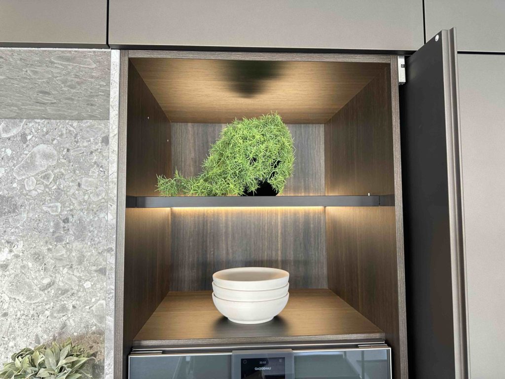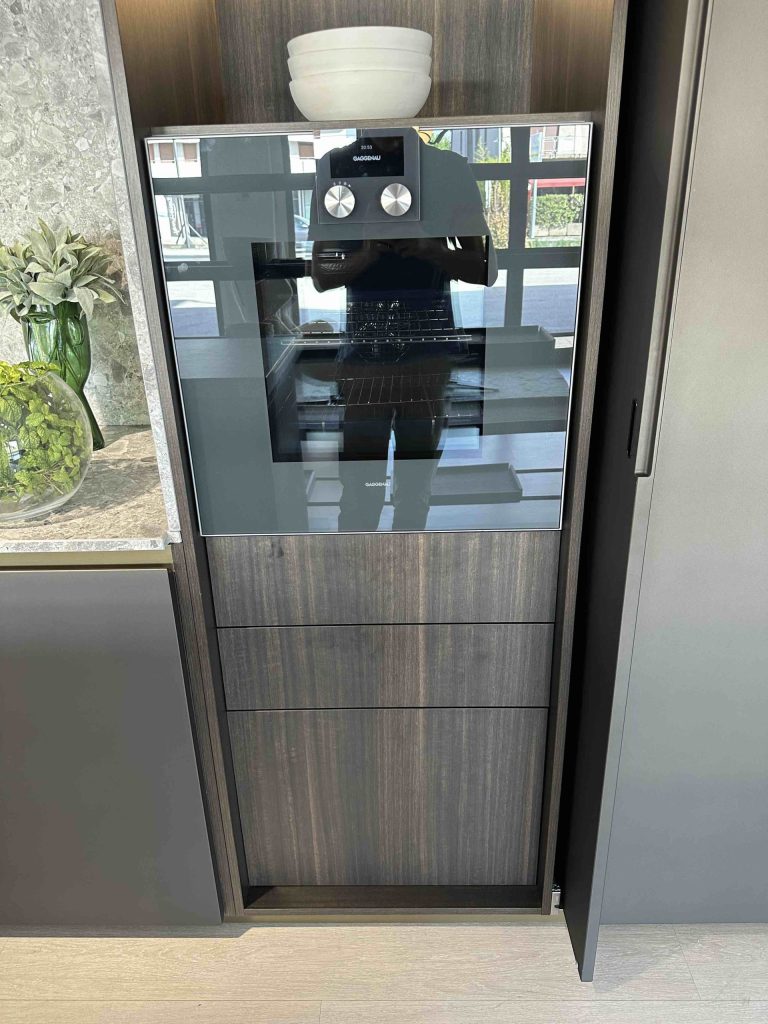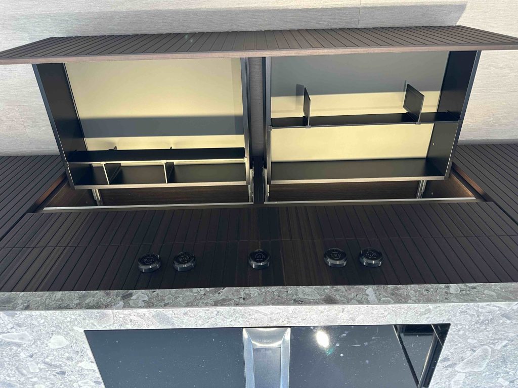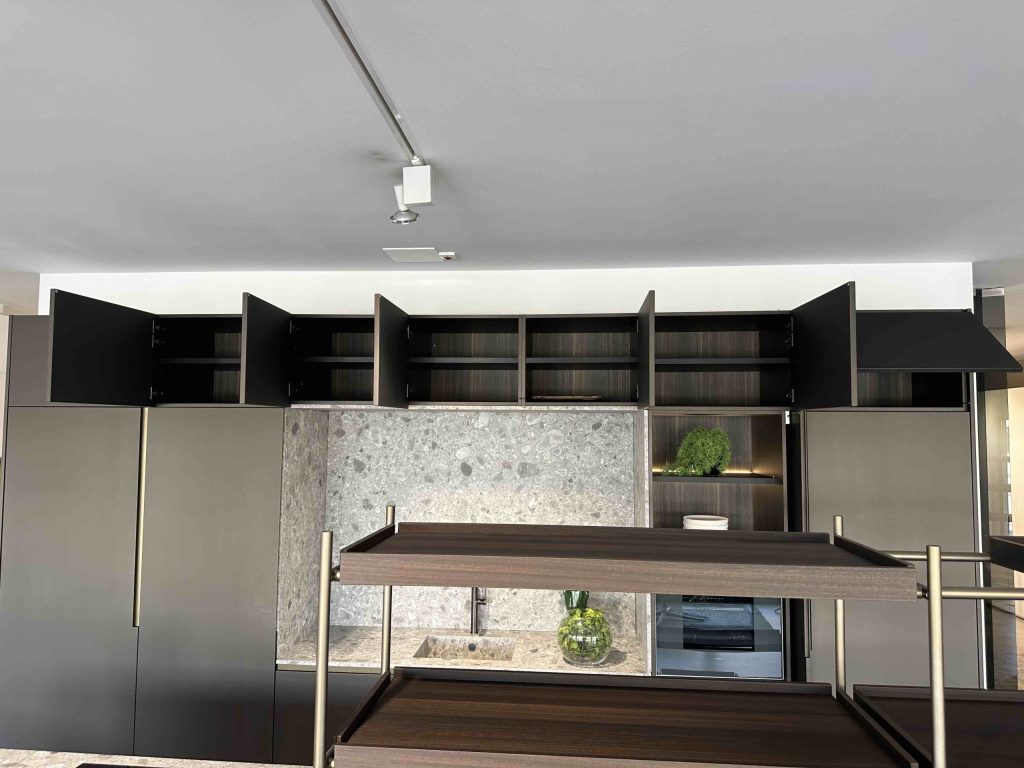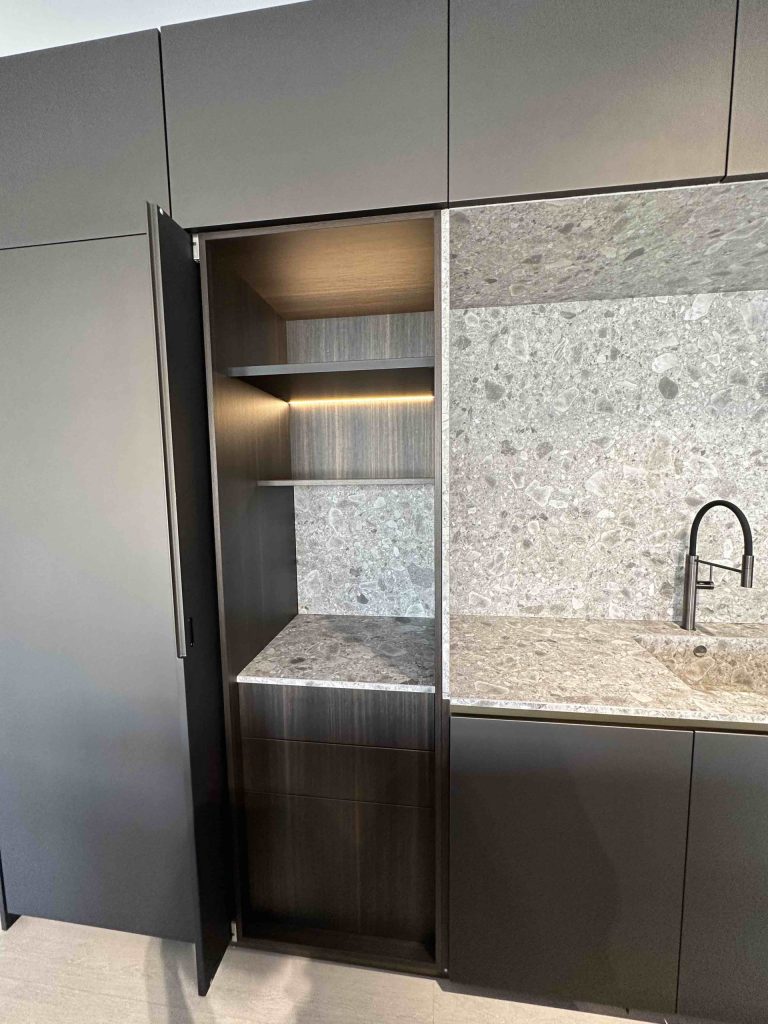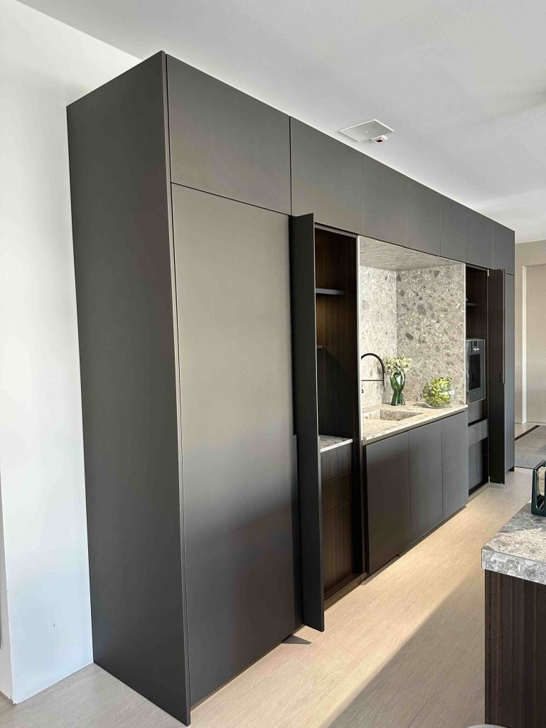- Ante laccate: Finitura in Hibryd Bronzo Scuro e legno di eucalipto fumรจ dogato, che donano un look contemporaneo ed elegante.