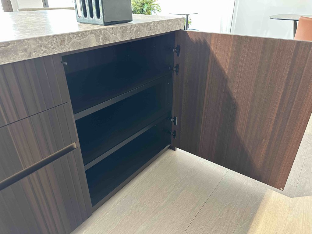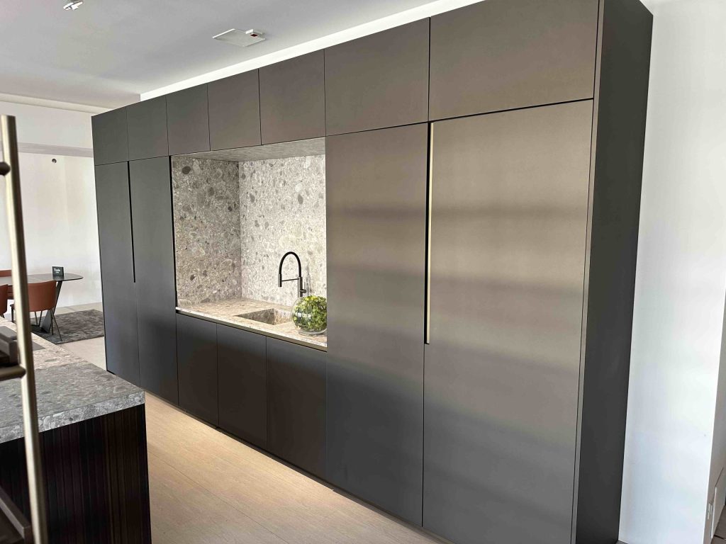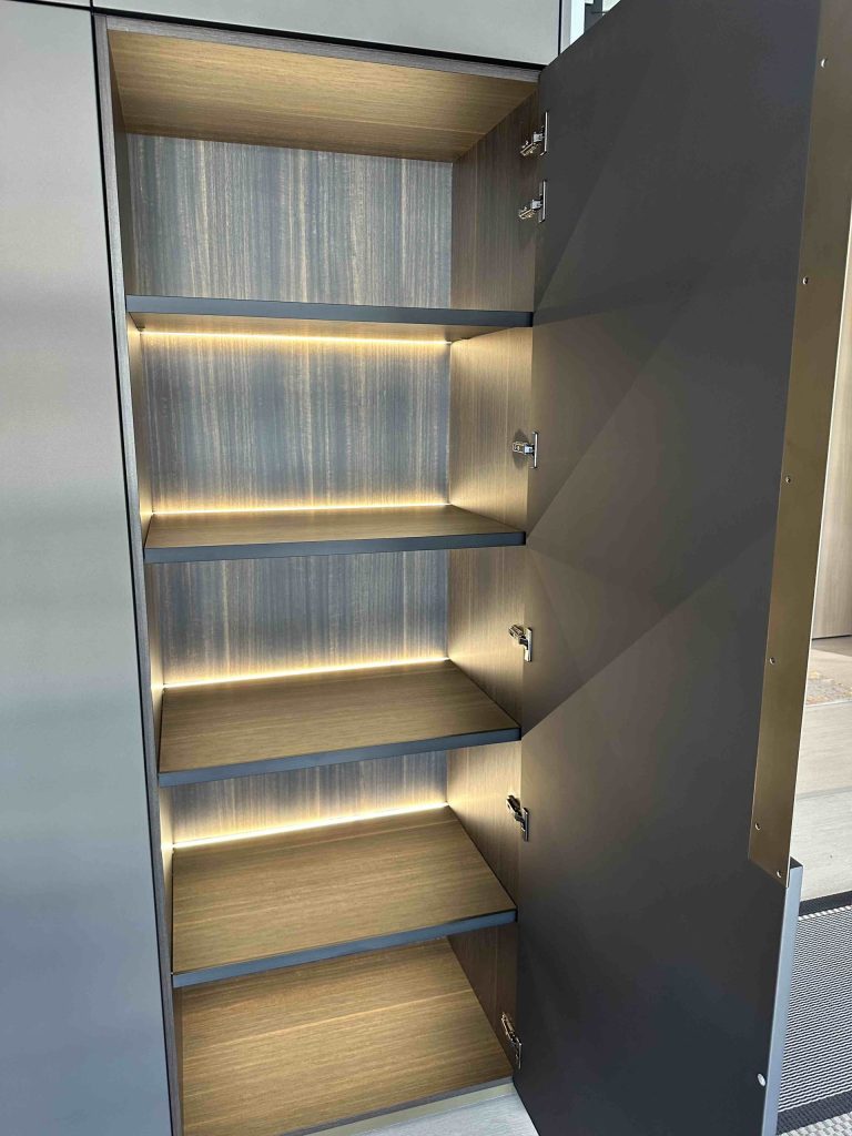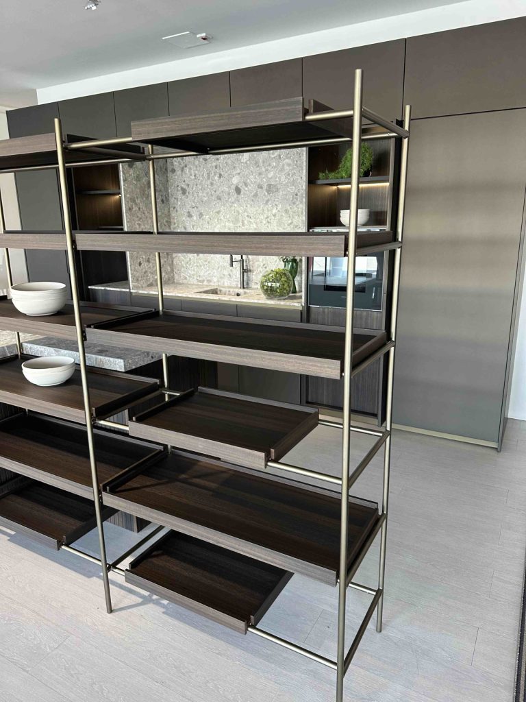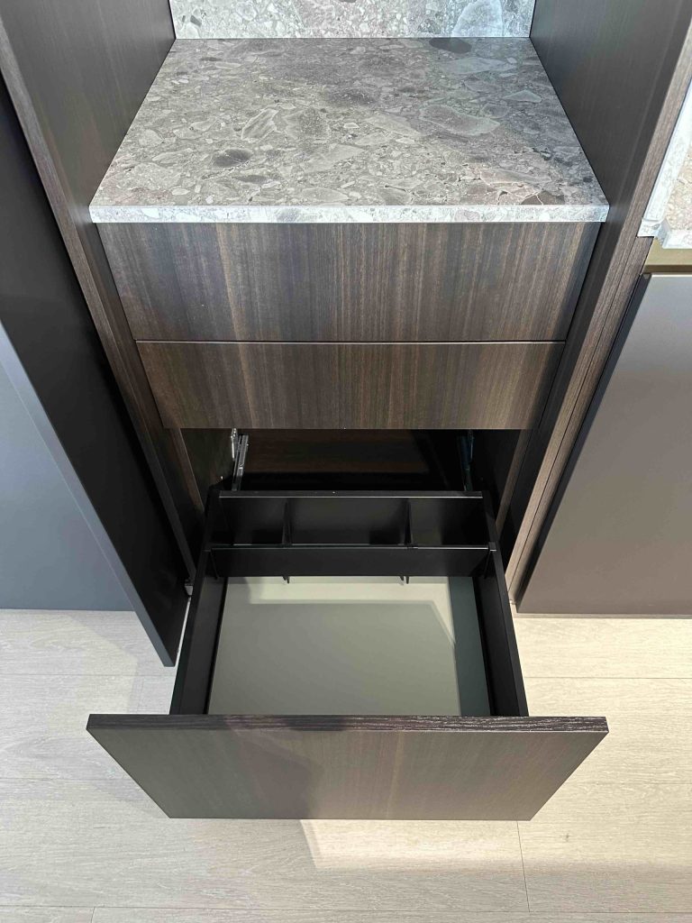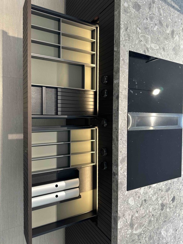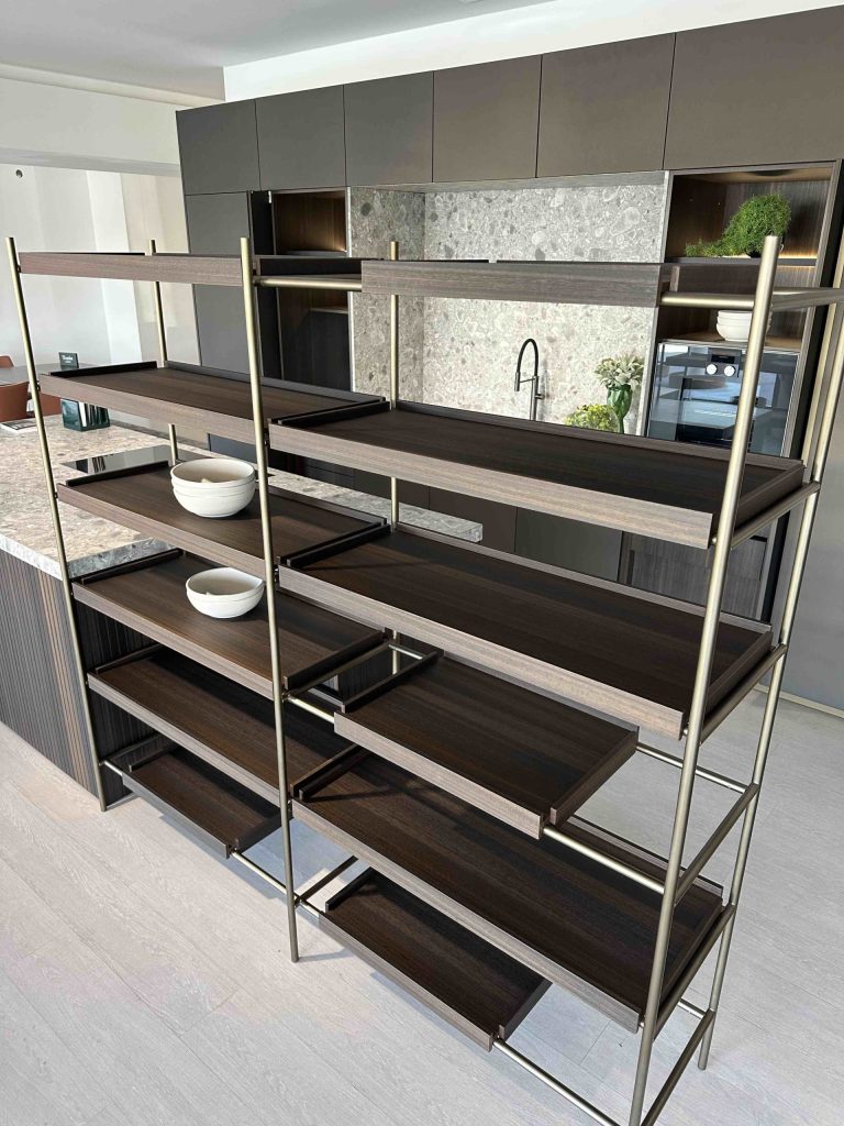 - Ante laccate: Finitura in Hibryd Bronzo Scuro e legno di eucalipto fumรจ dogato, che donano un look contemporaneo ed elegante.