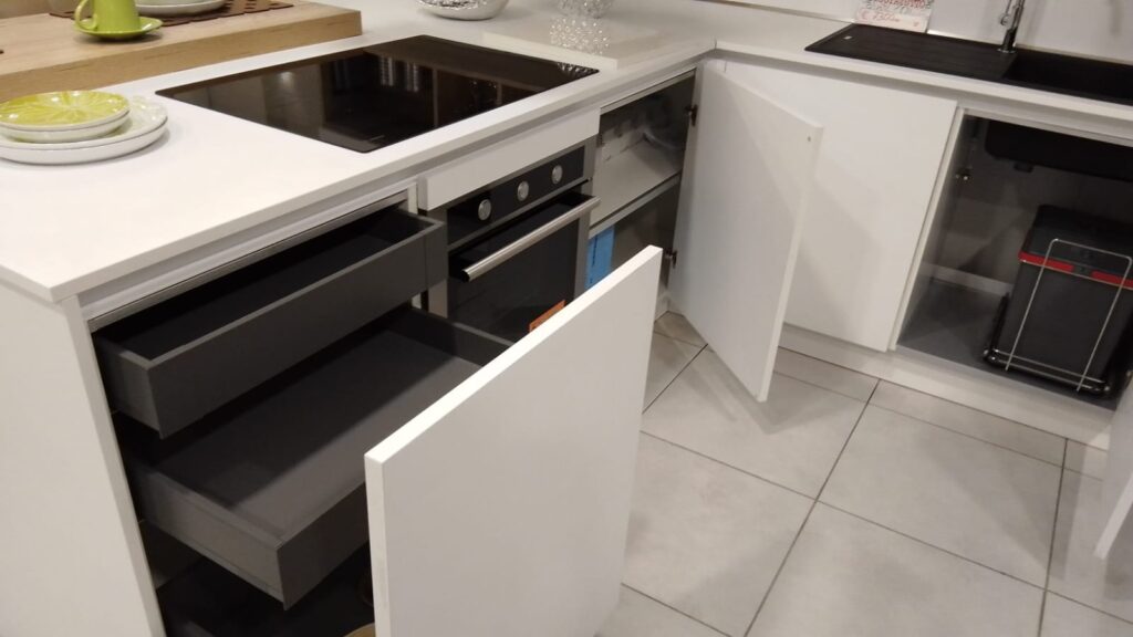La cucina Time 1 di Gentili Group si distingue per le sue linee pulite e moderne, combinate con materiali di alta qualitร . Il top cucina in laminato bianco offre una superficie resistente e facile da mantenere, mentre i dettagli in acciaio inox degli elettrodomestici ARISTON aggiungono un tocco di professionalitร  e stile.