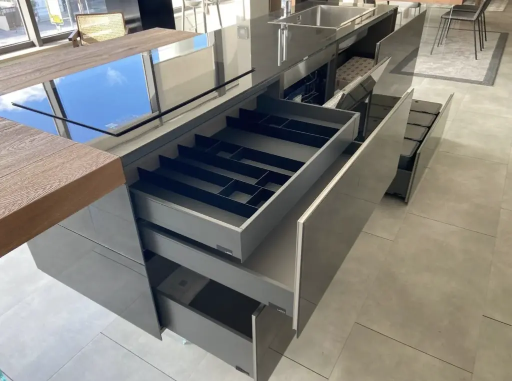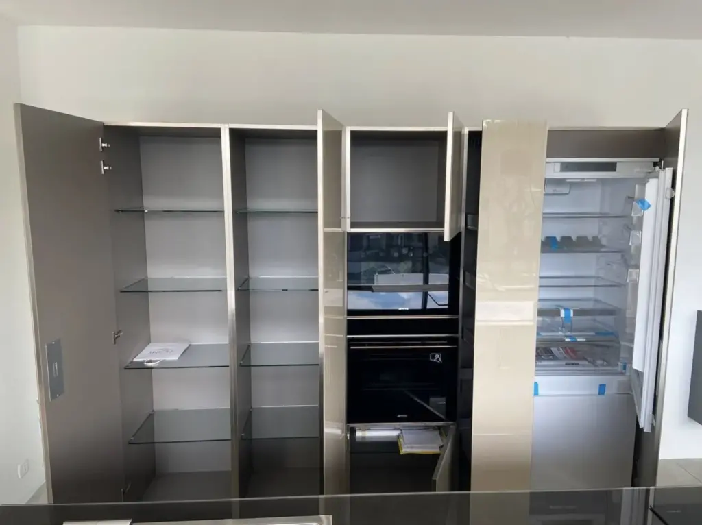 La cucina 36E8 di Lago si distingue per il suo design pulito e contemporaneo. Le finiture in vetro lucido spago e xglass lucido peltro offrono una combinazione di eleganza e modernitร , mentre il piano snack in Wildwood naturale aggiunge un tocco di calore.