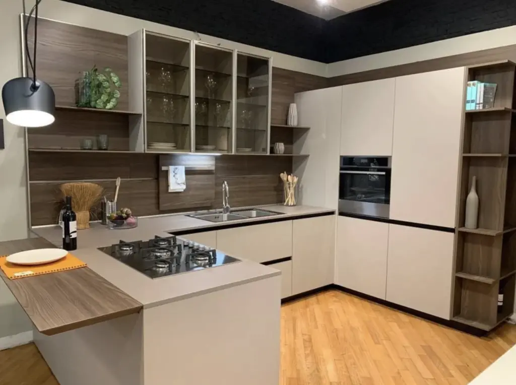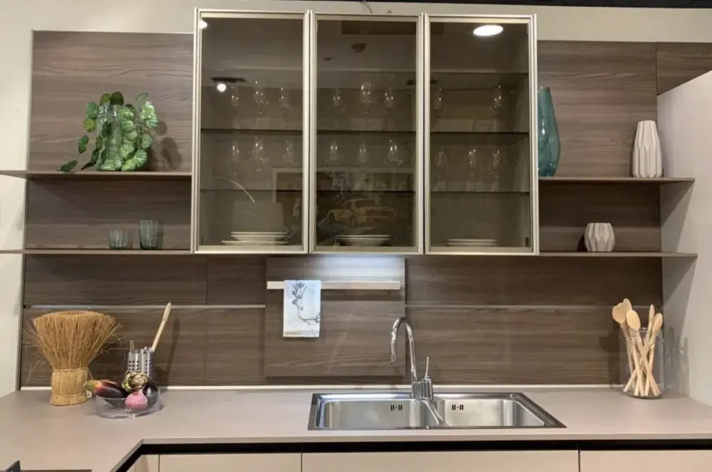 I pannelli boiserie in olmo cortex NT aggiungono un tocco di naturalezza e calore, bilanciando la modernitร del design con una texture accogliente. Il fusto in selce garantisce robustezza e durabilitร , assicurando che la cucina resista all'uso quotidiano.