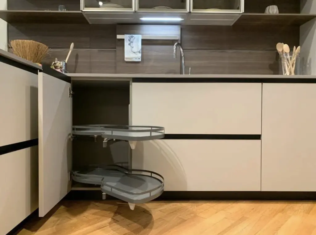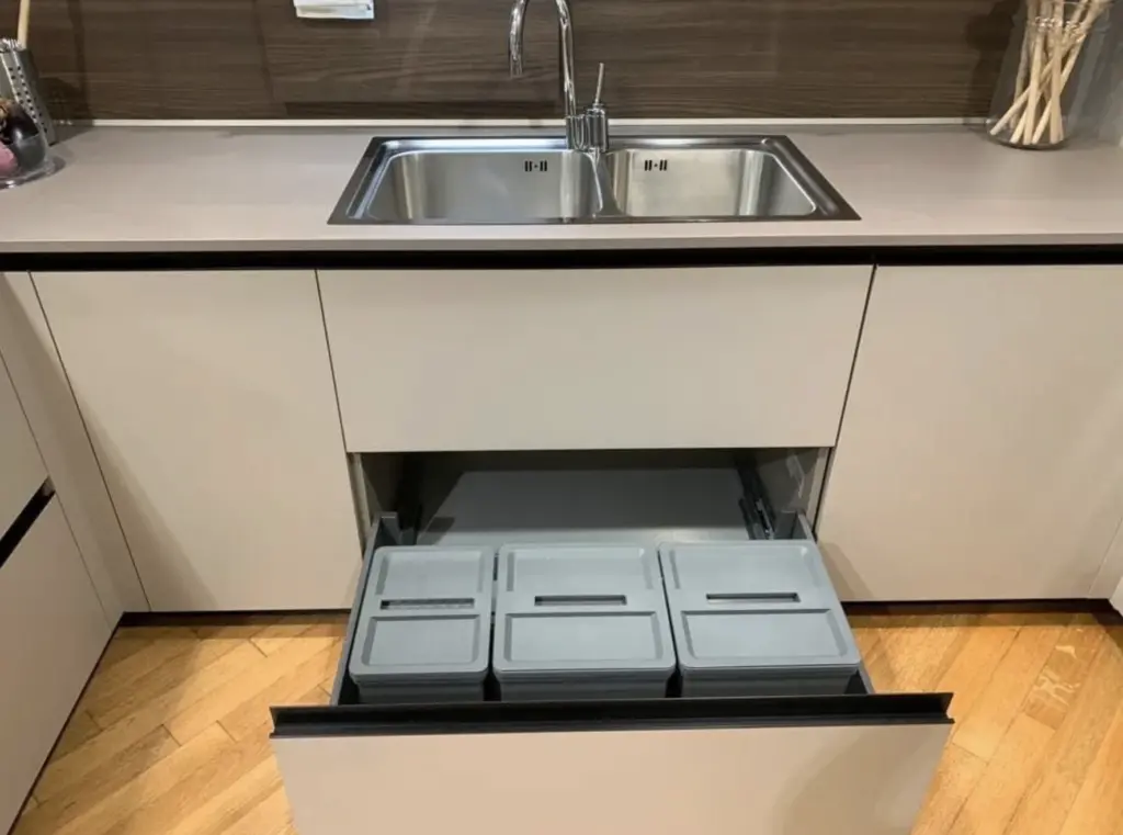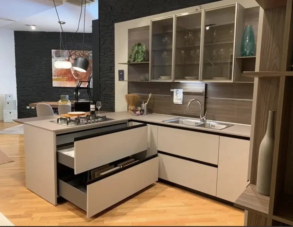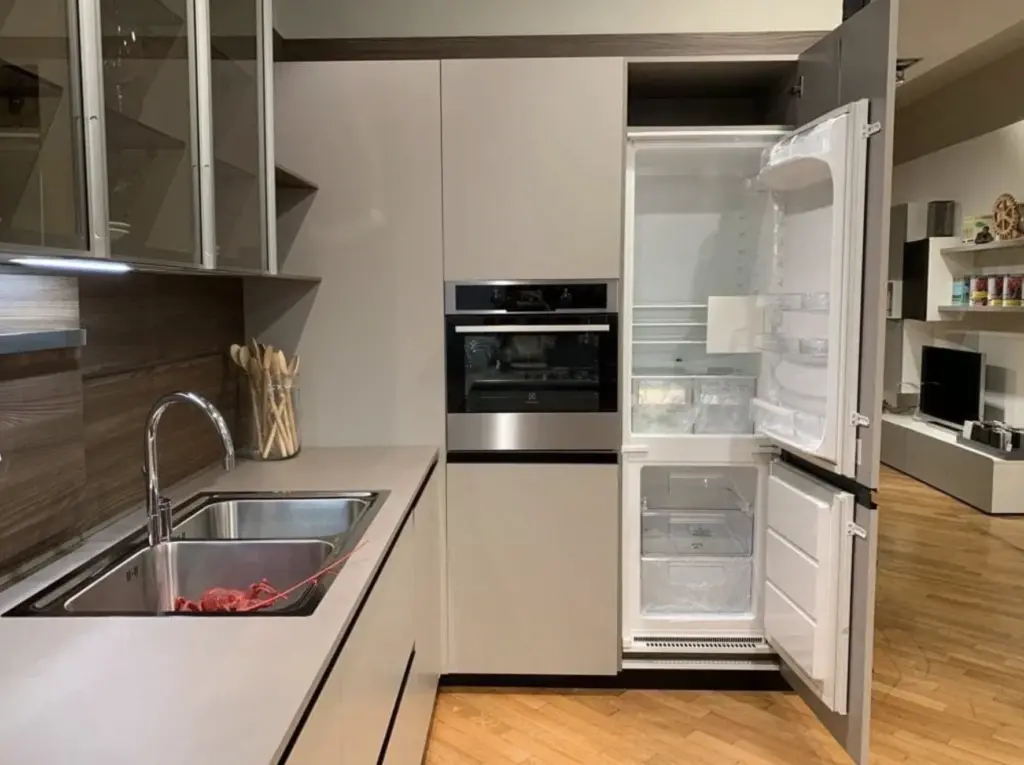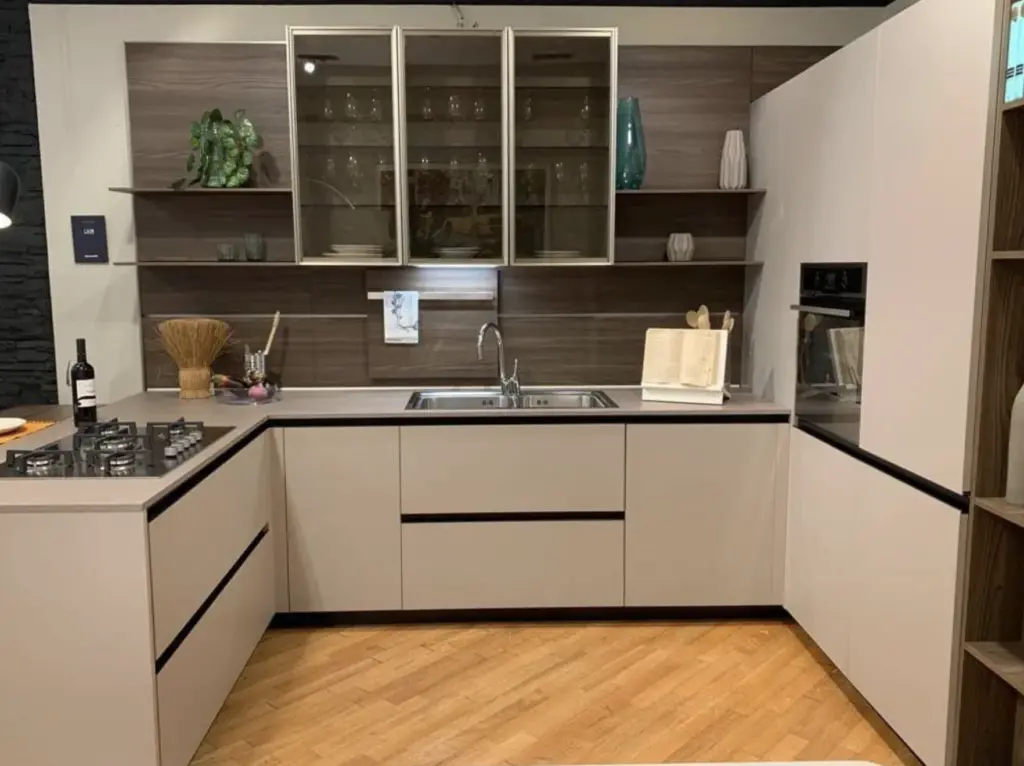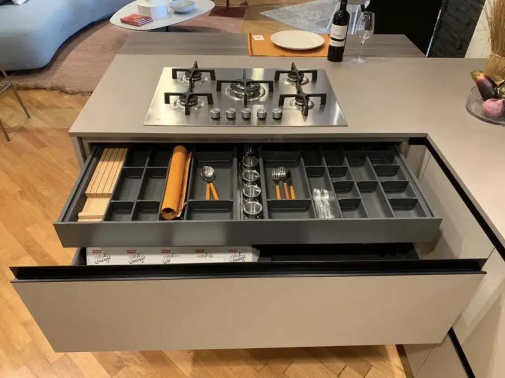 La cucina Lain Pro di Euromobil รจ progettata per offrire il massimo della funzionalitร senza rinunciare allo stile. Il top in laminato Unicolor Malta smoke รจ resistente e facile da pulire, mentre i frontali Lain Matt Talco donano un aspetto fresco e contemporaneo. Lo zoccolo e le maniglie laccate nero assoluto creano un contrasto elegante con il resto della cucina.