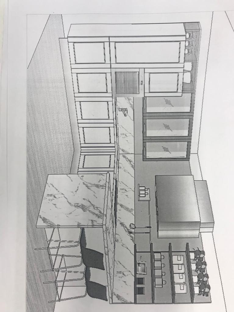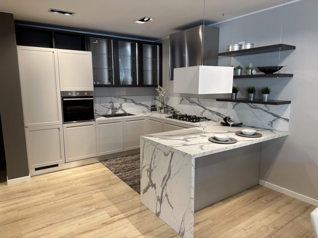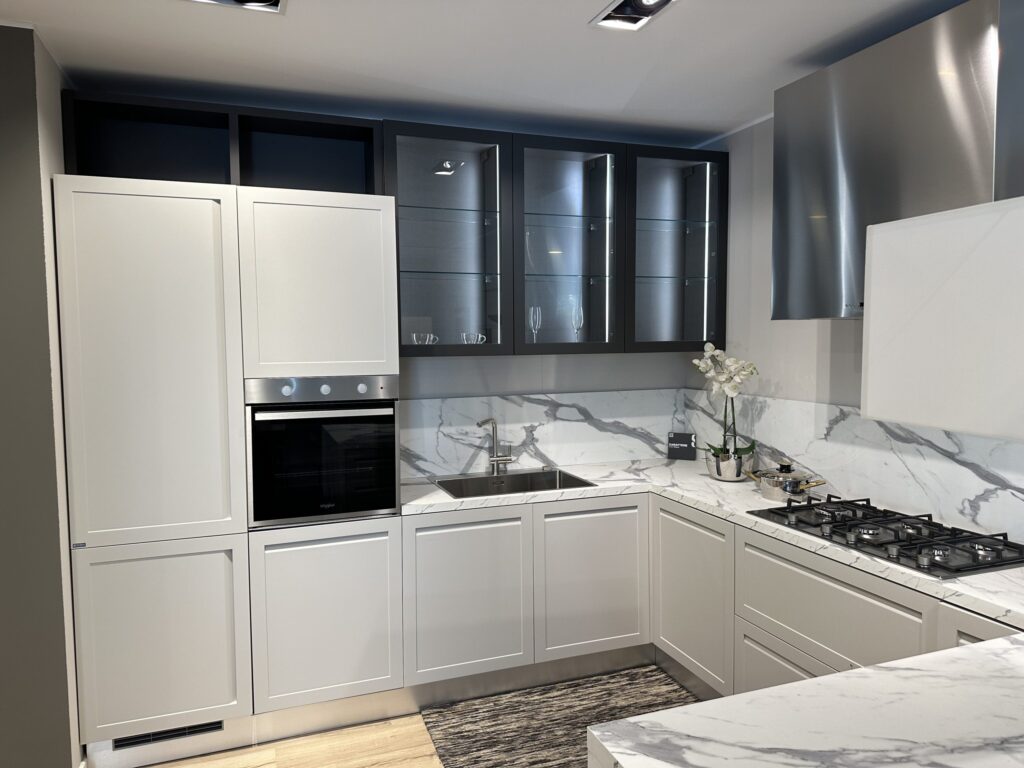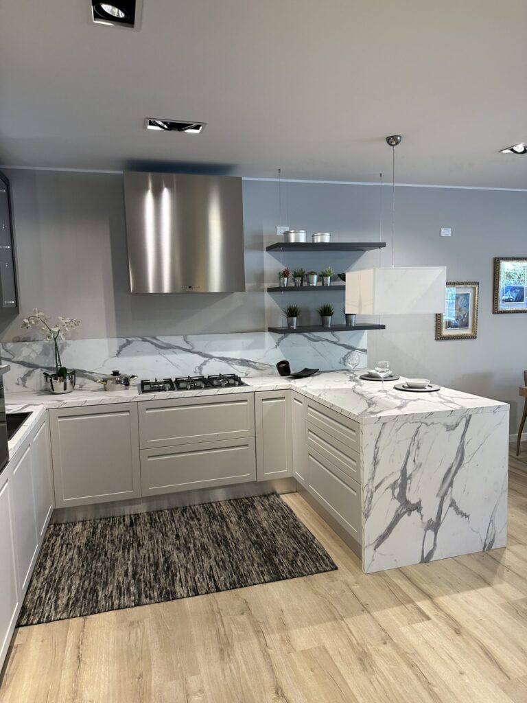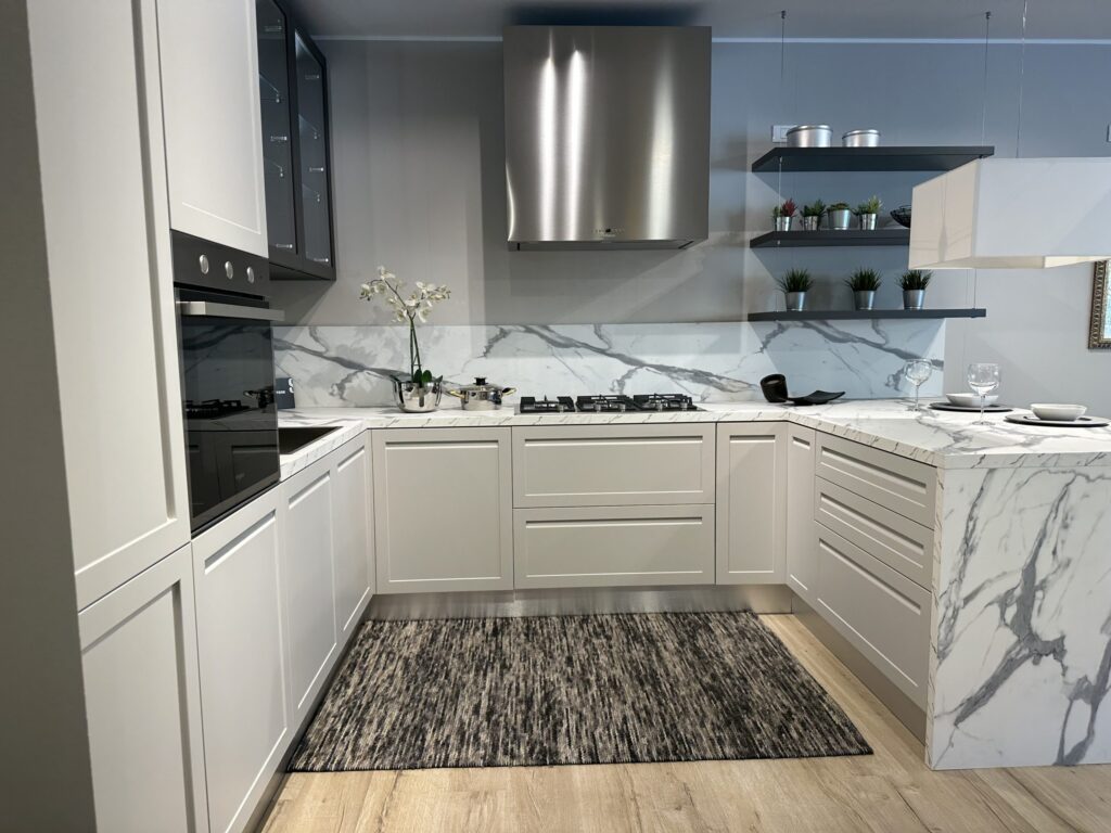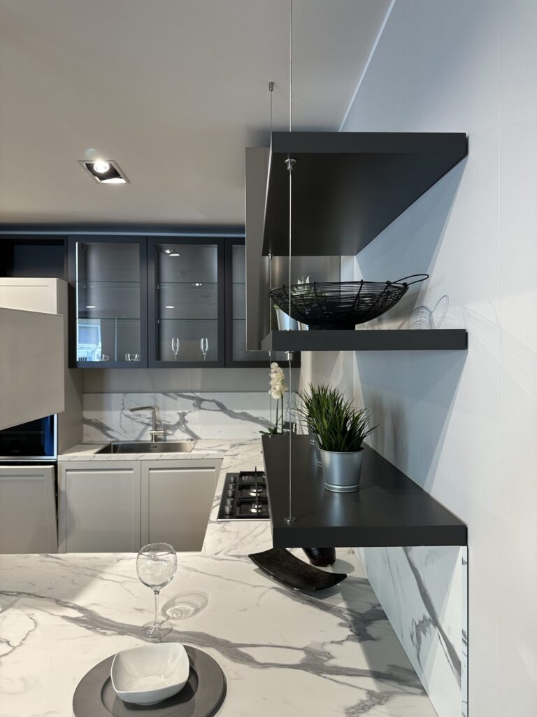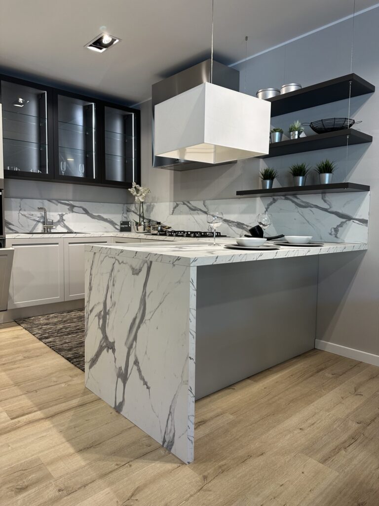 - Top e alzate: Laminato bianco statuario, resistente e di grande impatto visivo.