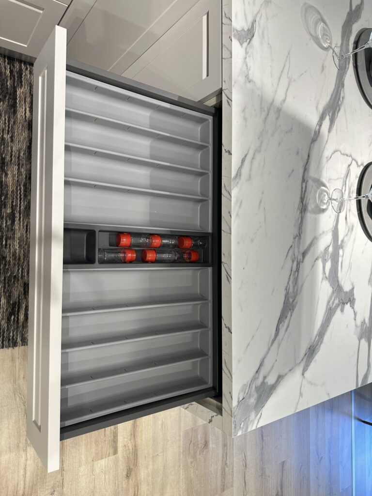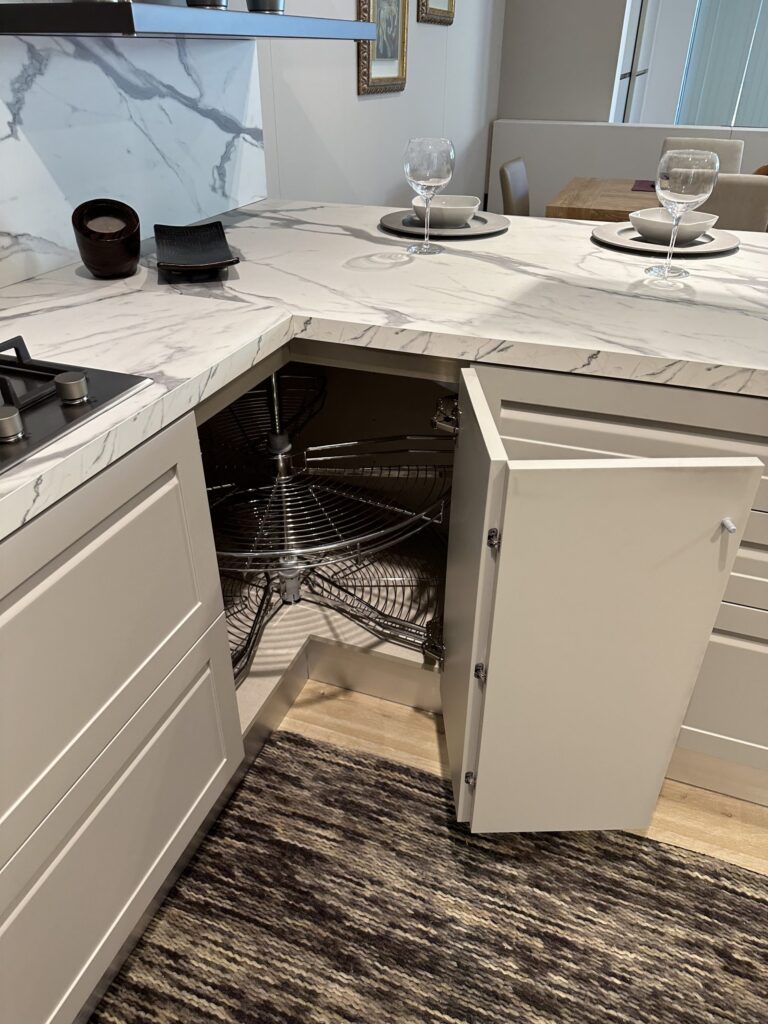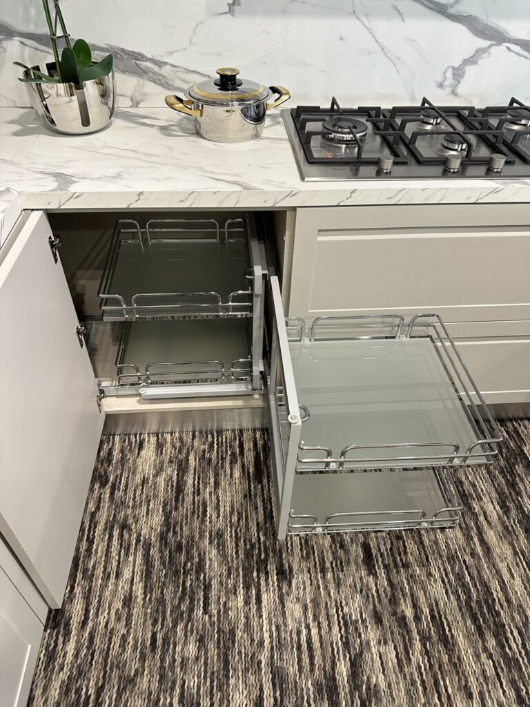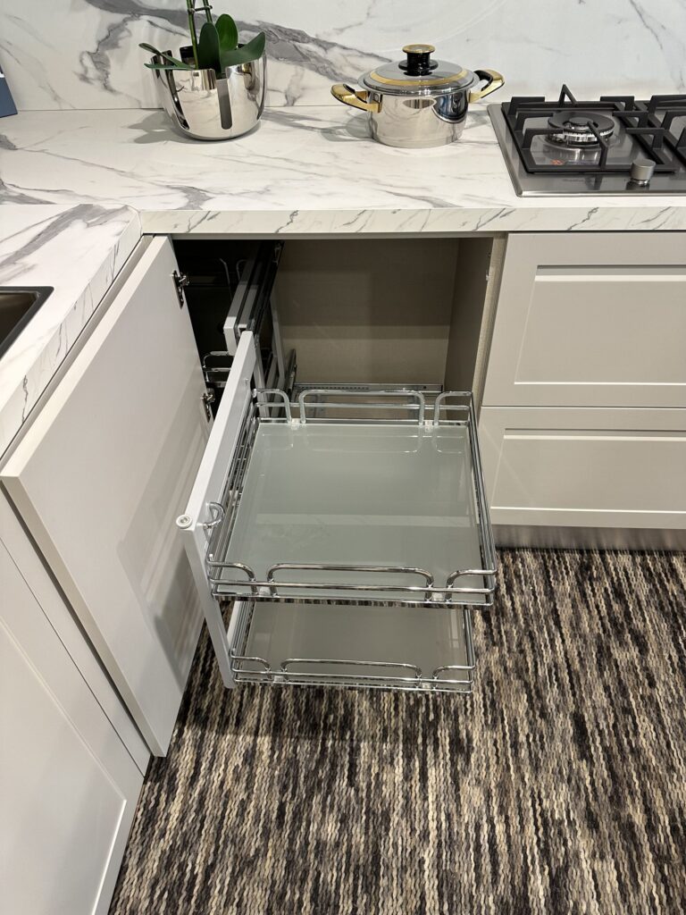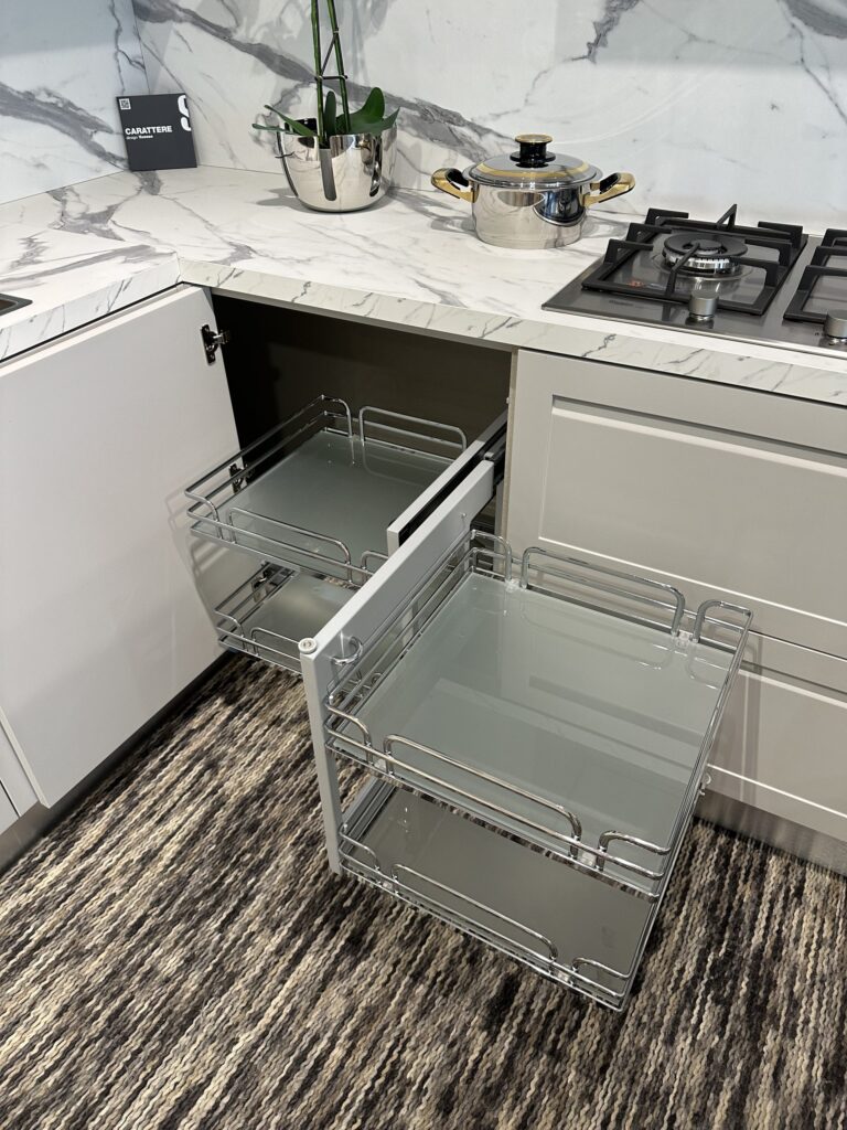 - Meccanismo angolare con carrelli estraibili da 120 cm.