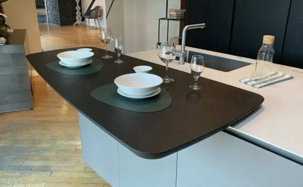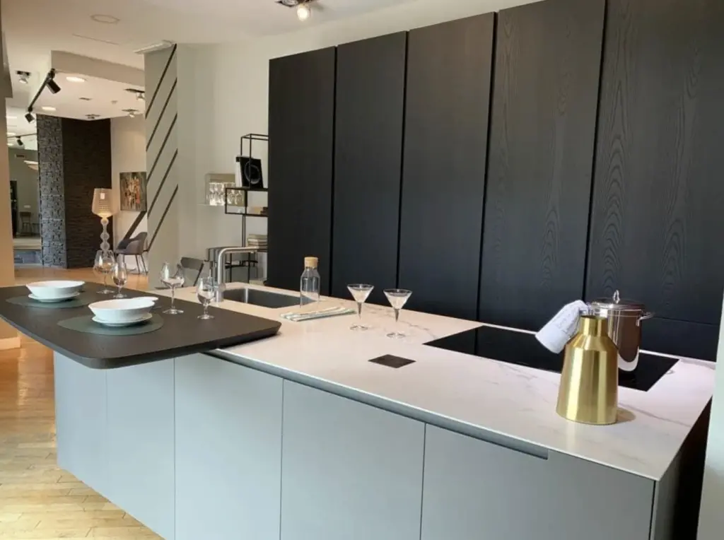 - Top: MDi Calacatta Oro Touch con presa quadra su piano in alluminio nero a scomparsa