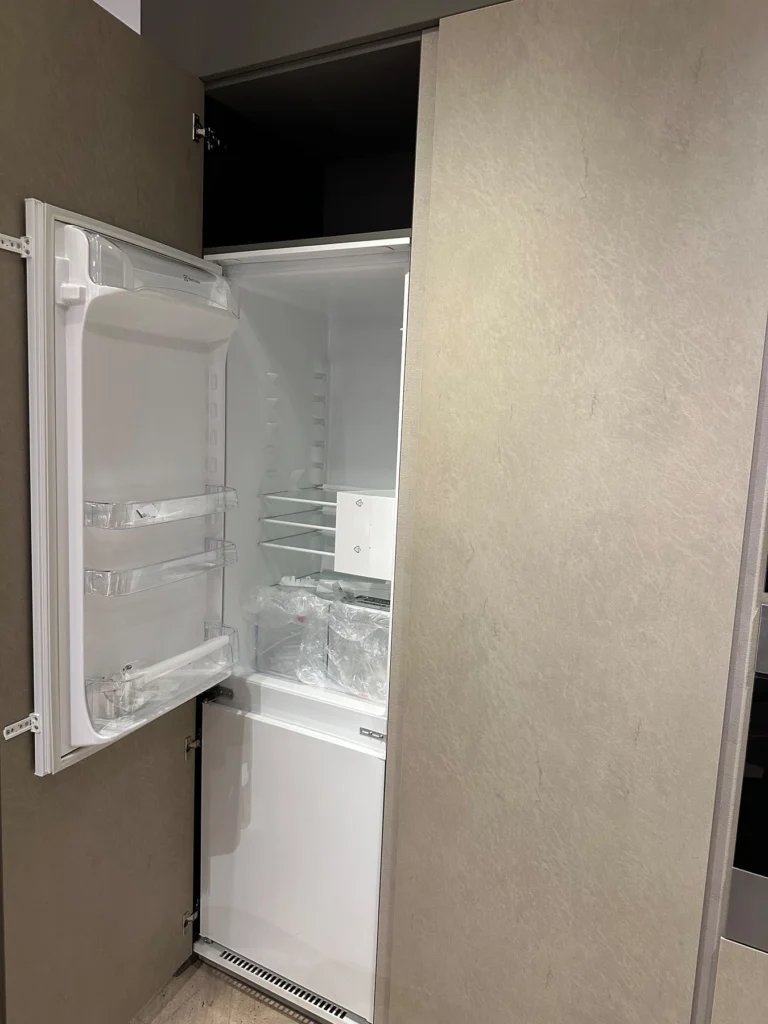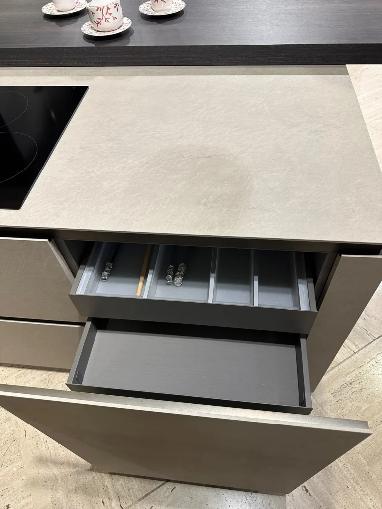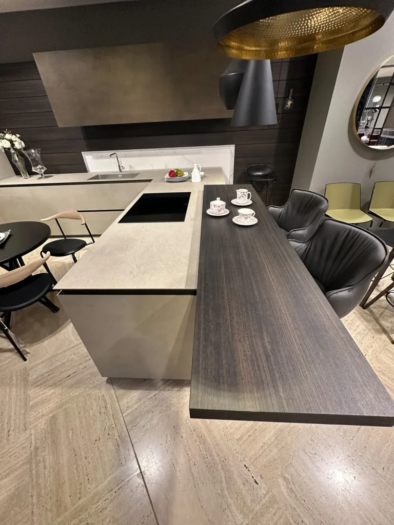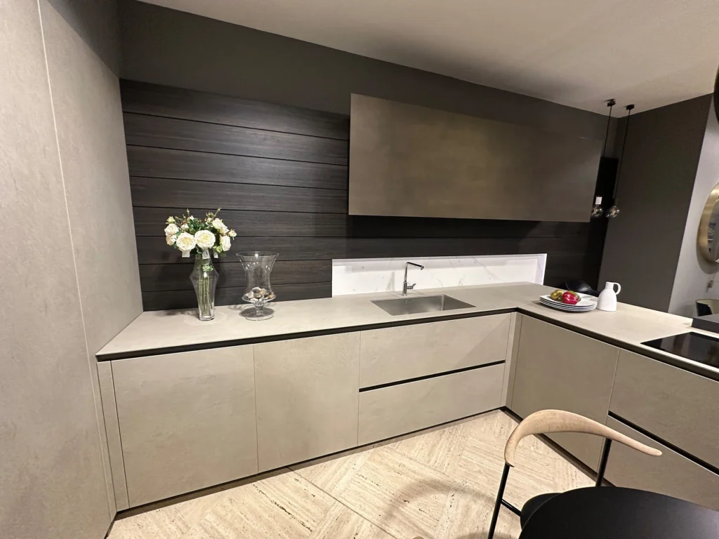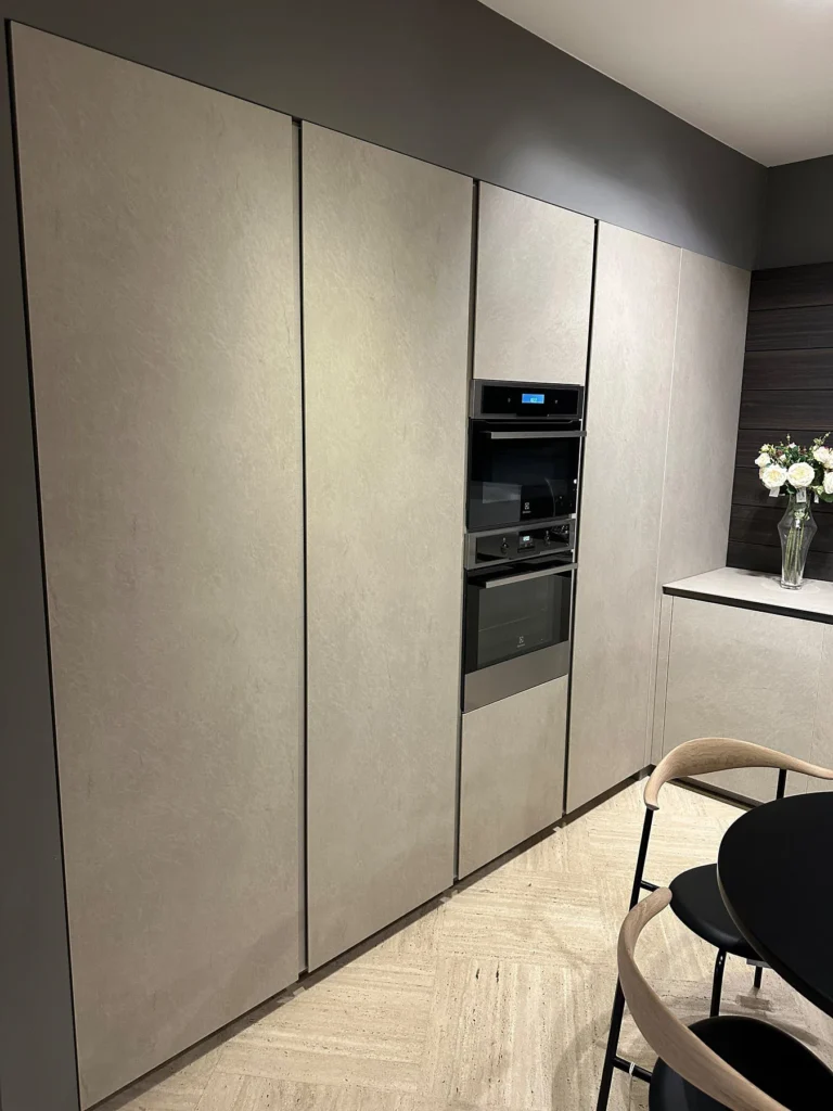 Skill, in finitura miltek argilla con dettagli in boiserie eucalipto e top in gres calacatta, si distingue per il suo design minimalista ed elegante. Il profilo delle ante e del top, di soli 6 mm, conferisce unโestetica essenziale, mentre le colonne doppie con ante rientranti nascondono con discrezione i forni e la zona di lavoro, creando un dinamico gioco di pieni e vuoti. Le barre LED incluse, installate sia allโinterno che allโesterno della cucina, possono essere gestite con sensori volumetrici o tramite interruttore, per garantire unโilluminazione funzionale e suggestiva in ogni situazione.