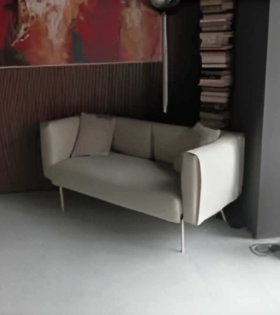 - Struttura: La struttura del divano รจ snella e leggera, composta da una base metallica che sostiene i cuscini, i quali sono posizionati su una struttura esile in metallo. Le gambe posteriori sono caratterizzate da un'inclinazione particolare, che conferisce al divano una leggerezza visiva, pur mantenendo una solida stabilitร .