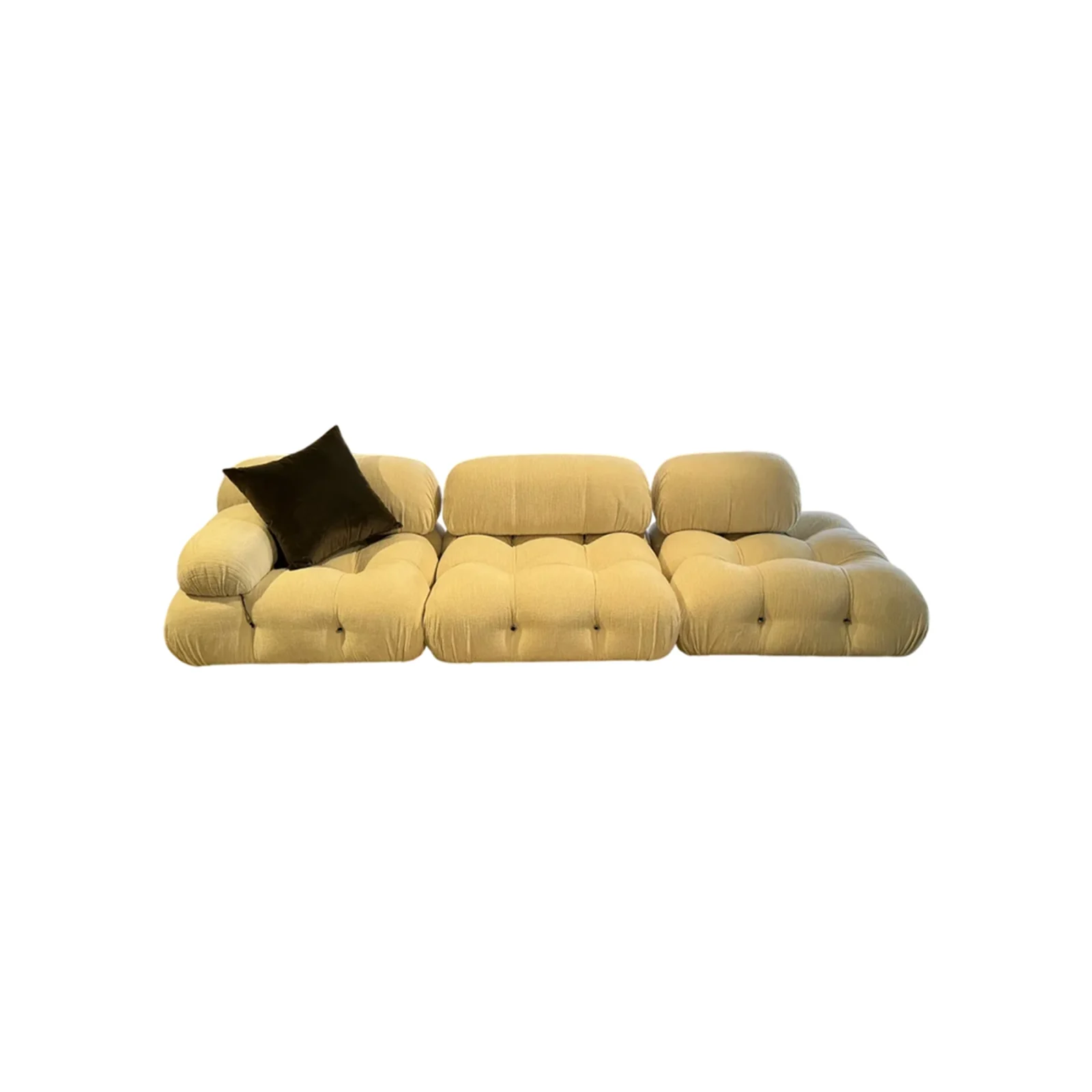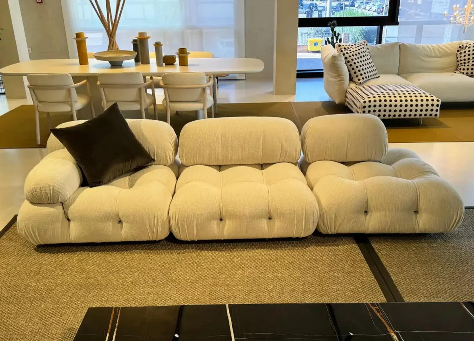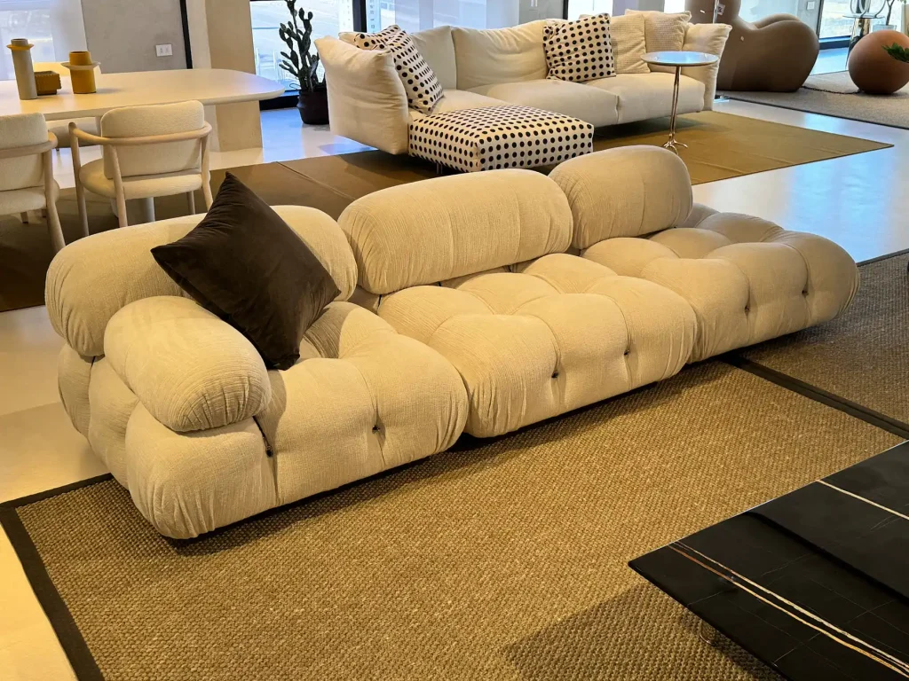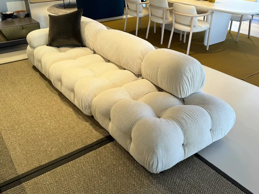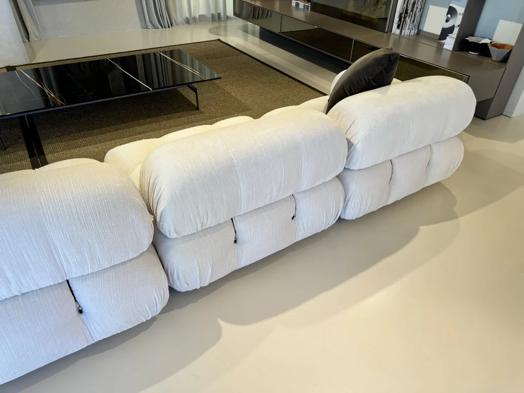 Il divano modulare Camaleonda, progettato dal celebre designer Mario Bellini nel 1972 per B&B Italia, รจ unโicona senza tempo del design contemporaneo. Composto da 4 sedute modulari grandi con schienale eย 3 sedute modulari piccole con schienale,ย questo divano offre una combinazione infinita di configurazioni grazie al suo sistema innovativo di anelli e tiranti.ย Questo dettaglio permette di scomporre e riassemblare i moduli con facilitร , dando vita a soluzioni personalizzate in linea con qualsiasi esigenza abitativa. Il rivestimento รจ in lana bouclรฉ bianca, un materiale di alta qualitร che aggiunge morbidezza e una sensazione di lusso, mentre il colore neutro e luminoso lo rende adatto a ogni ambiente. Il divano Camaleonda presente in offerta expo nel nostro showroom presenta una composizione lineare di tre elementi, perfetti per creare un angolo accogliente o uno spazio versatile per il relax o lโintrattenimento. La struttura รจ impreziosita da piedini in faggio naturale, che aggiungono calore e una nota organica al design sofisticato.