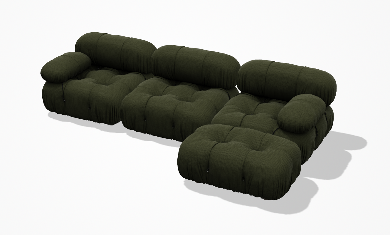 Questa configurazione รจ composta da tre moduli da 96ร96ร67 cm, rivestiti in tessuto Enia Verde Oliva 400, con piedini in faggio naturale e dettagli metallici cromati lucidi, che esaltano il contrasto tra matericitร e luce.