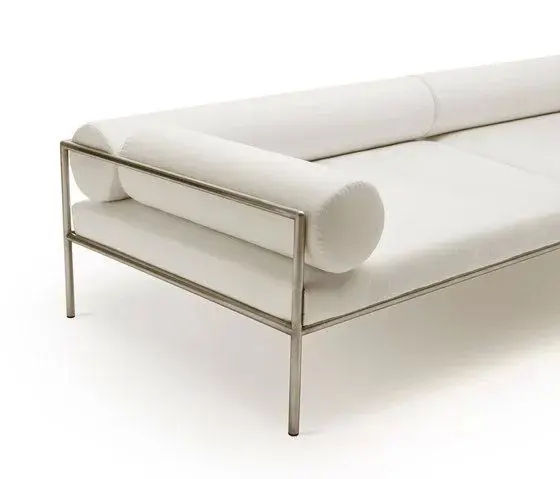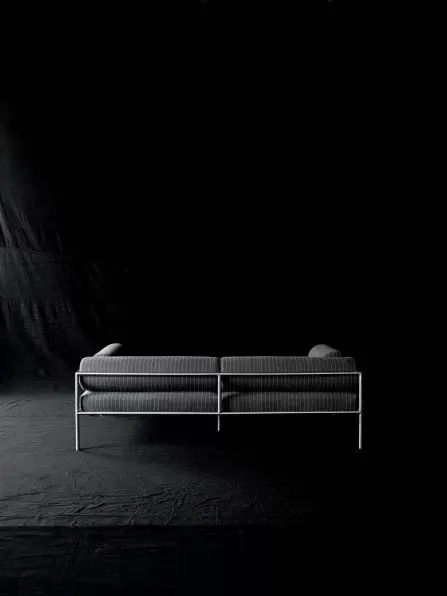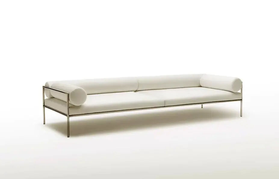 Le linee compatte e il design pulito definiscono i cuscini a rullo che compongono schienale e braccioli. Di conseguenza, la seduta risulta accogliente ma visivamente leggera. Inoltre, le proporzioni ben calibrate rendono il divano ideale per terrazze, giardini e spazi esterni raffinati, mantenendo una forte coerenza stilistica.