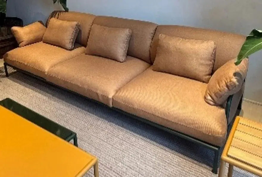 Il divano Roè a tre posti è rivestito in tessuto Range 3 Mojito Caramello, una scelta cromatica calda e accogliente, perfetta per valorizzare gli spazi all’aperto. La seduta è completata da un set di cuscini sfoderabili che migliora il comfort e rende il divano pratico nell’uso quotidiano.
