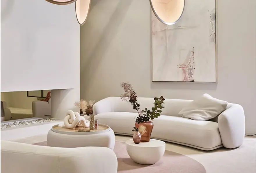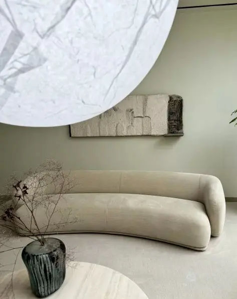 Lo schienale si estende lateralmente, trasformandosi in braccioli integrati che si piegano delicatamente verso l’interno. In questo modo, il divano definisce una forma avvolgente e ospitalitaria. Questo tratto progettuale rafforza l’identità del modello Renè e ne sottolinea il carattere scultoreo.