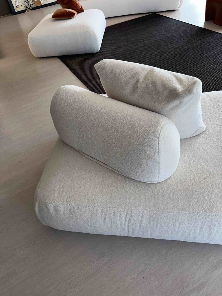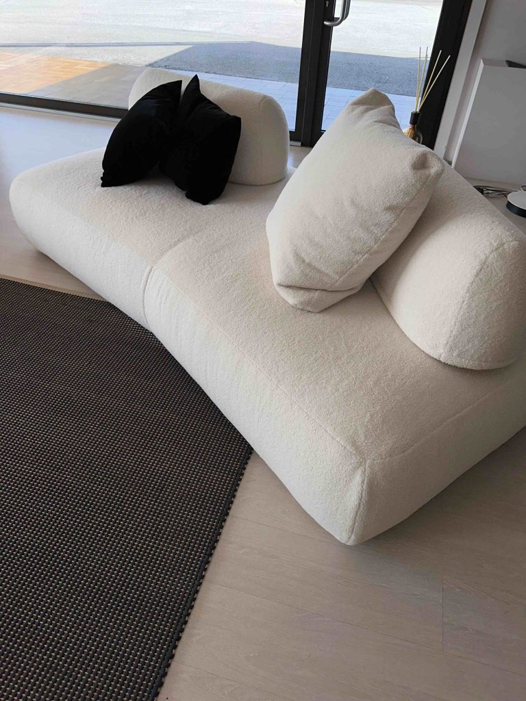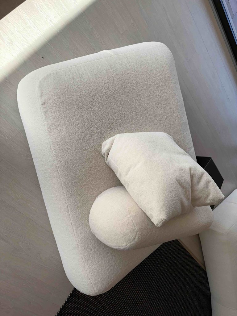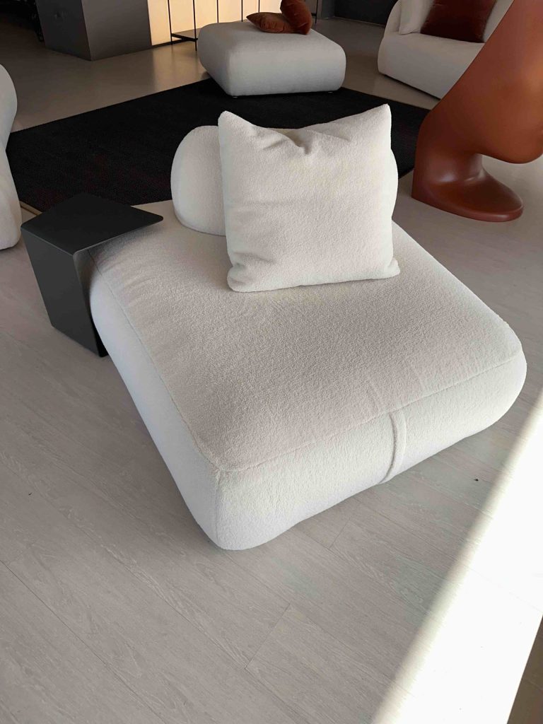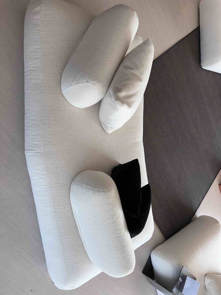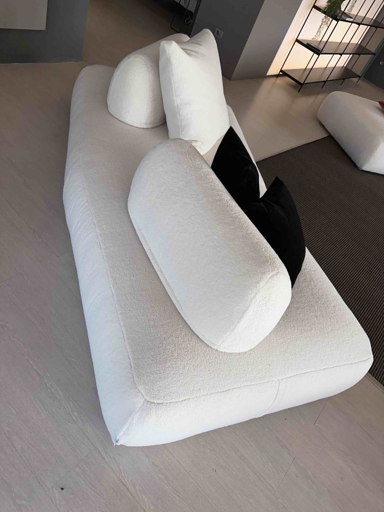 Il divano Grecale della collezione Il Giorno di Fox รจ un perfetto esempio di design moderno ed elegante, dove il fascino delle forme morbide e curve si combina con la praticitร del comfort. Con una base semicurva e una base trapezoidale rivestita in tessuto teddy 19 avorio, il divano offre un'esperienza visiva unica. Gli schienali trapezoidali e i cuscini a sacchetto aggiungono un ulteriore livello di comfort e di eleganza al design complessivo. Questo divano rappresenta unโidea di stile fresco e ricercato, ma allo stesso tempo chic e essential.